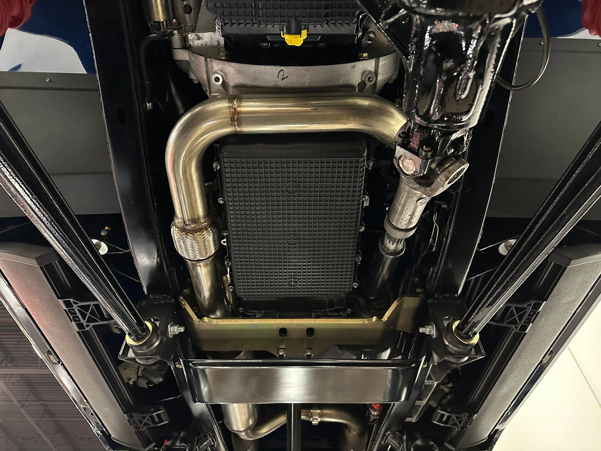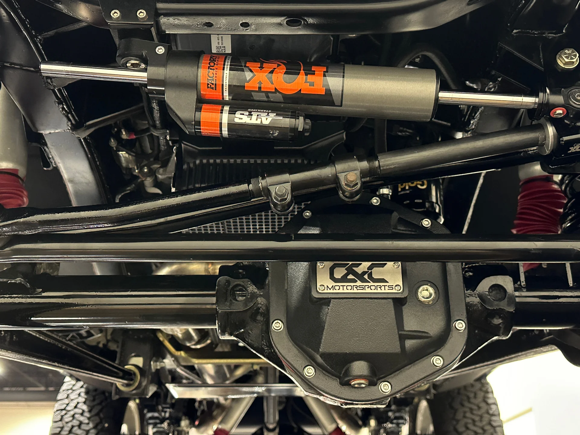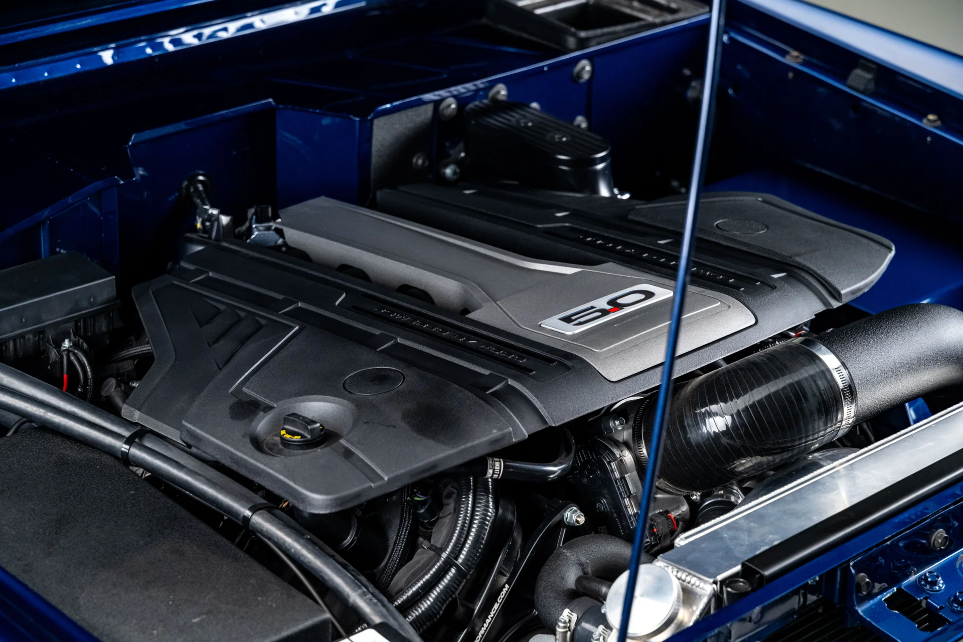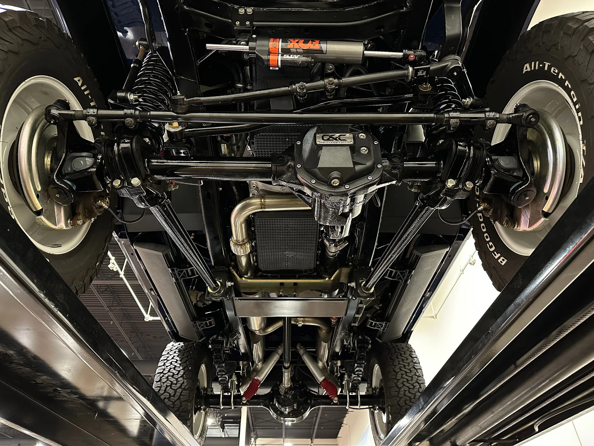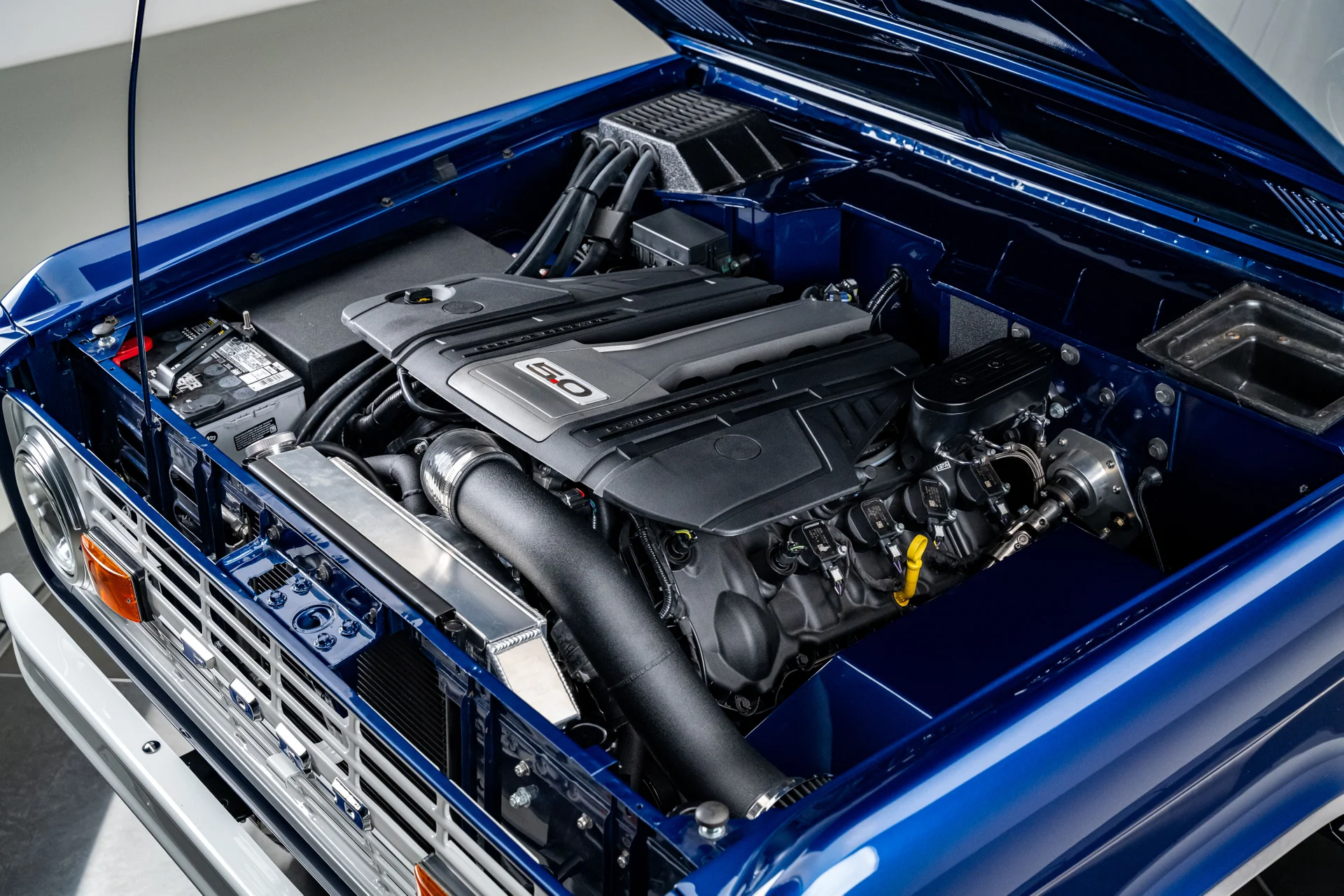 Sob o capô, a carroceria clássica combina com um conjunto mecânico de última geração. A Highline Classics instalou um motor V8 Coyote de 5.0 litros de terceira geração em 2024, acoplando-o à transmissão automática de dez velocidades 10R80 da Ford. Essa combinação proporciona uma dirigibilidade suave e moderna, além da potência descomplicada que os primeiros Broncos nunca ofereceram. O motor aspira ar por meio de uma entrada de ar frio personalizada e expele os gases através de coletores de escape Ultimate em aço inoxidável e um sistema de escapamento Borla, criando um ronco distinto que condiz com o desempenho. O compartimento do motor recebeu um acabamento superior ao das construções típicas da oficina, pintado na cor da carroceria em vez do revestimento preto padrão do Raptor. Uma caixa de transferência Dana 20 de dupla faixa direciona o torque para um eixo dianteiro Dana 44 e um eixo traseiro Ford de 9 polegadas com eixos de 31 estrias e relação de 4.10, uma combinação conhecida por sua durabilidade e capacidade. Direção hidráulica, cubos de roda com travamento manual, estabilizador de direção Fox Racing e freios a disco nas quatro rodas com assistência hidráulica proporcionam o controle necessário para acompanhar a potência, garantindo que este Bronco seja tão confiante na rua quanto em trilhas.