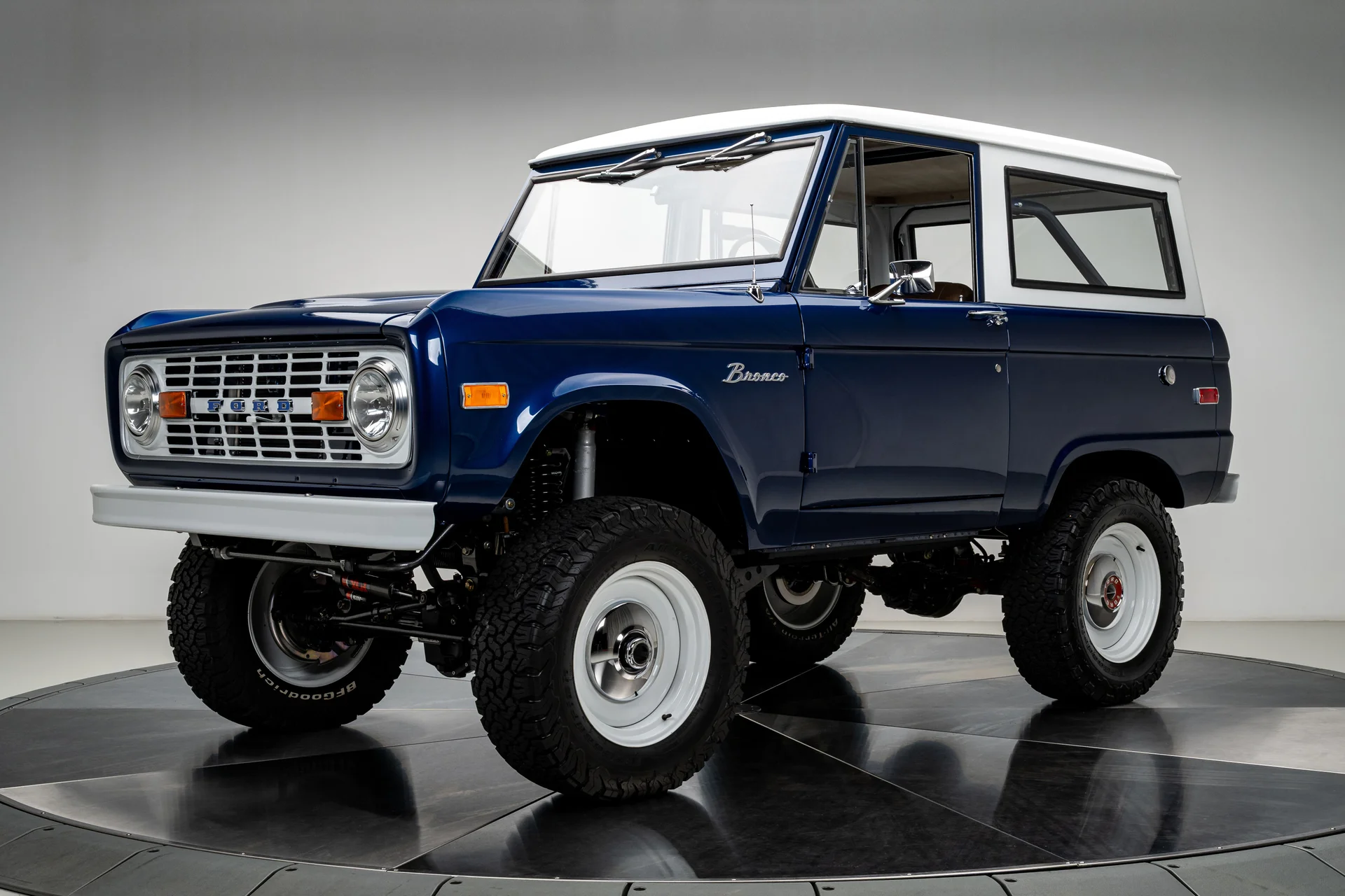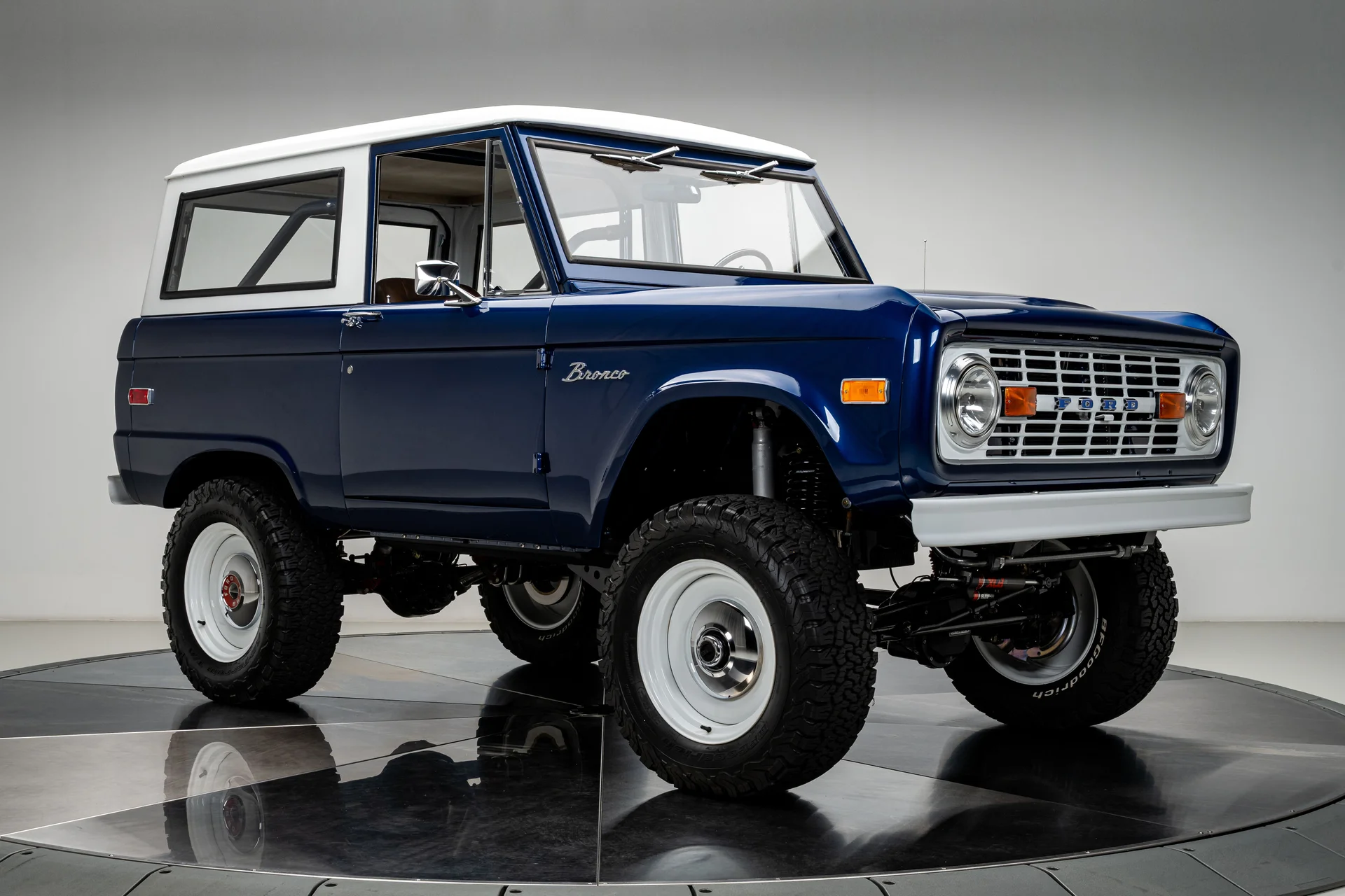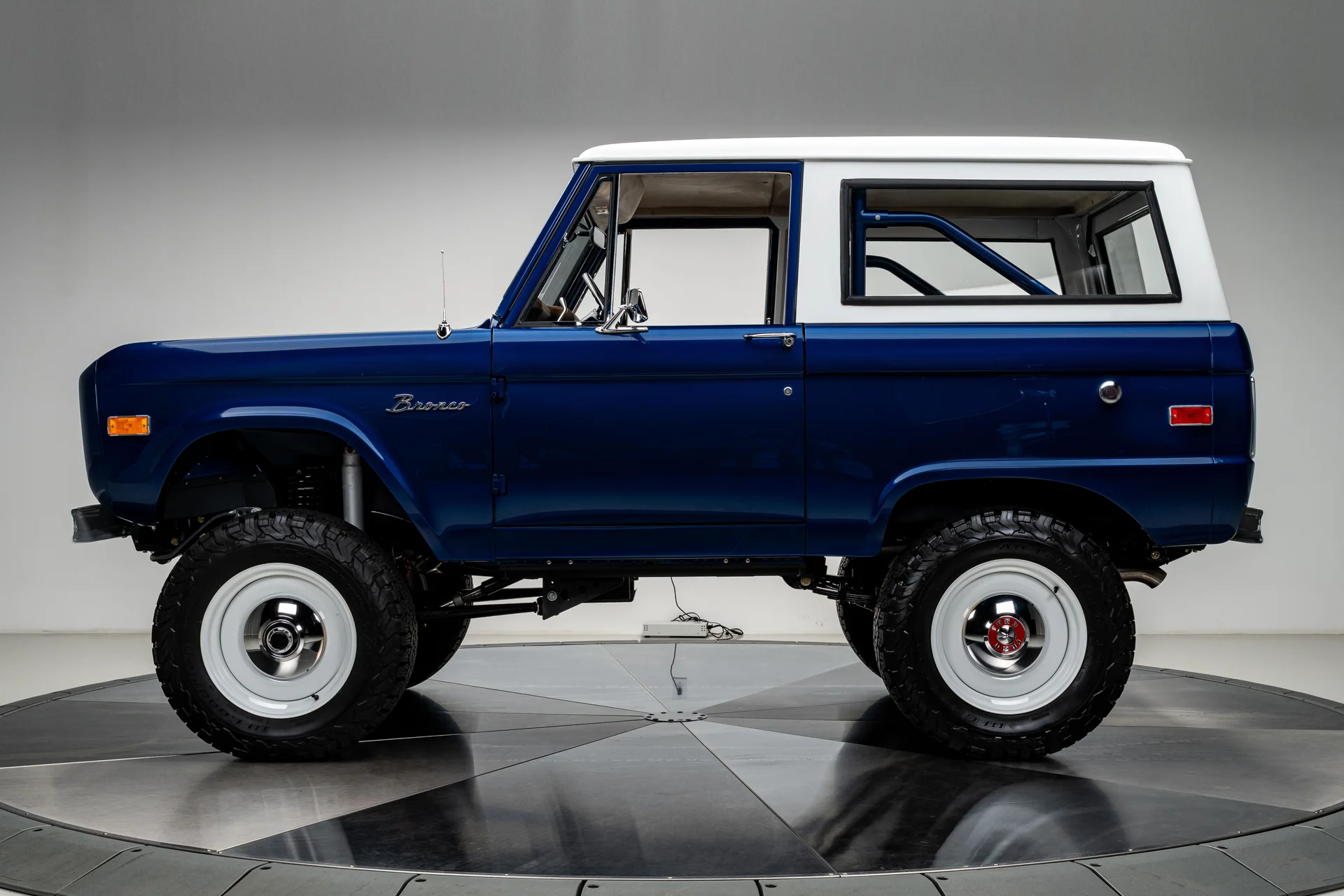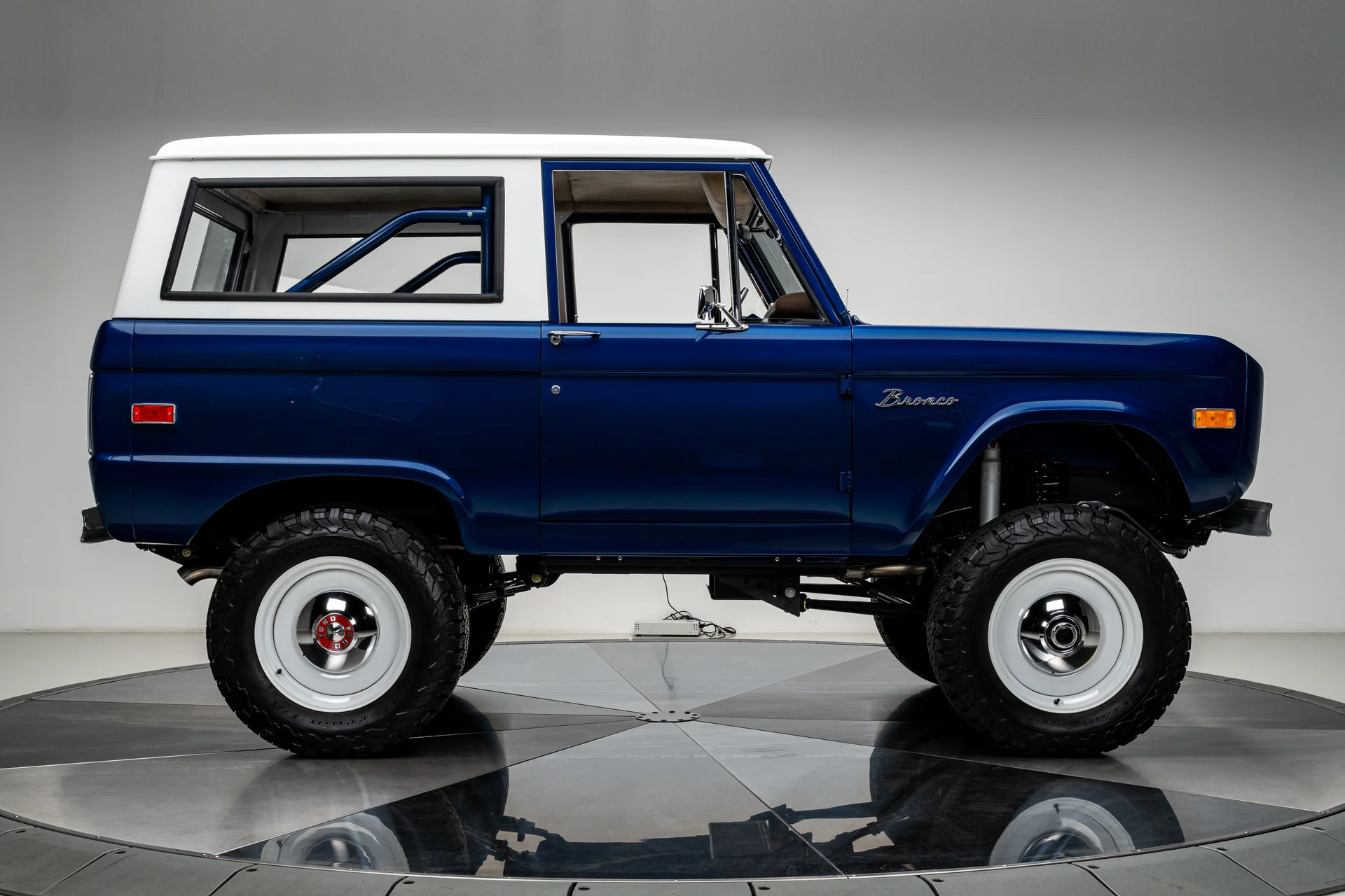 Com acabamento em um profundo azul metálico e teto rígido de metal branco contrastante, este Bronco encontra o equilíbrio perfeito entre apresentação clássica e detalhes refinados. O teto de aço removível era opcional quando novo, e este exemplar vai além com um forro de teto personalizado em camurça que integra isolamento térmico e acústico para uma cabine mais silenciosa e sofisticada. A restauração trouxe linhas de carroceria nítidas e encaixes perfeitos dos painéis, acentuados por detalhes em alumínio billet, faróis de LED e para-choques brancos brilhantes. A grade apresenta a inscrição “FORD” em 3D com contornos cromados, adicionando um toque sutil de modernidade à dianteira. Os estribos retráteis elétricos RealTruck se encaixam perfeitamente sob as soleiras, facilitando o acesso à cabine sem comprometer a postura do veículo. As rodas Detroit Steel brancas de 18 polegadas com calotas cromadas conferem o toque de época perfeito, enquanto os pneus BFGoodrich All-Terrain 285/65 adicionam um perfil imponente. A suspensão elevada de 3,5 polegadas da Wild Horses, combinada com a elevação da carroceria de 3 polegadas, confere à caminhonete as proporções adequadas, e o visual geral proporciona presença e funcionalidade.