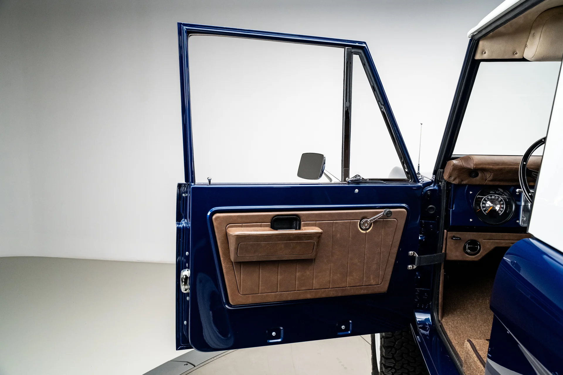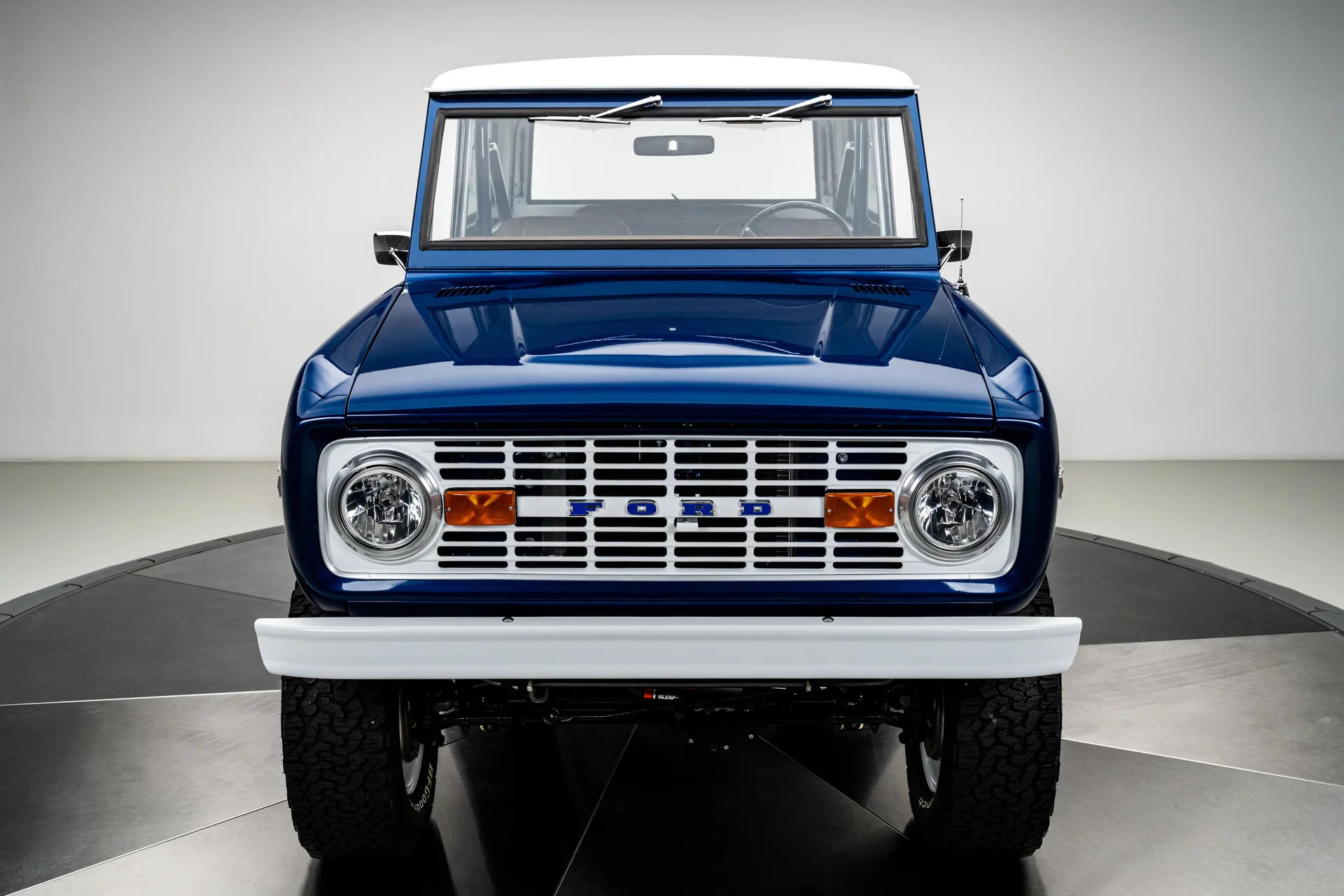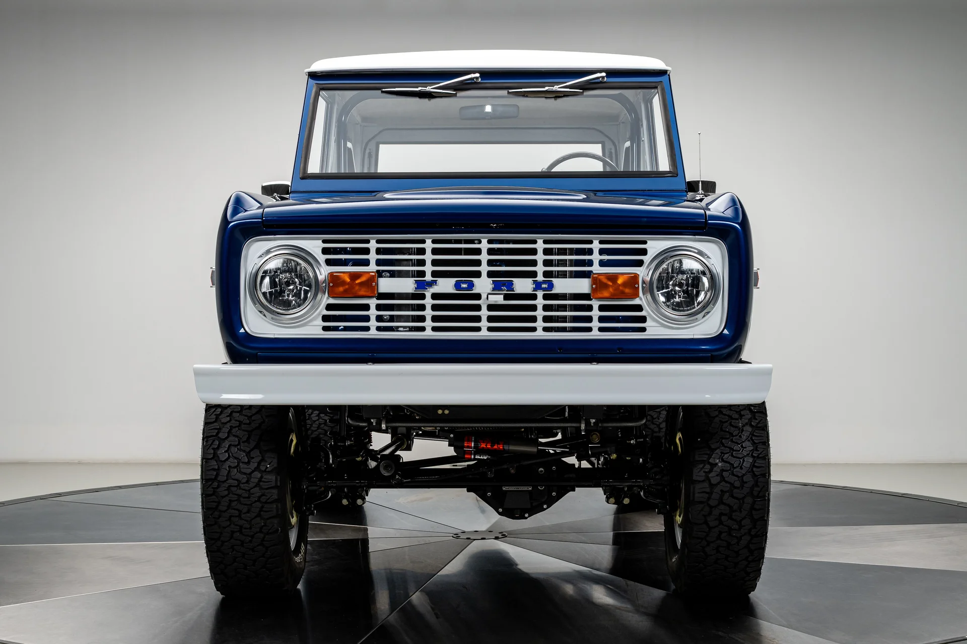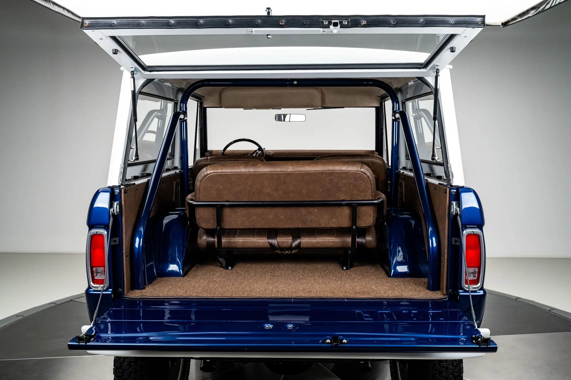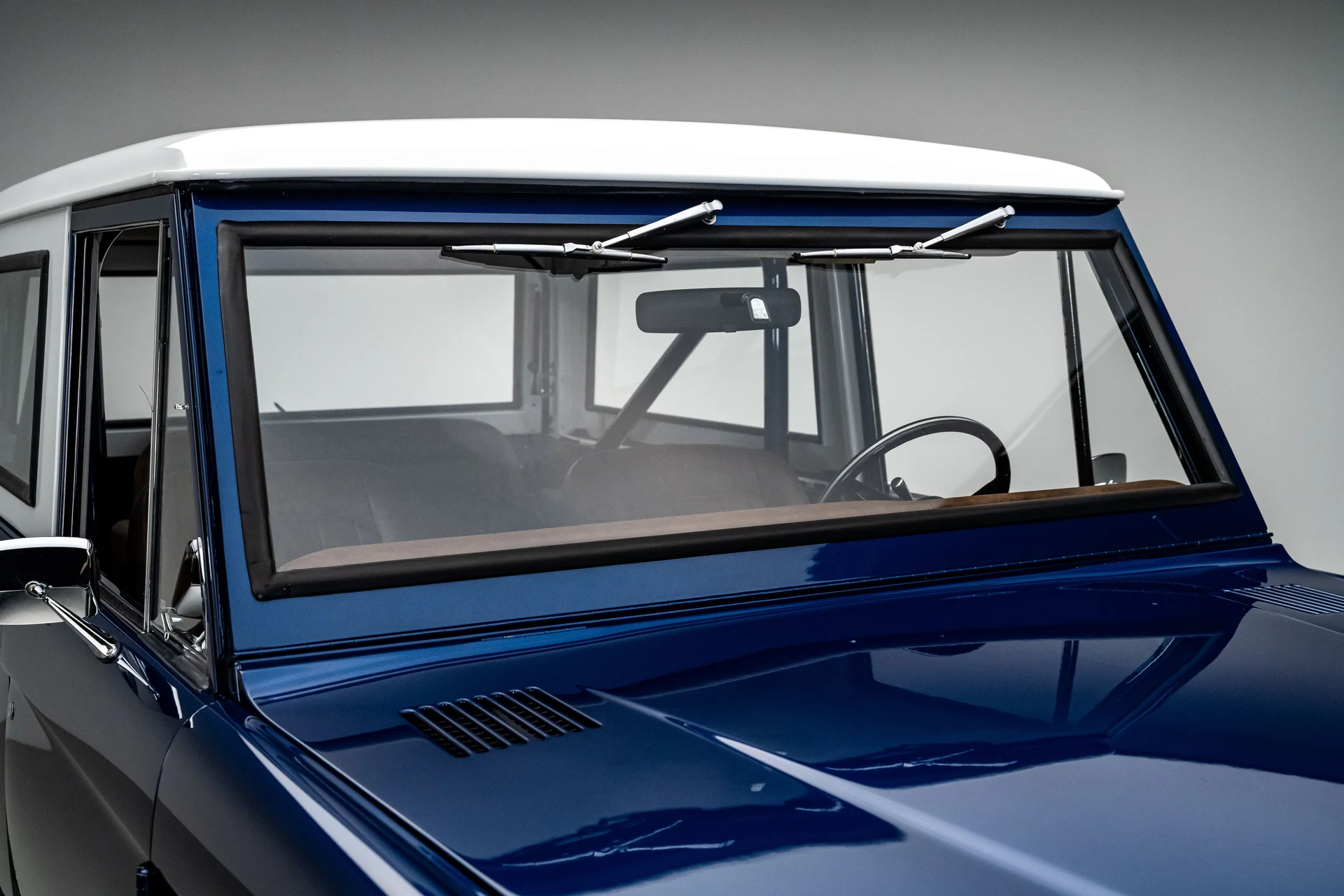 Com acabamento em um profundo azul metálico e teto rígido de metal branco contrastante, este Bronco encontra o equilíbrio perfeito entre apresentação clássica e detalhes refinados. O teto de aço removível era opcional quando novo, e este exemplar vai além com um forro de teto personalizado em camurça que integra isolamento térmico e acústico para uma cabine mais silenciosa e sofisticada. A restauração trouxe linhas de carroceria nítidas e encaixes perfeitos dos painéis, acentuados por detalhes em alumínio billet, faróis de LED e para-choques brancos brilhantes. A grade apresenta a inscrição “FORD” em 3D com contornos cromados, adicionando um toque sutil de modernidade à dianteira. Os estribos retráteis elétricos RealTruck se encaixam perfeitamente sob as soleiras, facilitando o acesso à cabine sem comprometer a postura do veículo. As rodas Detroit Steel brancas de 18 polegadas com calotas cromadas conferem o toque de época perfeito, enquanto os pneus BFGoodrich All-Terrain 285/65 adicionam um perfil imponente. A suspensão elevada de 3,5 polegadas da Wild Horses, combinada com a elevação da carroceria de 3 polegadas, confere à caminhonete as proporções adequadas, e o visual geral proporciona presença e funcionalidade.