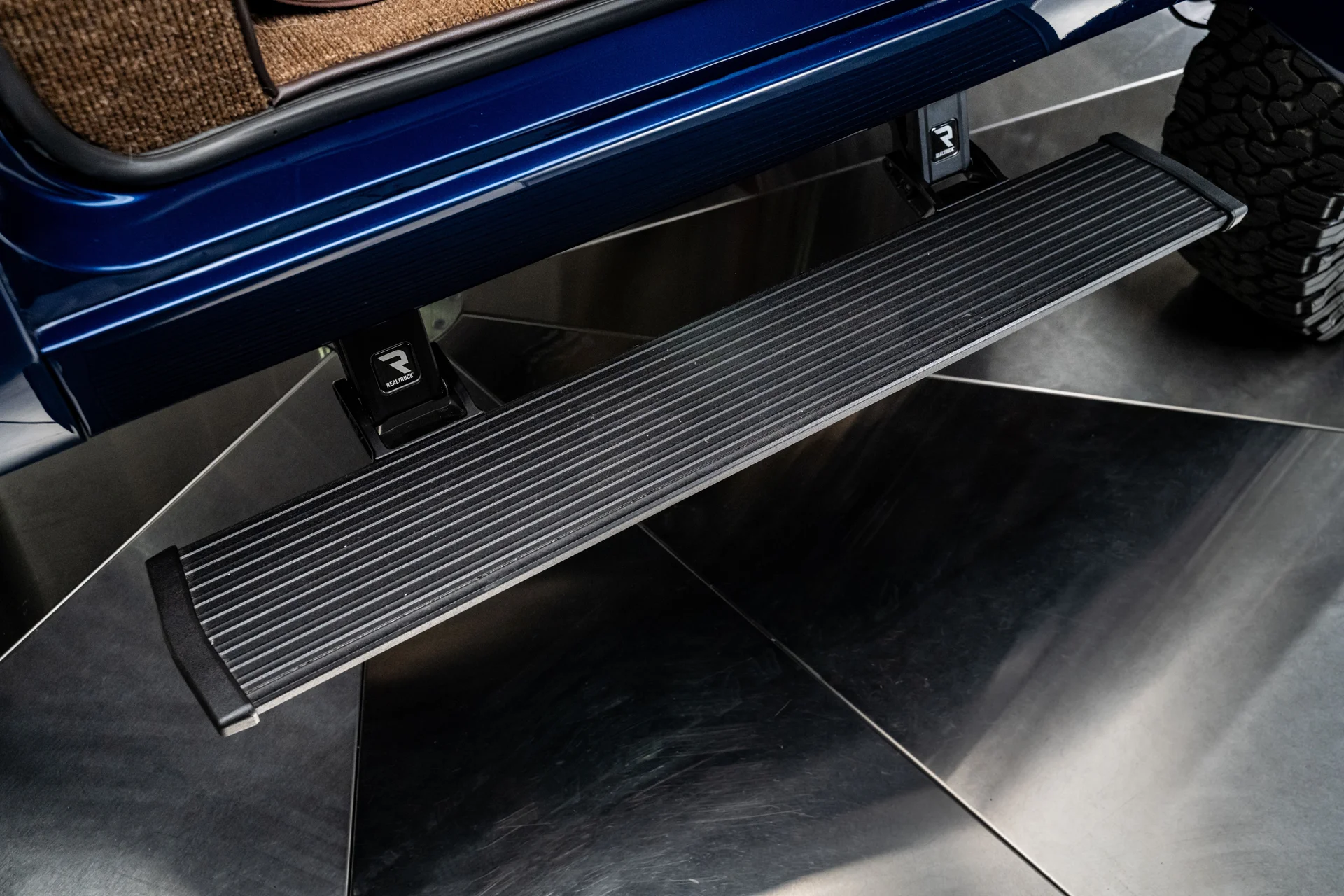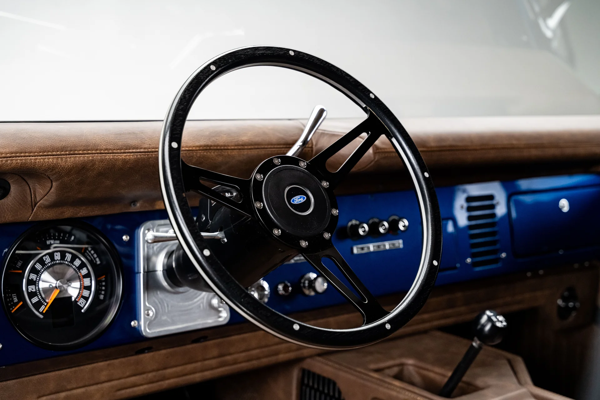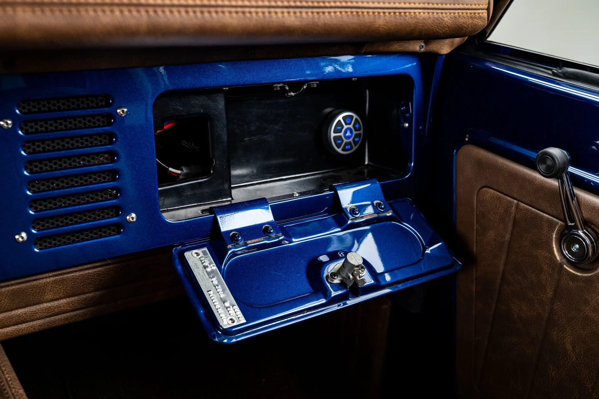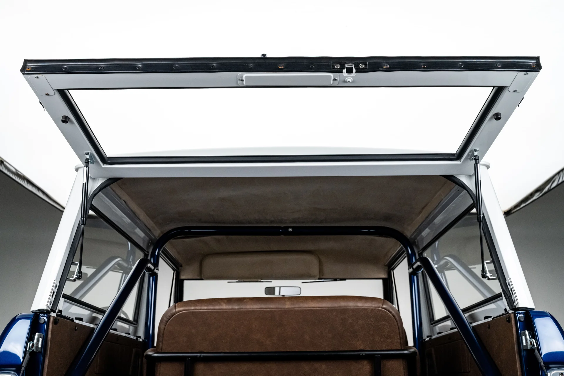 Com acabamento em um profundo azul metálico e teto rígido de metal branco contrastante, este Bronco encontra o equilíbrio perfeito entre apresentação clássica e detalhes refinados. O teto de aço removível era opcional quando novo, e este exemplar vai além com um forro de teto personalizado em camurça que integra isolamento térmico e acústico para uma cabine mais silenciosa e sofisticada. A restauração trouxe linhas de carroceria nítidas e encaixes perfeitos dos painéis, acentuados por detalhes em alumínio billet, faróis de LED e para-choques brancos brilhantes. A grade apresenta a inscrição “FORD” em 3D com contornos cromados, adicionando um toque sutil de modernidade à dianteira. Os estribos retráteis elétricos RealTruck se encaixam perfeitamente sob as soleiras, facilitando o acesso à cabine sem comprometer a postura do veículo. As rodas Detroit Steel brancas de 18 polegadas com calotas cromadas conferem o toque de época perfeito, enquanto os pneus BFGoodrich All-Terrain 285/65 adicionam um perfil imponente. A suspensão elevada de 3,5 polegadas da Wild Horses, combinada com a elevação da carroceria de 3 polegadas, confere à caminhonete as proporções adequadas, e o visual geral proporciona presença e funcionalidade.