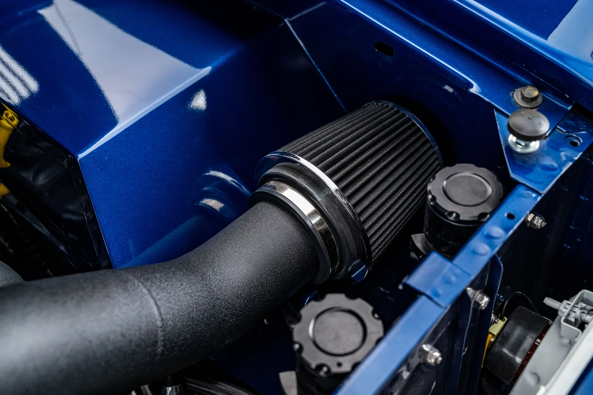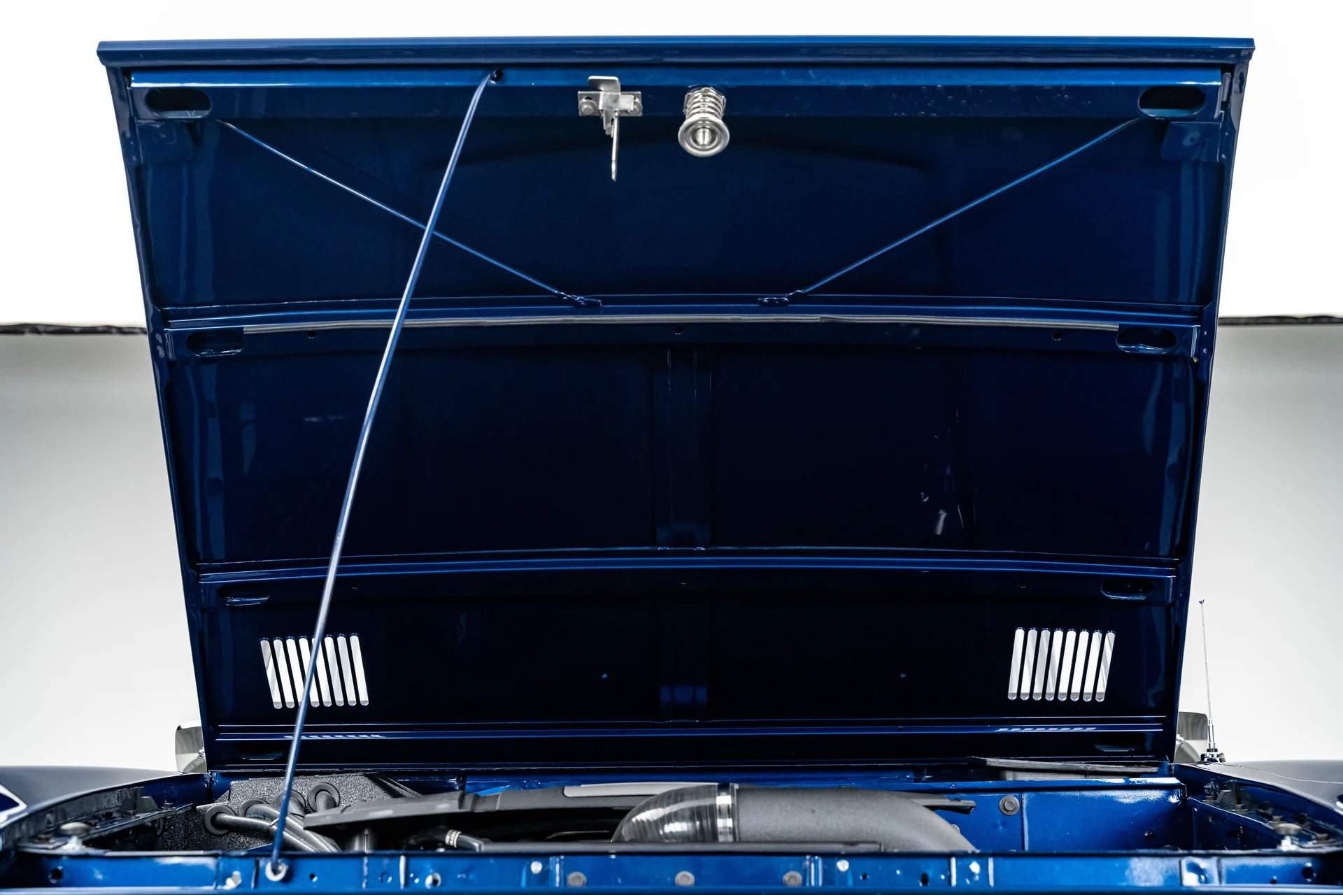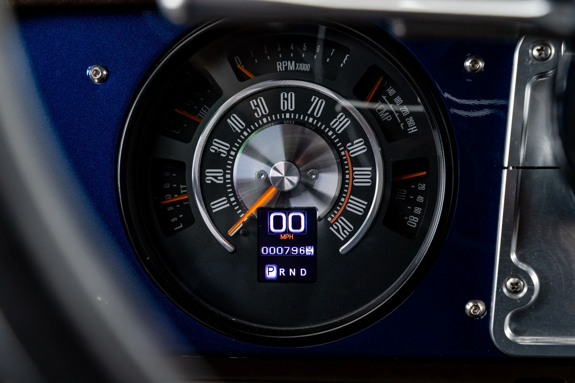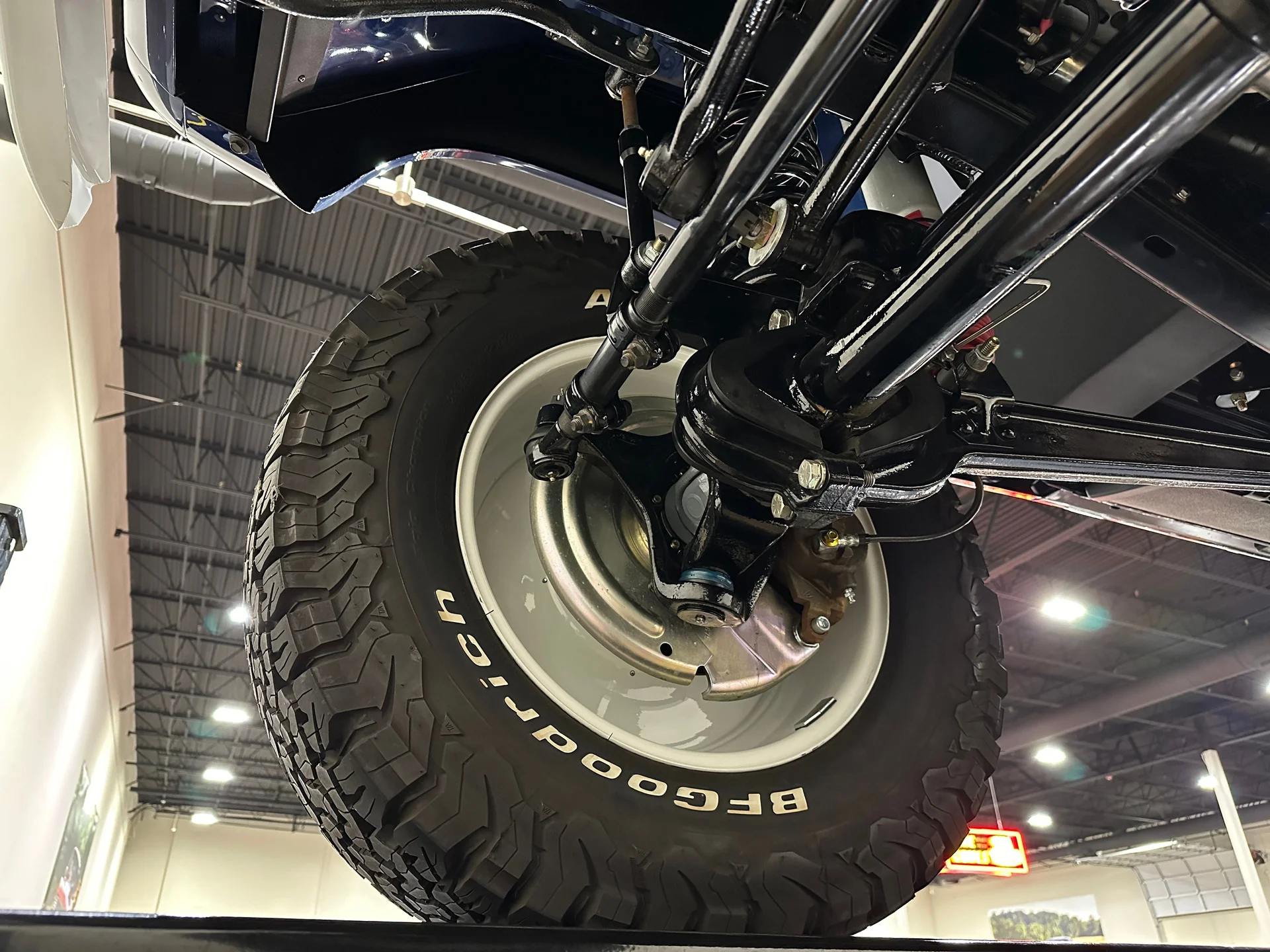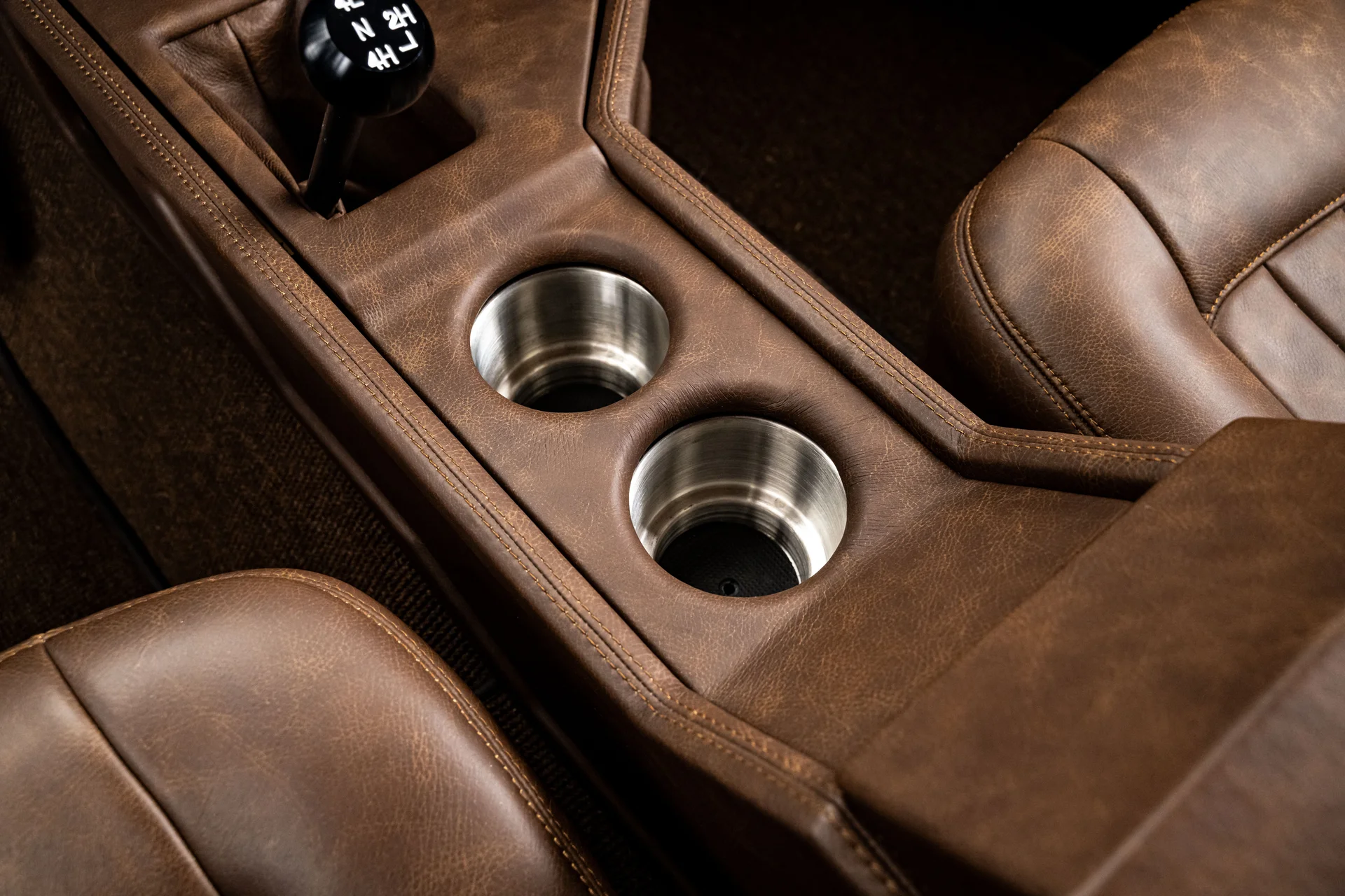 Com acabamento em um profundo azul metálico e teto rígido de metal branco contrastante, este Bronco encontra o equilíbrio perfeito entre apresentação clássica e detalhes refinados. O teto de aço removível era opcional quando novo, e este exemplar vai além com um forro de teto personalizado em camurça que integra isolamento térmico e acústico para uma cabine mais silenciosa e sofisticada. A restauração trouxe linhas de carroceria nítidas e encaixes perfeitos dos painéis, acentuados por detalhes em alumínio billet, faróis de LED e para-choques brancos brilhantes. A grade apresenta a inscrição “FORD” em 3D com contornos cromados, adicionando um toque sutil de modernidade à dianteira. Os estribos retráteis elétricos RealTruck se encaixam perfeitamente sob as soleiras, facilitando o acesso à cabine sem comprometer a postura do veículo. As rodas Detroit Steel brancas de 18 polegadas com calotas cromadas conferem o toque de época perfeito, enquanto os pneus BFGoodrich All-Terrain 285/65 adicionam um perfil imponente. A suspensão elevada de 3,5 polegadas da Wild Horses, combinada com a elevação da carroceria de 3 polegadas, confere à caminhonete as proporções adequadas, e o visual geral proporciona presença e funcionalidade.