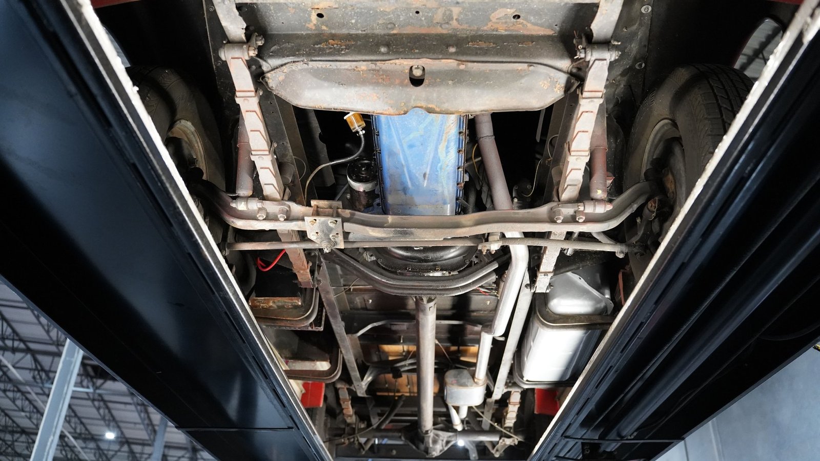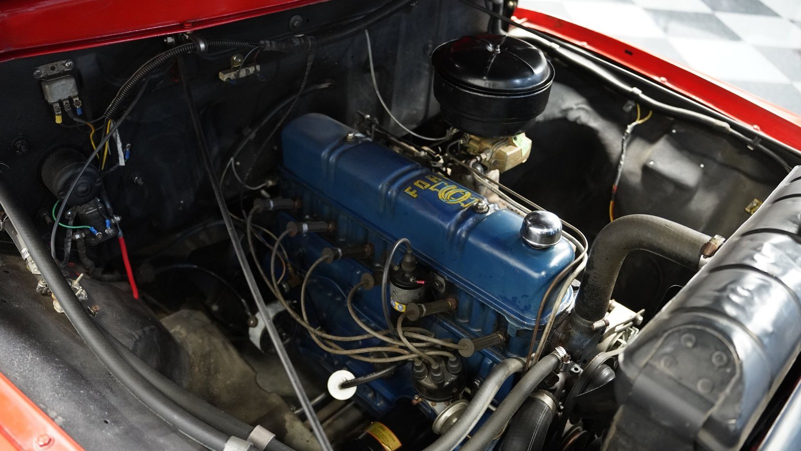 Equipando este caminhão clássico, está o confiável motor Ford de seis cilindros em linha e 223 polegadas cúbicas, com um carburador Holley responsável pelo fornecimento de combustível. O motor liga facilmente e atinge marcha lenta suave, conectado a uma transmissão manual de 3 marchas que oferece ao motorista controle total sobre a experiência de dirigir. O compartimento do motor mantém uma aparência autêntica, com alguma manutenção atualizada, incluindo cabos de vela novos. A simplicidade mecânica é parte do que torna esses primeiros caminhões da Série F tão atraentes: uma engenharia simples que qualquer homem poderia consertar em sua própria garagem, sem diagnósticos computadorizados ou ferramentas especializadas.