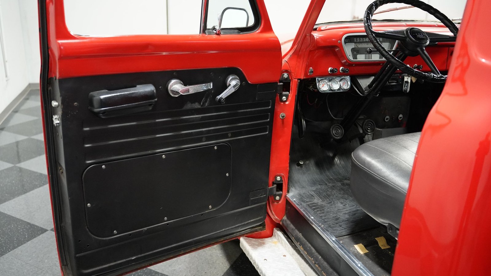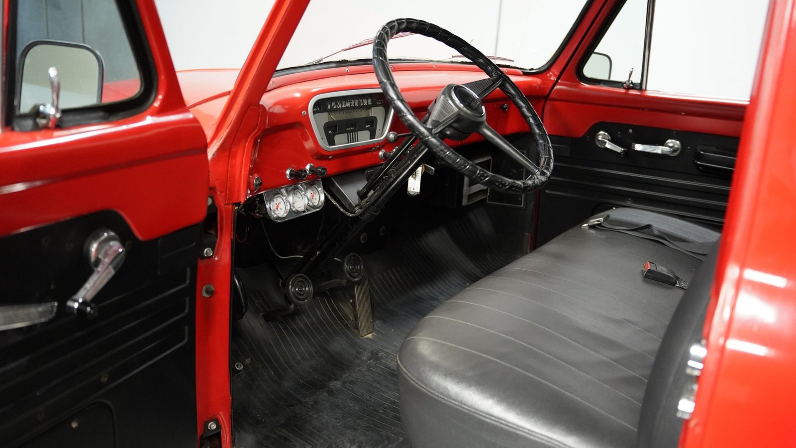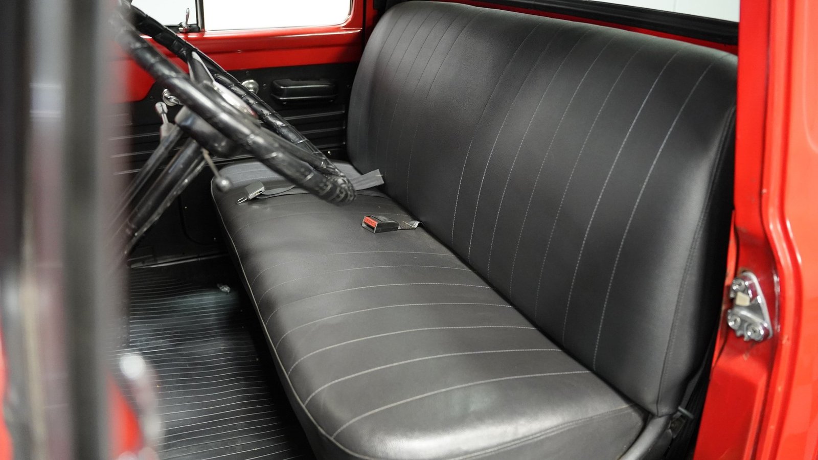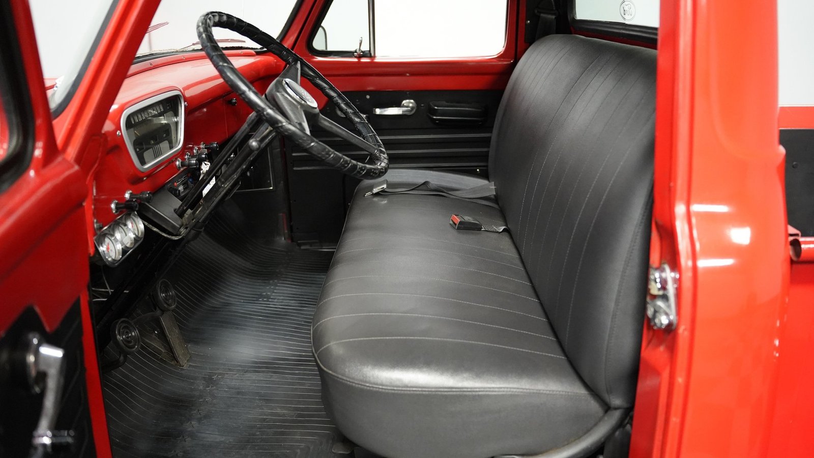 No interior, o interior em vinil preto e vermelho remete às raízes operárias da picape. O banco corrido oferece conforto simples, sem enfeites desnecessários, combinando perfeitamente com a atitude trabalhadora da picape. Um painel de instrumentos com 3 mostradores, montado sob o painel, fornece as informações vitais que qualquer motorista precisa, enquanto a alavanca de câmbio na coluna coloca todo o controle na ponta dos seus dedos. Nada de eletrônicos ou gadgets em excesso aqui – apenas uma cabine honesta que permite que você sinta como era dirigir quando os homens construíam coisas para durar e as caminhonetes eram ferramentas, não brinquedos. O aparelho de som AM/FM cassete oferece a única concessão moderna.