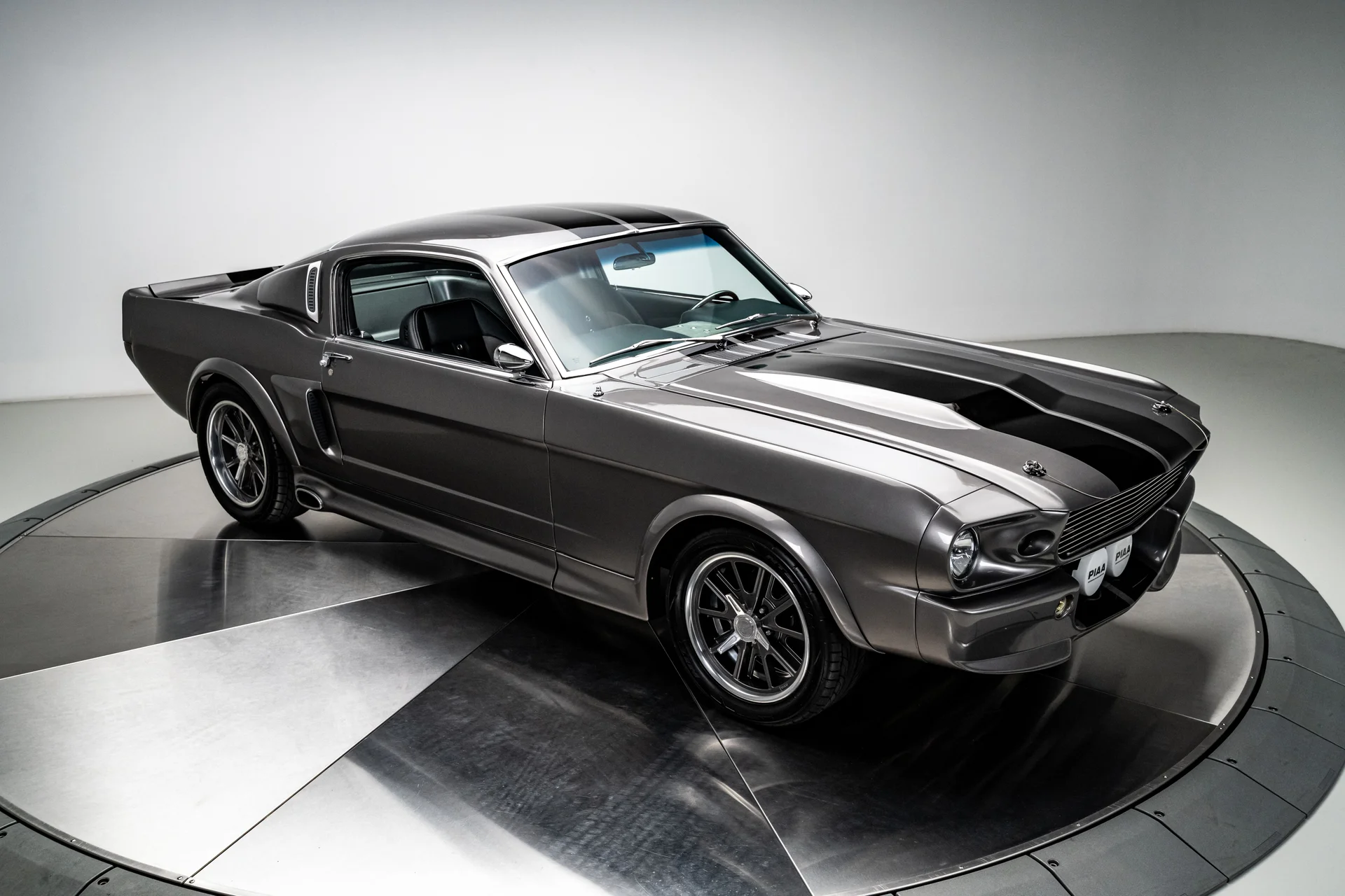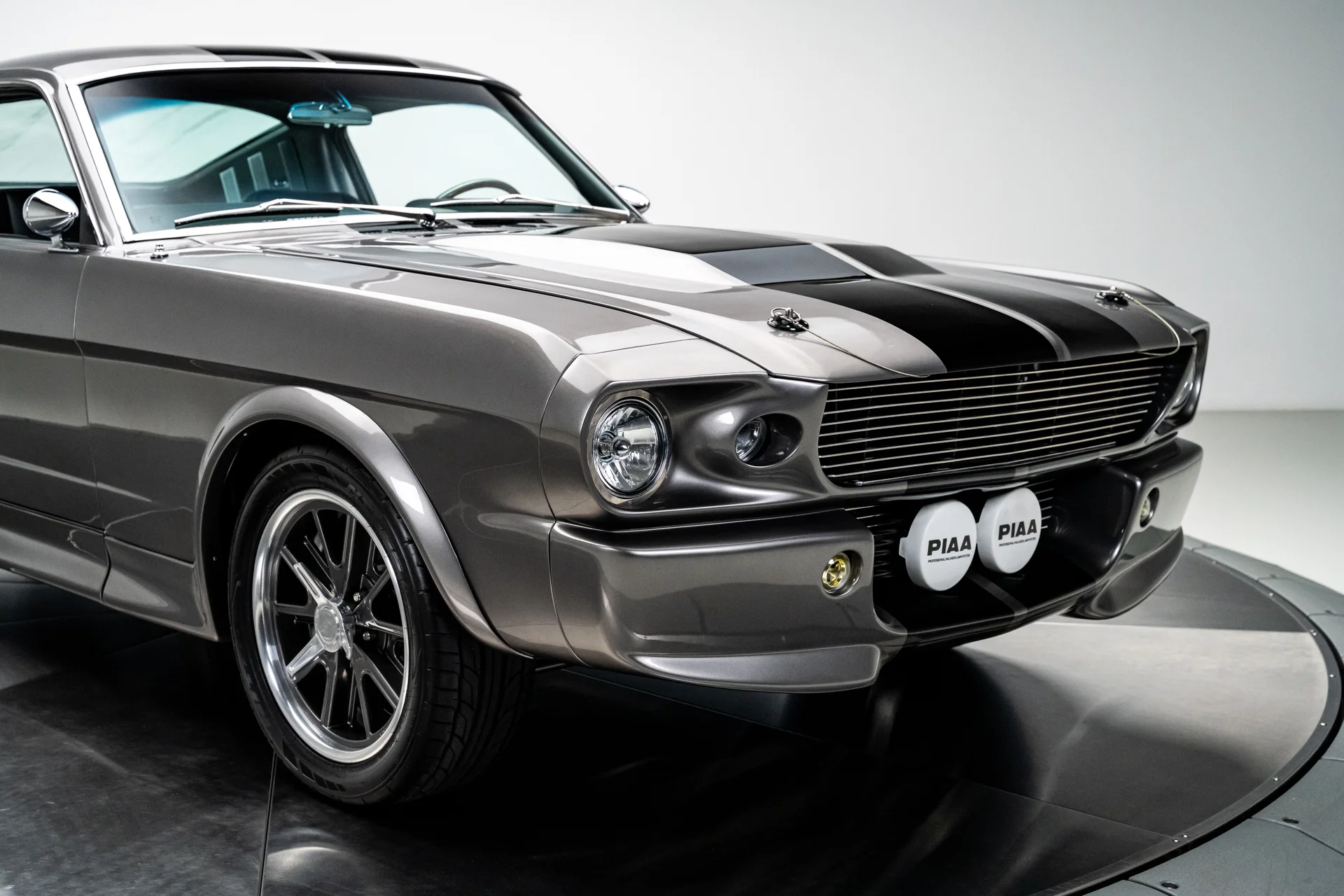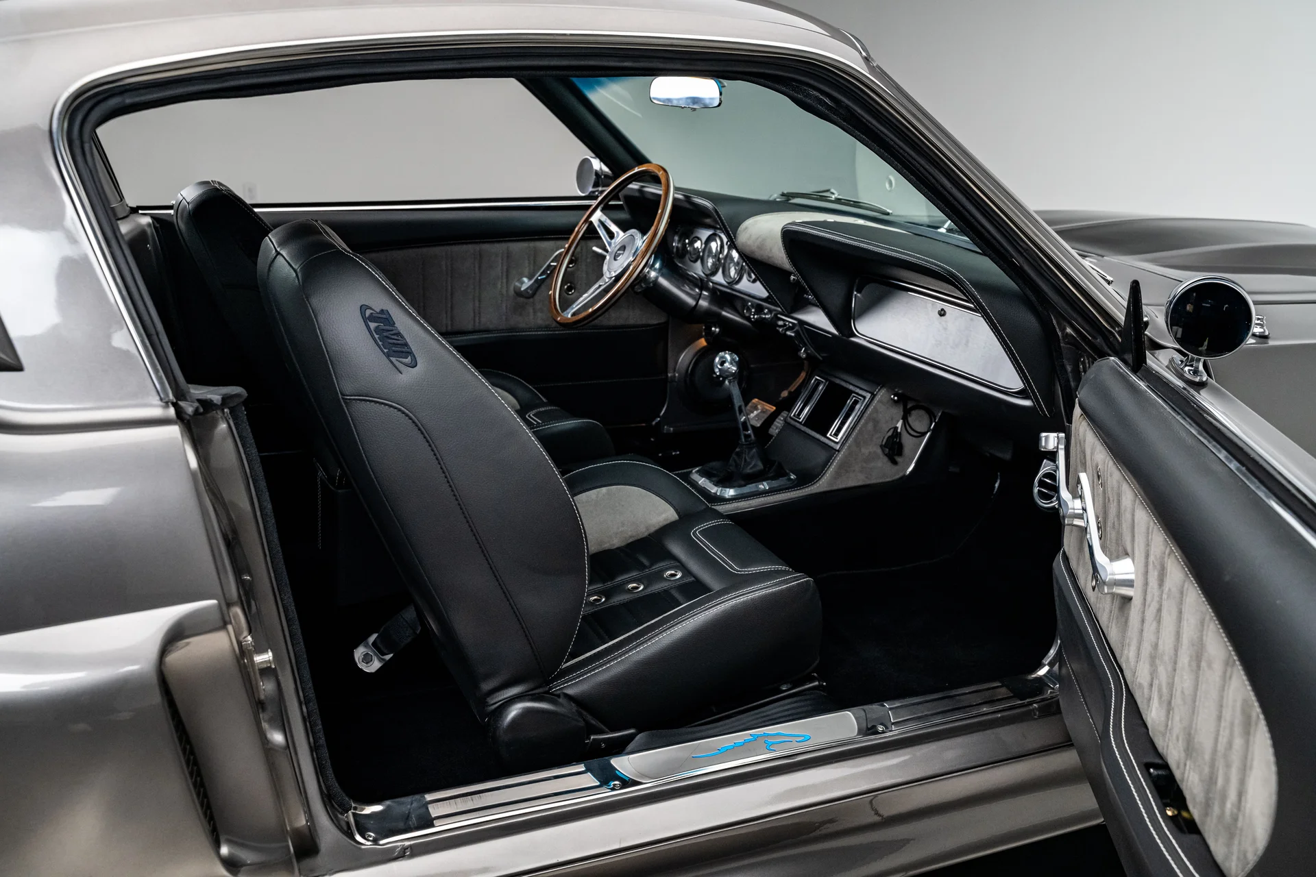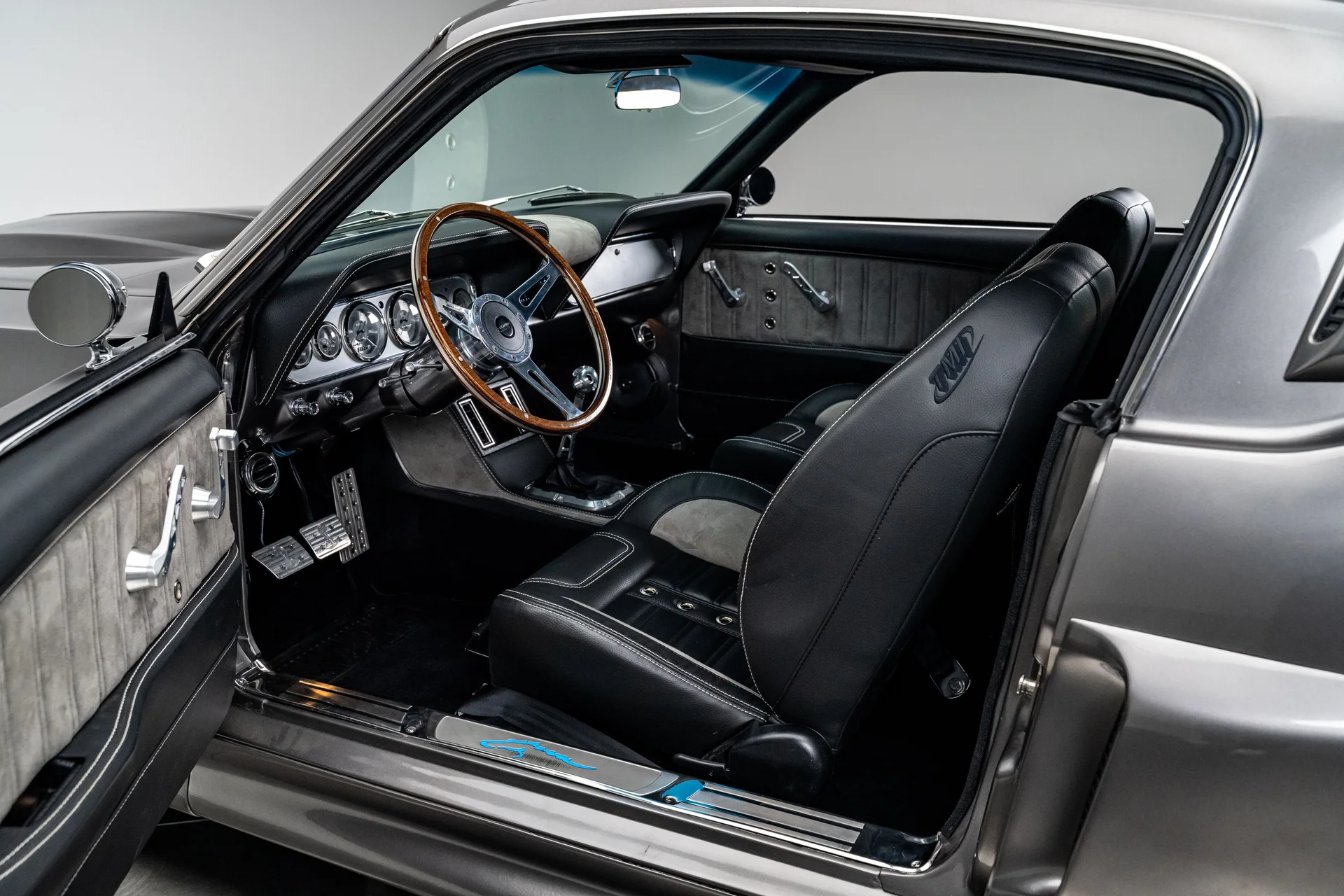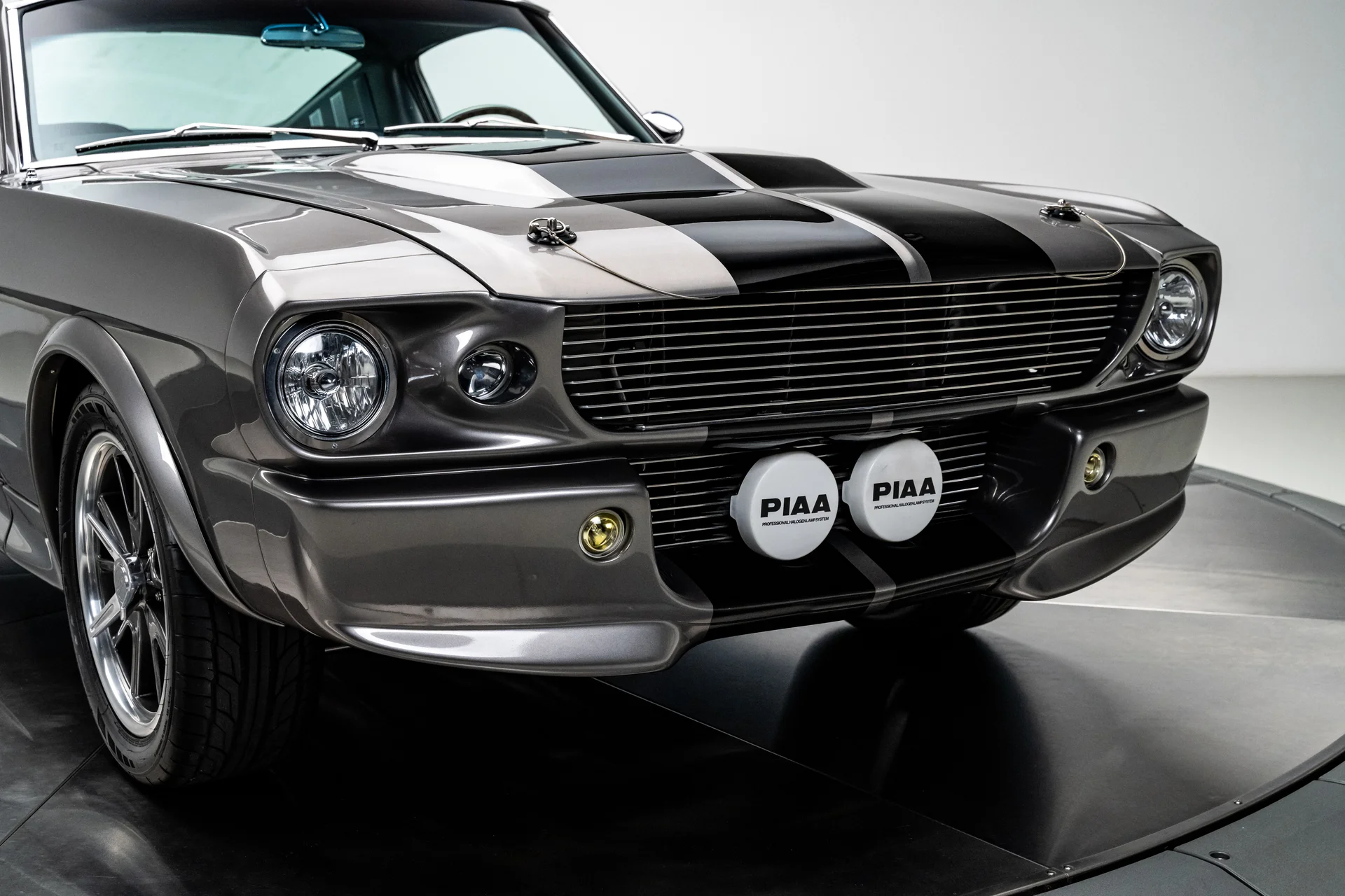 A carroceria ostenta um kit CJ Pony Parts estilo Eleanor que incorpora os icônicos para-choques dianteiro e traseiro, conferindo ao fastback uma postura mais agressiva e imponente sem perder as proporções clássicas do carro. Com acabamento em cinza Pepper Gray e faixas pretas pintadas, o carro apresenta um visual limpo e sinistro que se encaixa perfeitamente no tema Eleanor. Detalhes como as luzes da grade PIAA, os retrovisores laterais estilo bala, as lanternas traseiras de LED sequenciais e o inconfundível escapamento lateral reforçam a conexão com o carro do filme, enquanto as rodas American Racing Shelby Cobra calçadas com pneus de alta performance Nitto NT555 proporcionam uma presença robusta e pronta para as ruas.