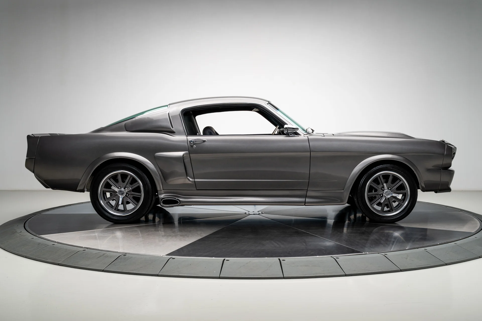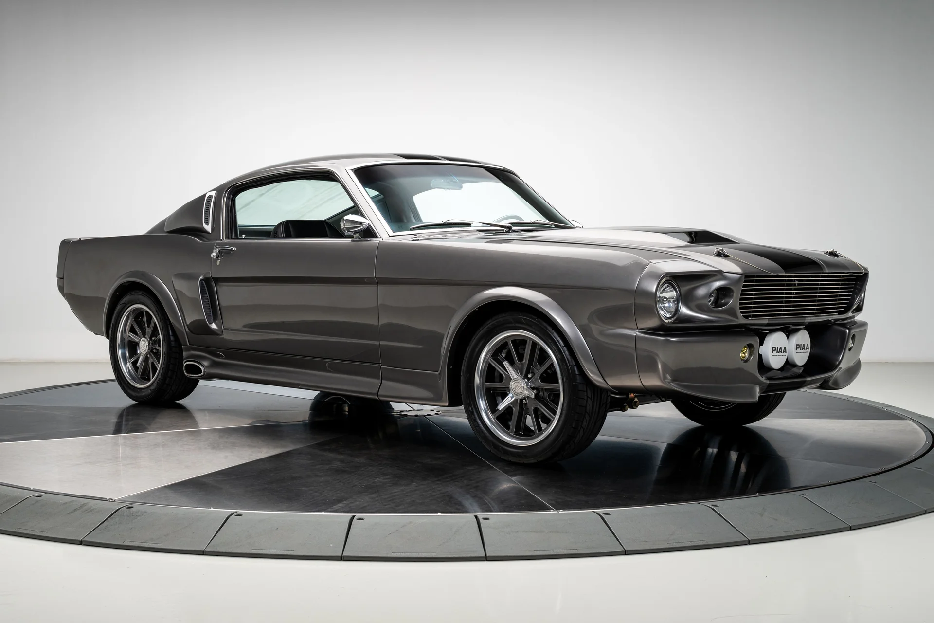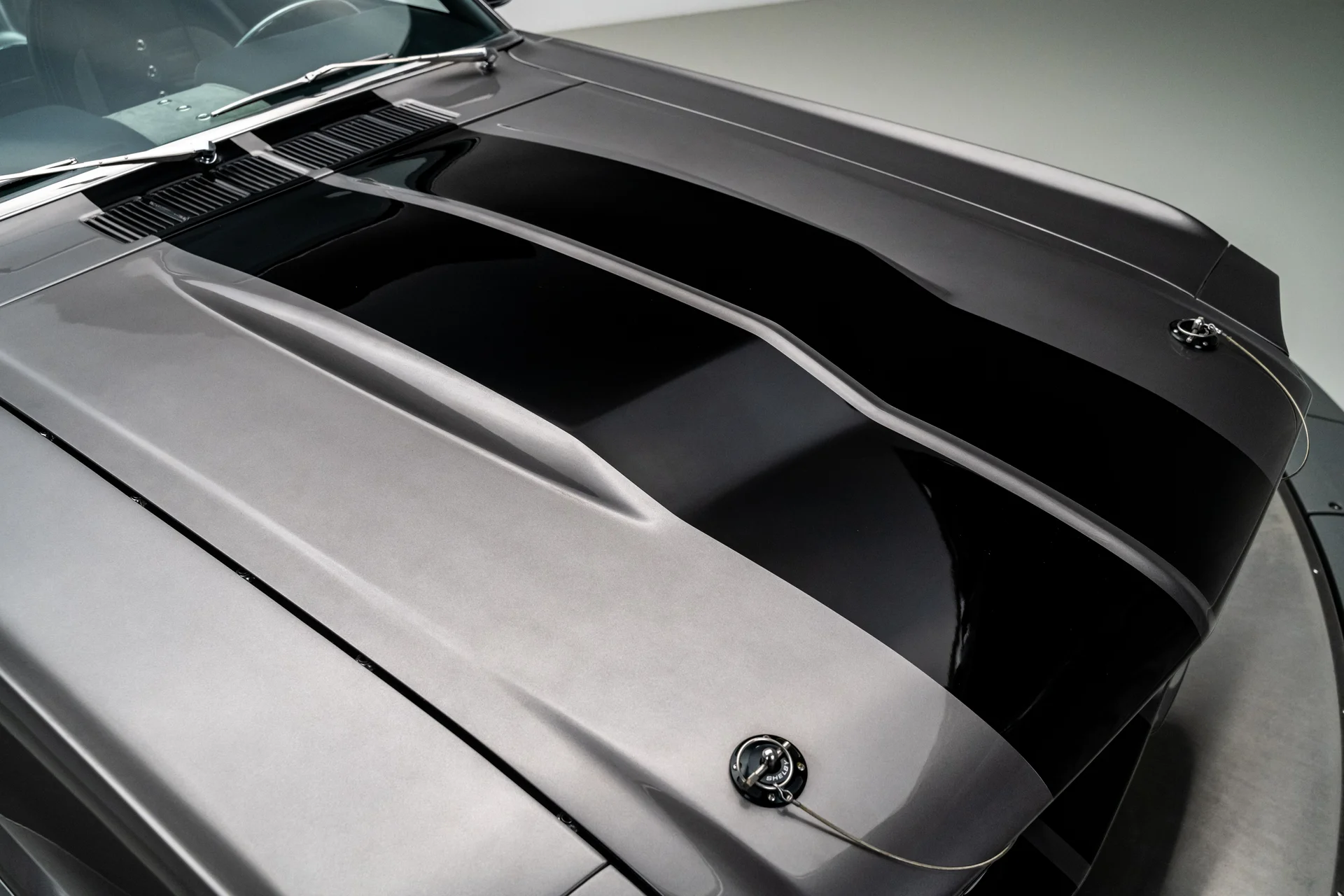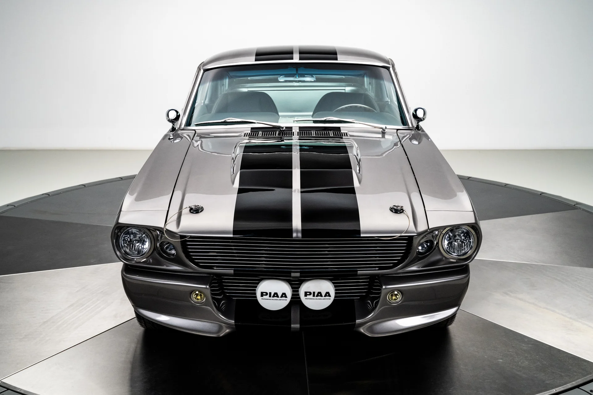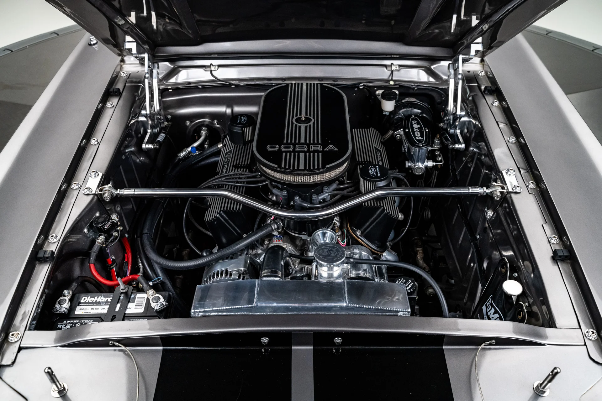 A carroceria ostenta um kit CJ Pony Parts estilo Eleanor que incorpora os icônicos para-choques dianteiro e traseiro, conferindo ao fastback uma postura mais agressiva e imponente sem perder as proporções clássicas do carro. Com acabamento em cinza Pepper Gray e faixas pretas pintadas, o carro apresenta um visual limpo e sinistro que se encaixa perfeitamente no tema Eleanor. Detalhes como as luzes da grade PIAA, os retrovisores laterais estilo bala, as lanternas traseiras de LED sequenciais e o inconfundível escapamento lateral reforçam a conexão com o carro do filme, enquanto as rodas American Racing Shelby Cobra calçadas com pneus de alta performance Nitto NT555 proporcionam uma presença robusta e pronta para as ruas.