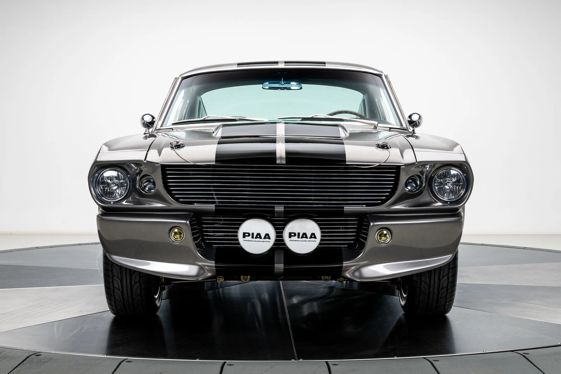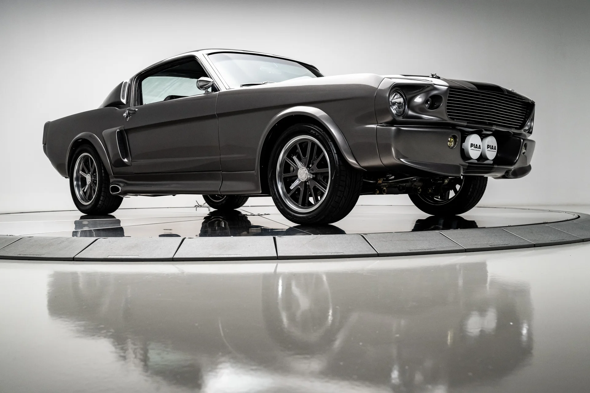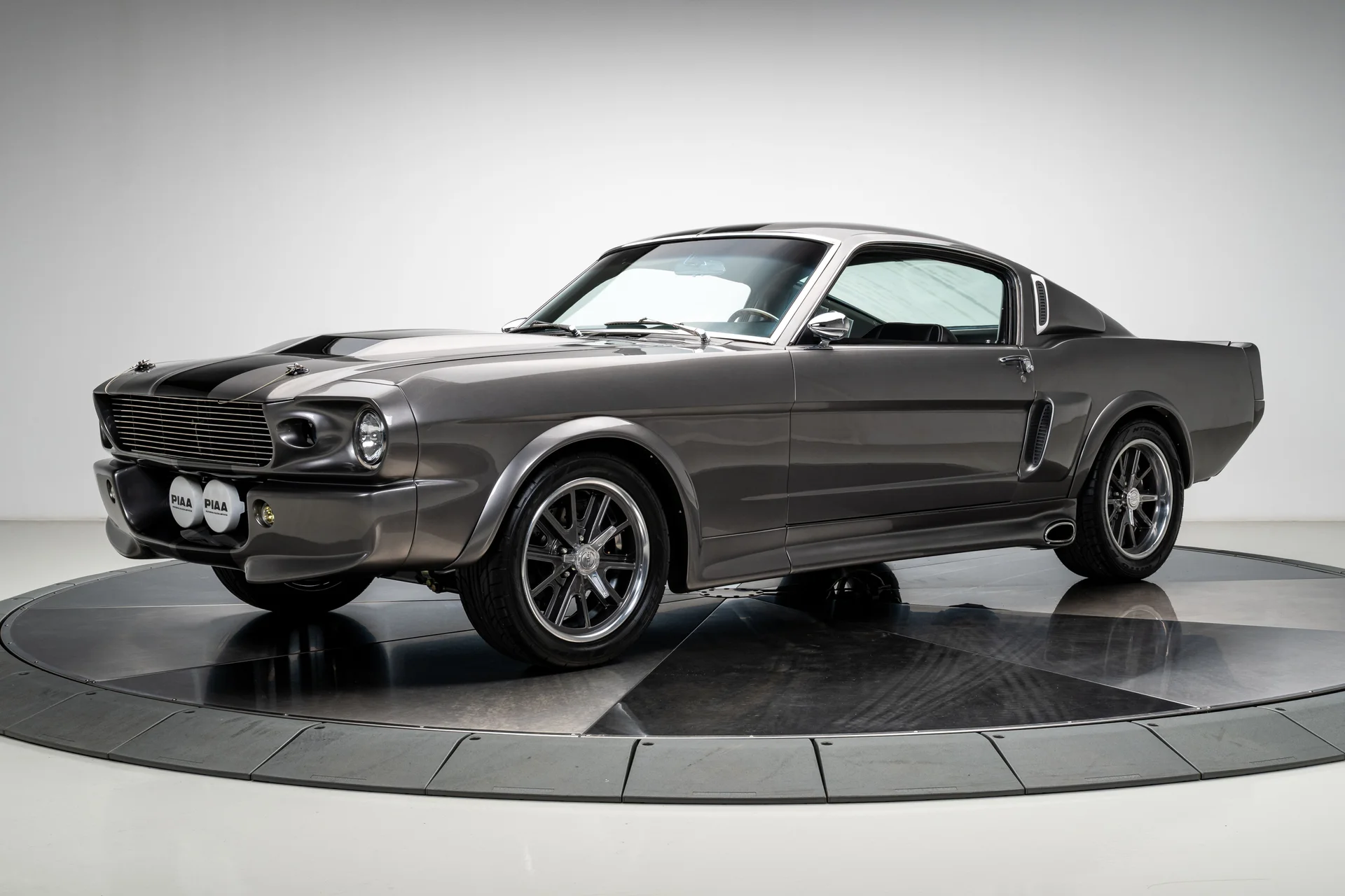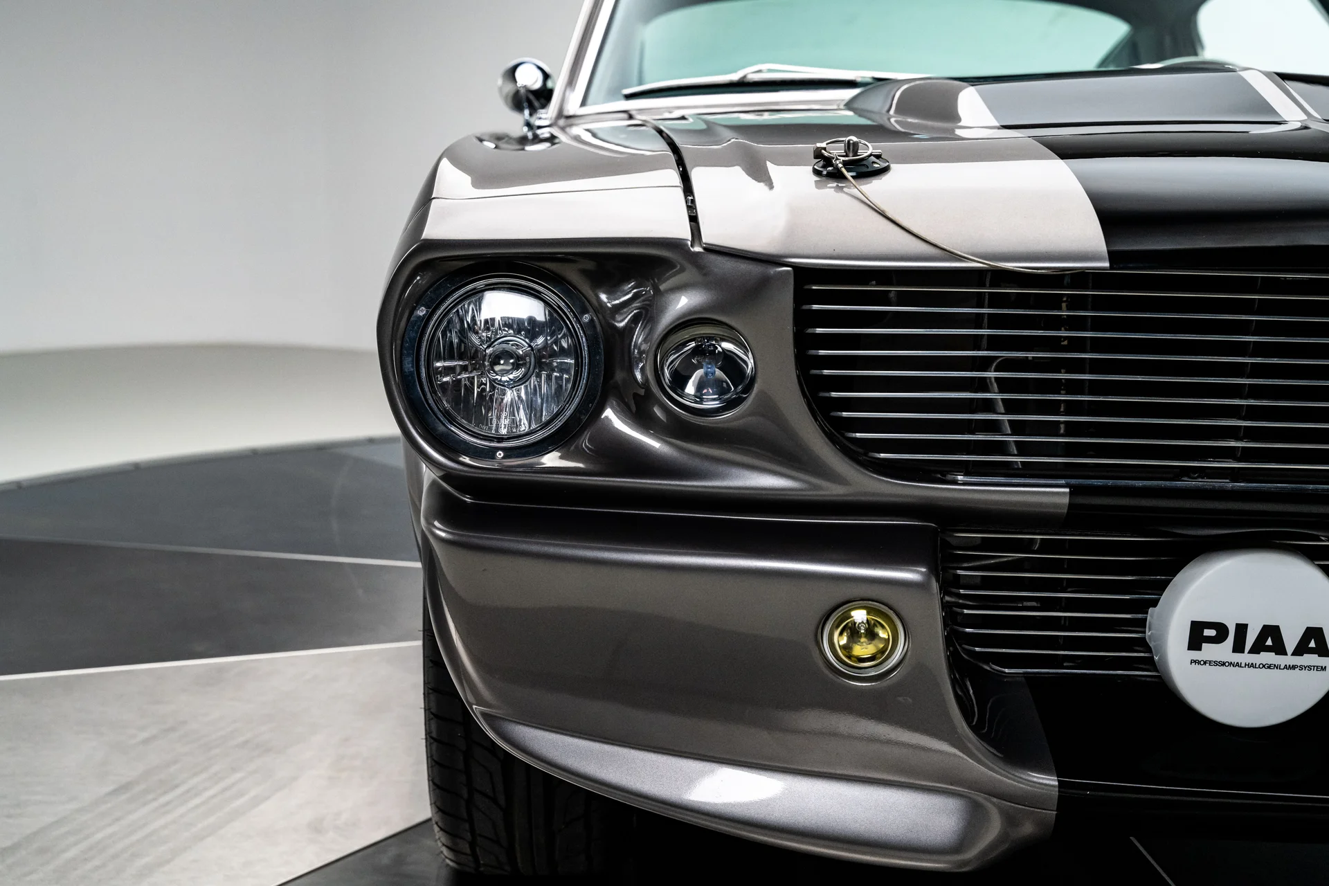 A carroceria ostenta um kit CJ Pony Parts estilo Eleanor que incorpora os icônicos para-choques dianteiro e traseiro, conferindo ao fastback uma postura mais agressiva e imponente sem perder as proporções clássicas do carro. Com acabamento em cinza Pepper Gray e faixas pretas pintadas, o carro apresenta um visual limpo e sinistro que se encaixa perfeitamente no tema Eleanor. Detalhes como as luzes da grade PIAA, os retrovisores laterais estilo bala, as lanternas traseiras de LED sequenciais e o inconfundível escapamento lateral reforçam a conexão com o carro do filme, enquanto as rodas American Racing Shelby Cobra calçadas com pneus de alta performance Nitto NT555 proporcionam uma presença robusta e pronta para as ruas.
