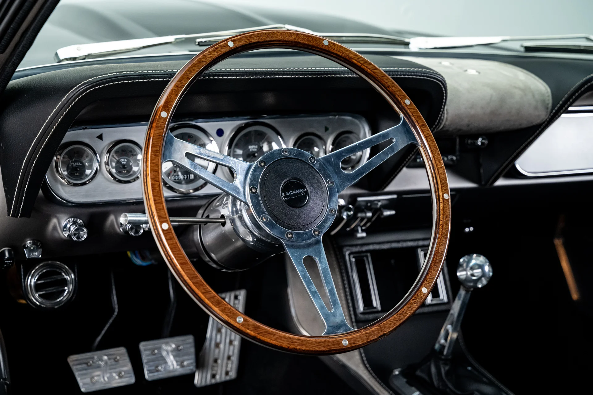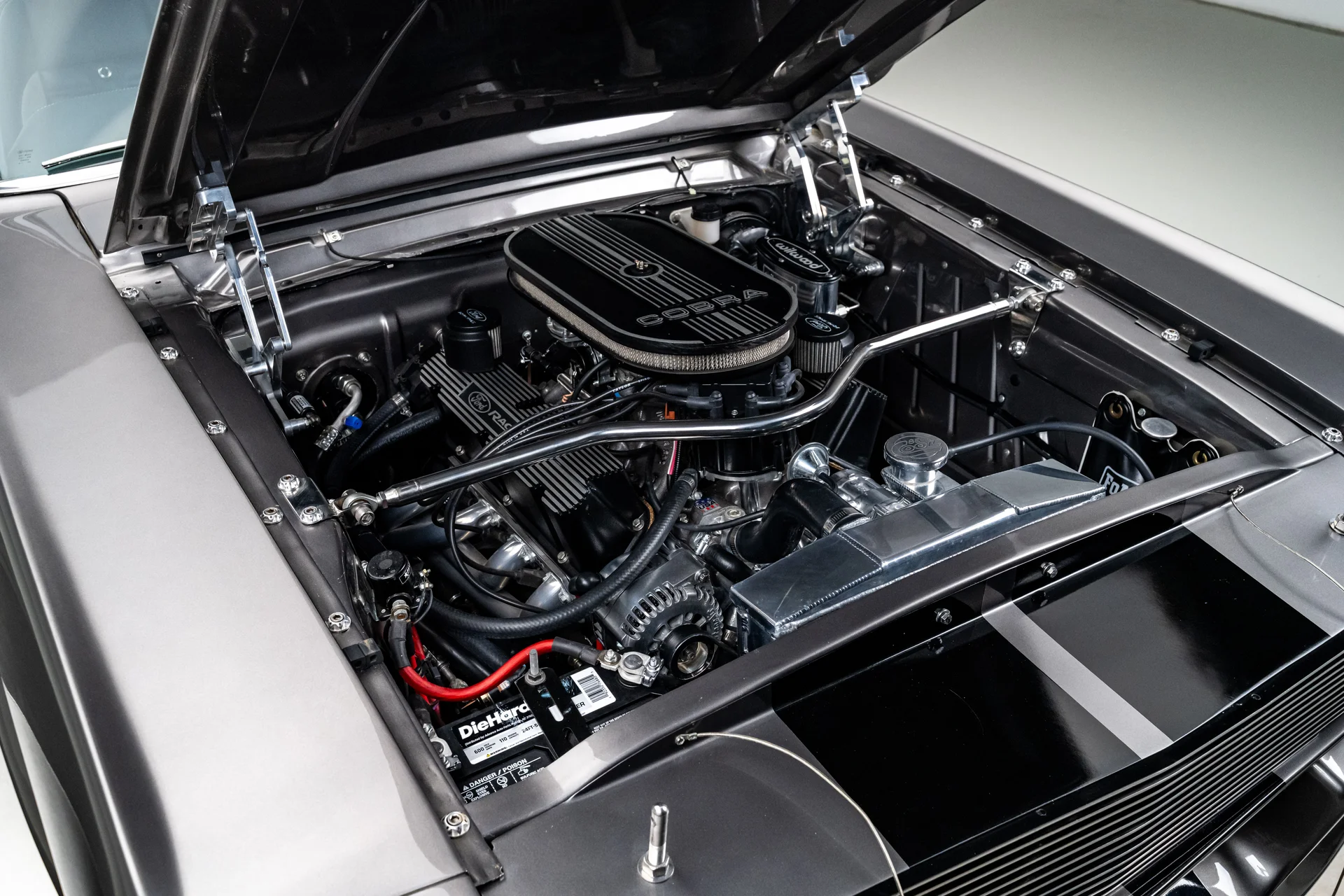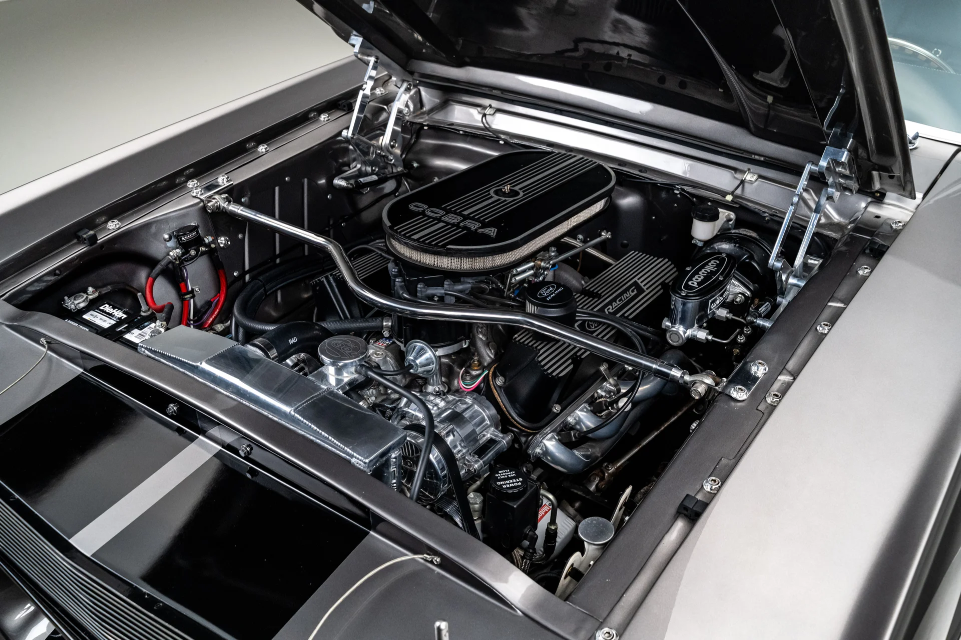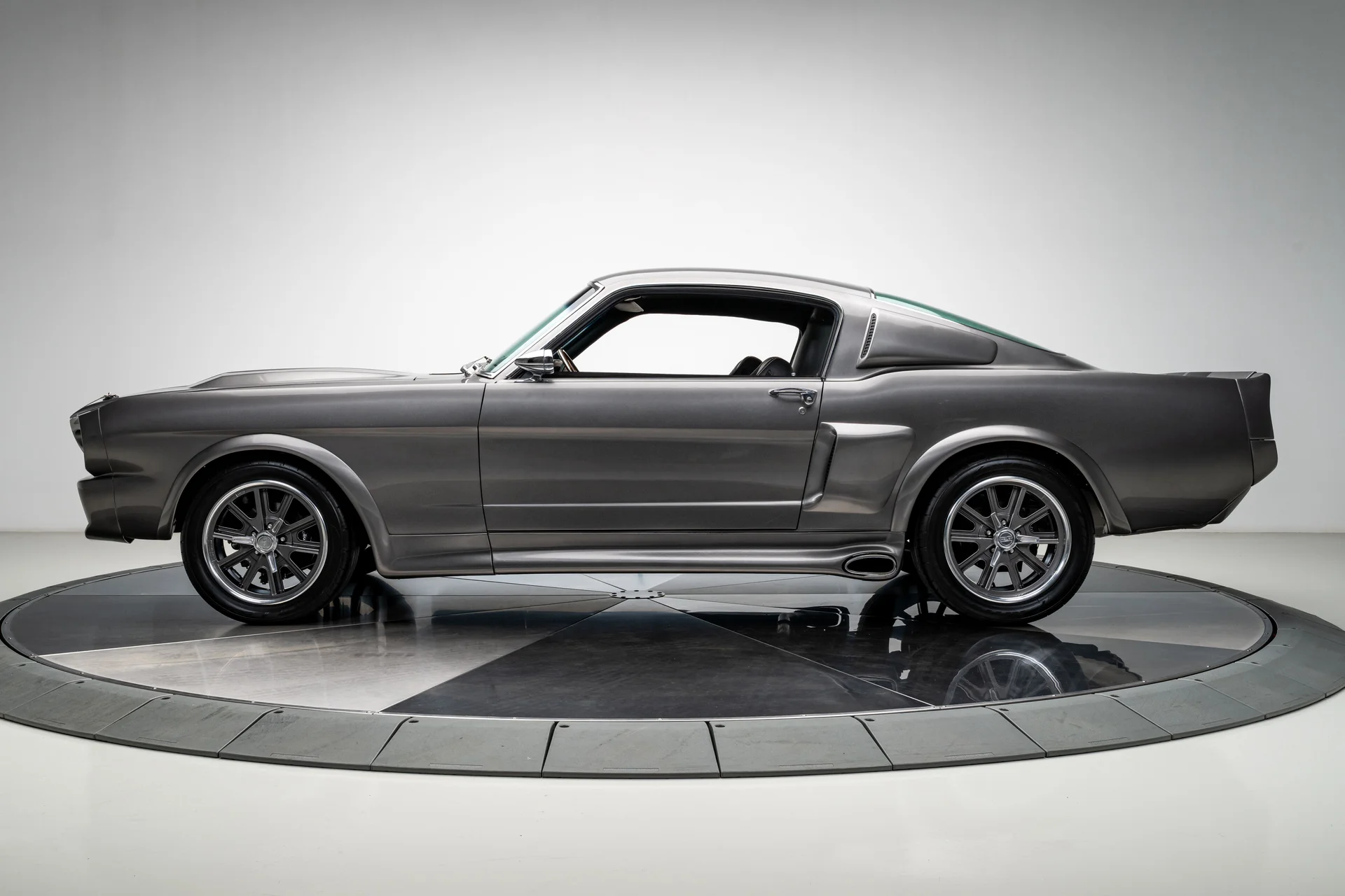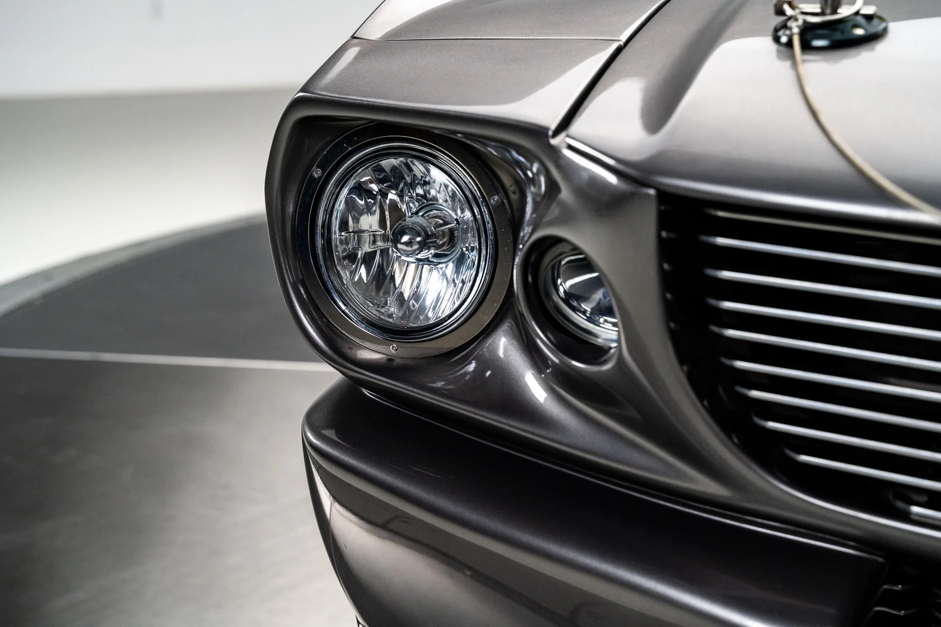 A carroceria ostenta um kit CJ Pony Parts estilo Eleanor que incorpora os icônicos para-choques dianteiro e traseiro, conferindo ao fastback uma postura mais agressiva e imponente sem perder as proporções clássicas do carro. Com acabamento em cinza Pepper Gray e faixas pretas pintadas, o carro apresenta um visual limpo e sinistro que se encaixa perfeitamente no tema Eleanor. Detalhes como as luzes da grade PIAA, os retrovisores laterais estilo bala, as lanternas traseiras de LED sequenciais e o inconfundível escapamento lateral reforçam a conexão com o carro do filme, enquanto as rodas American Racing Shelby Cobra calçadas com pneus de alta performance Nitto NT555 proporcionam uma presença robusta e pronta para as ruas.