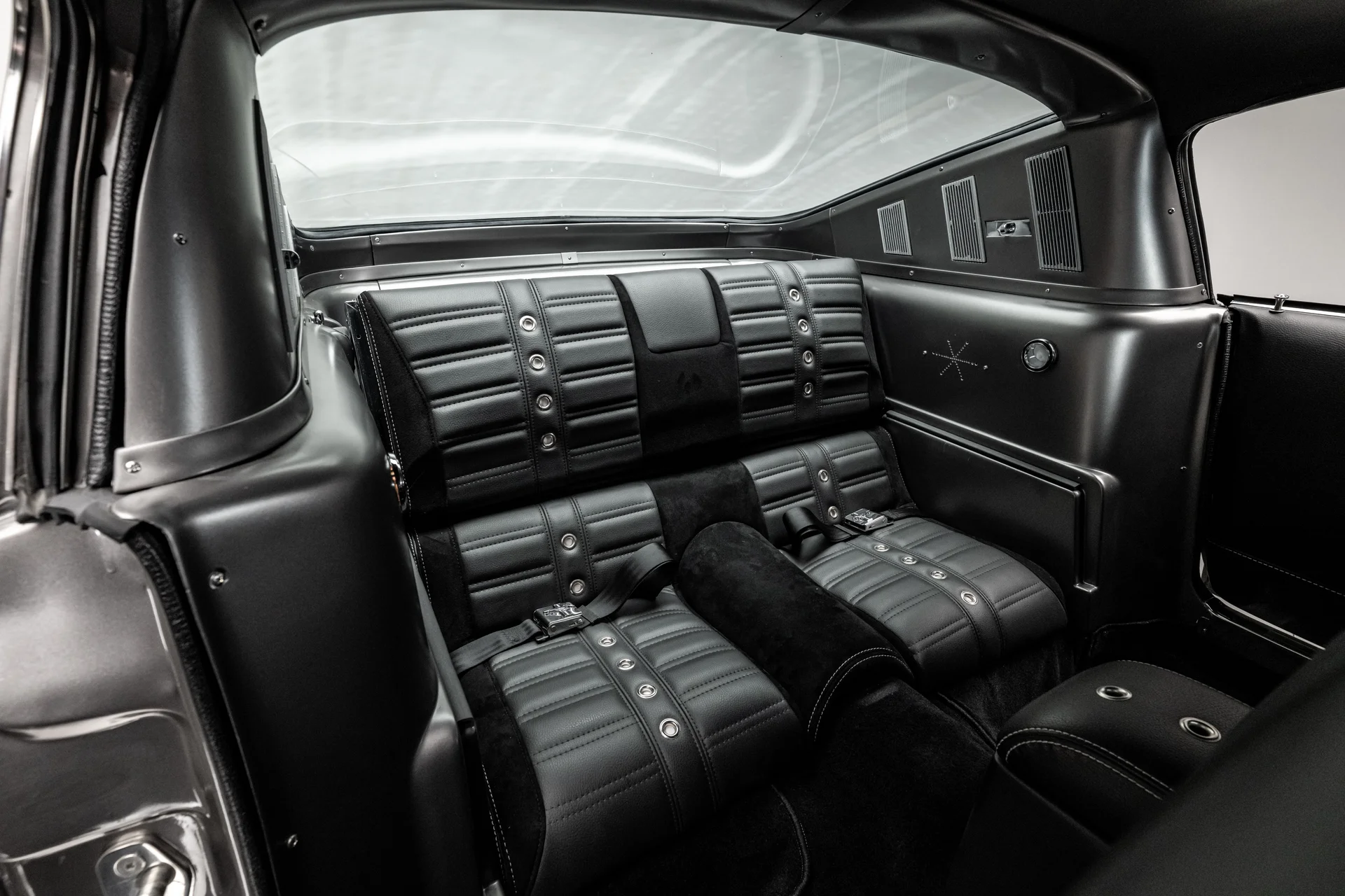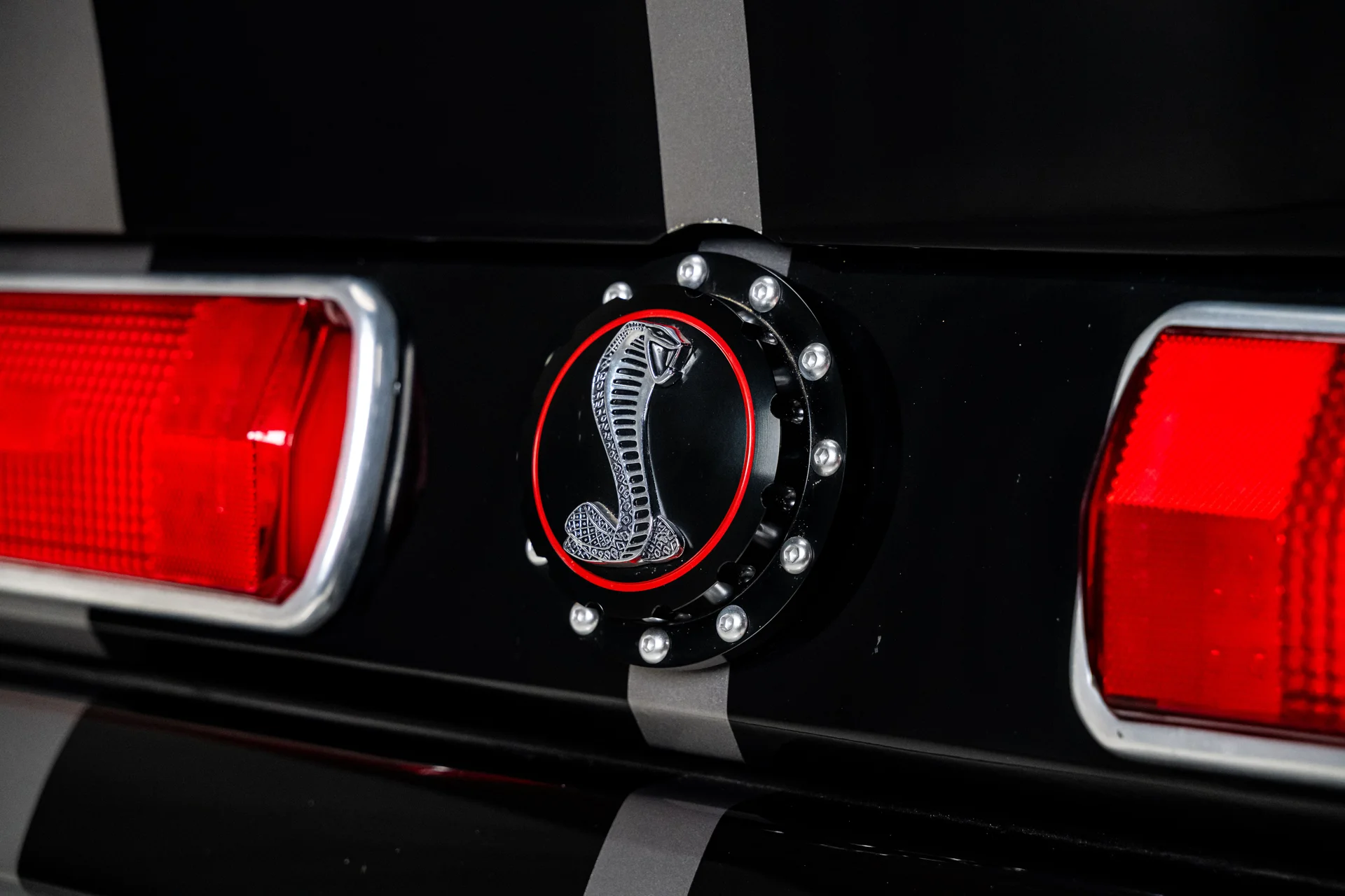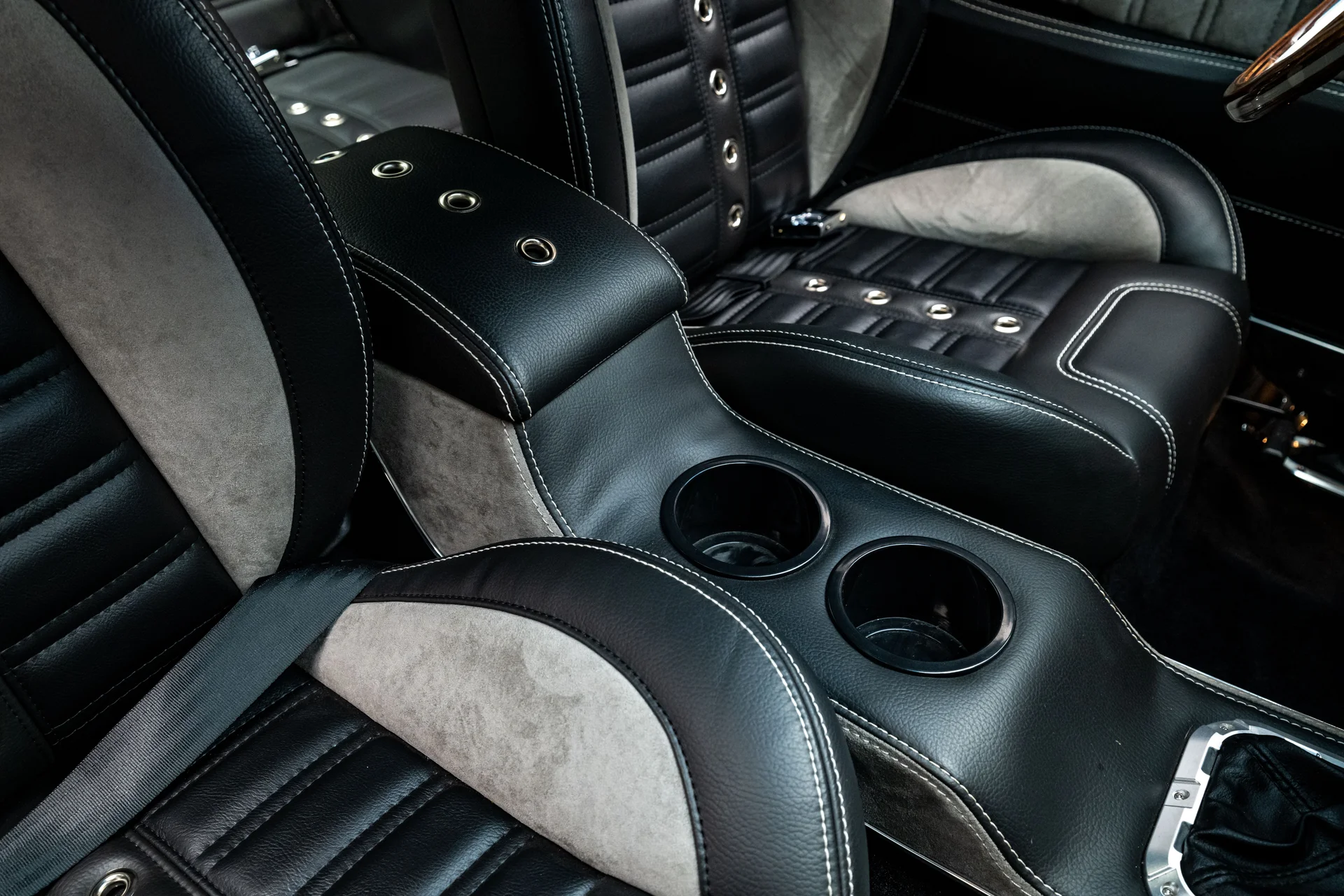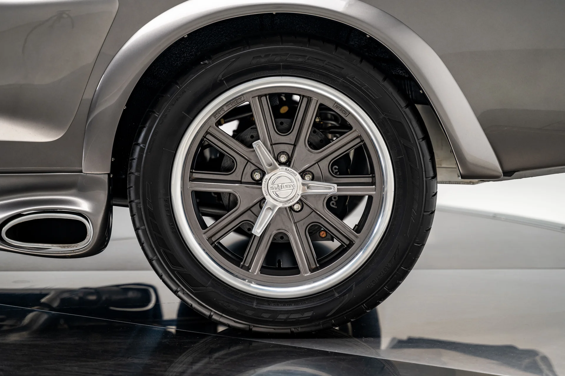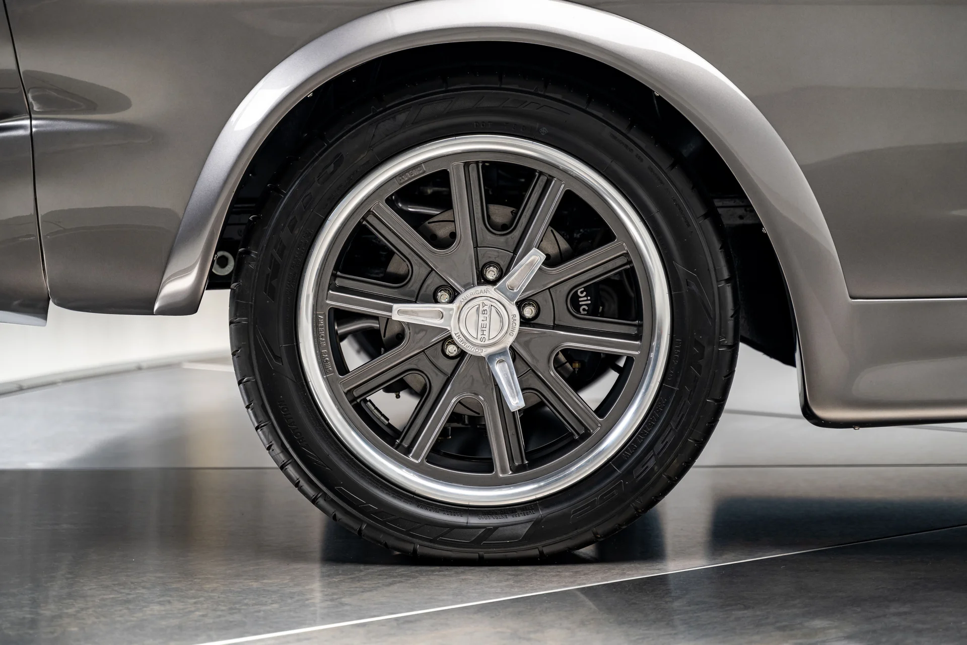 A carroceria ostenta um kit CJ Pony Parts estilo Eleanor que incorpora os icônicos para-choques dianteiro e traseiro, conferindo ao fastback uma postura mais agressiva e imponente sem perder as proporções clássicas do carro. Com acabamento em cinza Pepper Gray e faixas pretas pintadas, o carro apresenta um visual limpo e sinistro que se encaixa perfeitamente no tema Eleanor. Detalhes como as luzes da grade PIAA, os retrovisores laterais estilo bala, as lanternas traseiras de LED sequenciais e o inconfundível escapamento lateral reforçam a conexão com o carro do filme, enquanto as rodas American Racing Shelby Cobra calçadas com pneus de alta performance Nitto NT555 proporcionam uma presença robusta e pronta para as ruas.