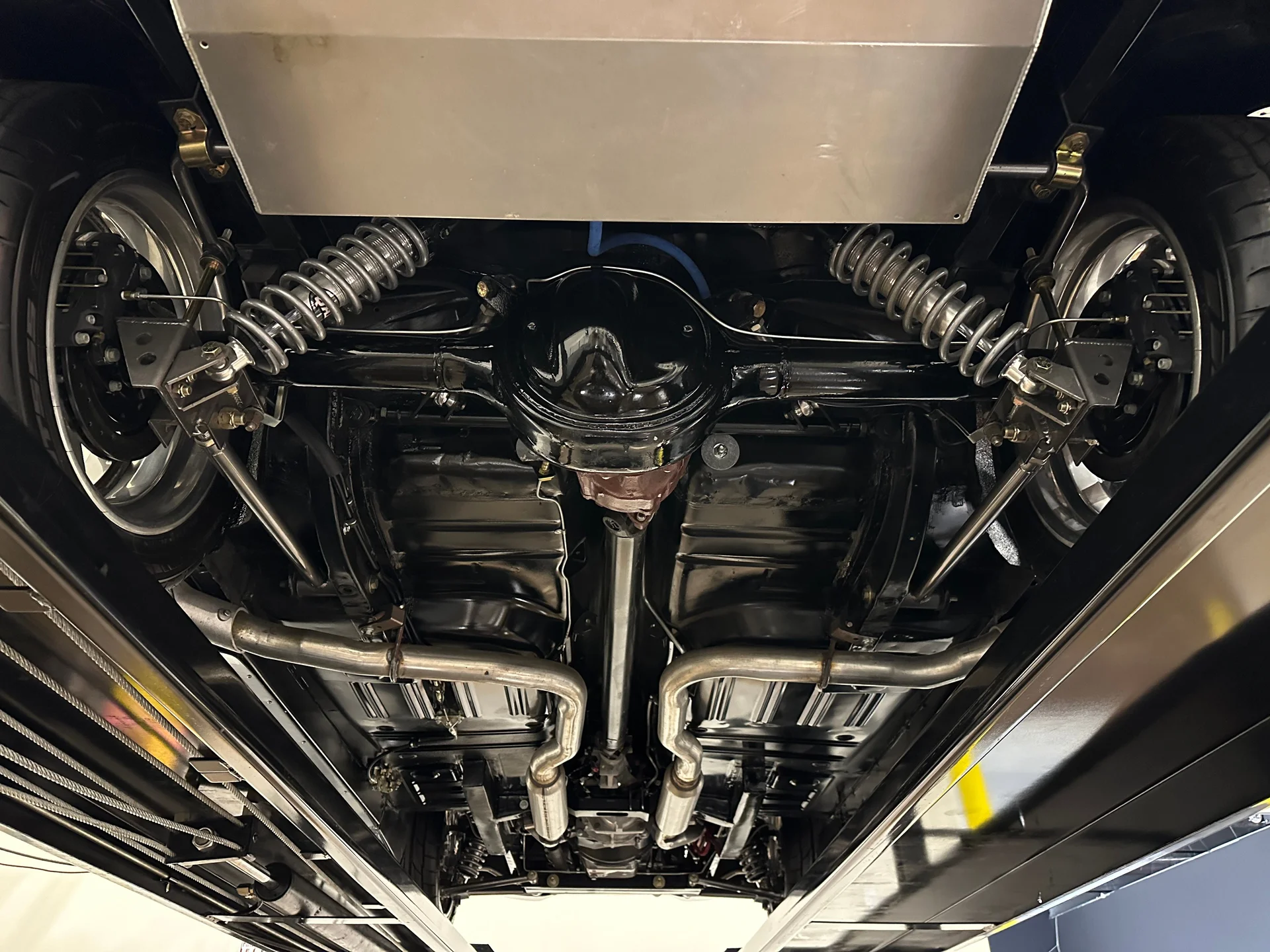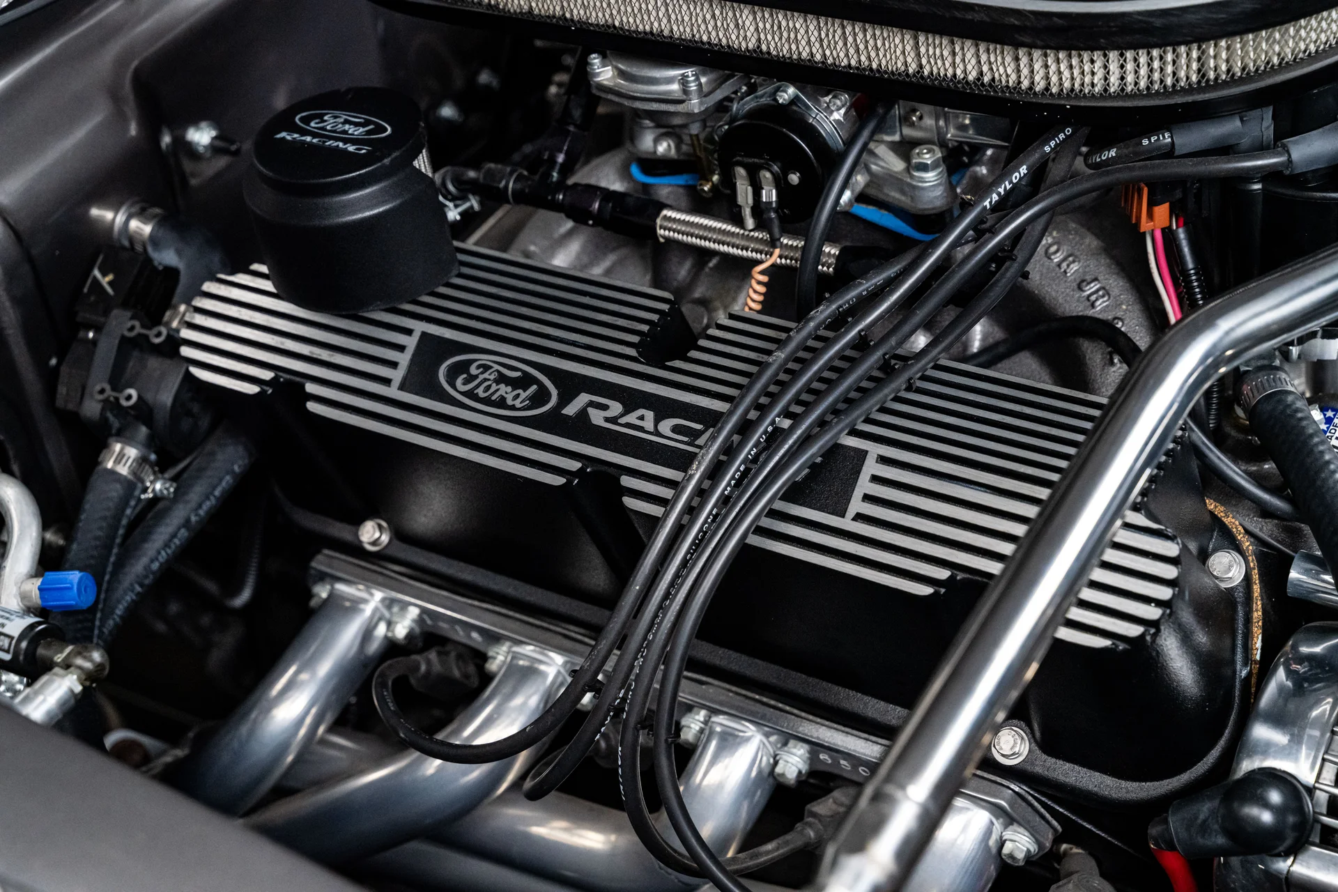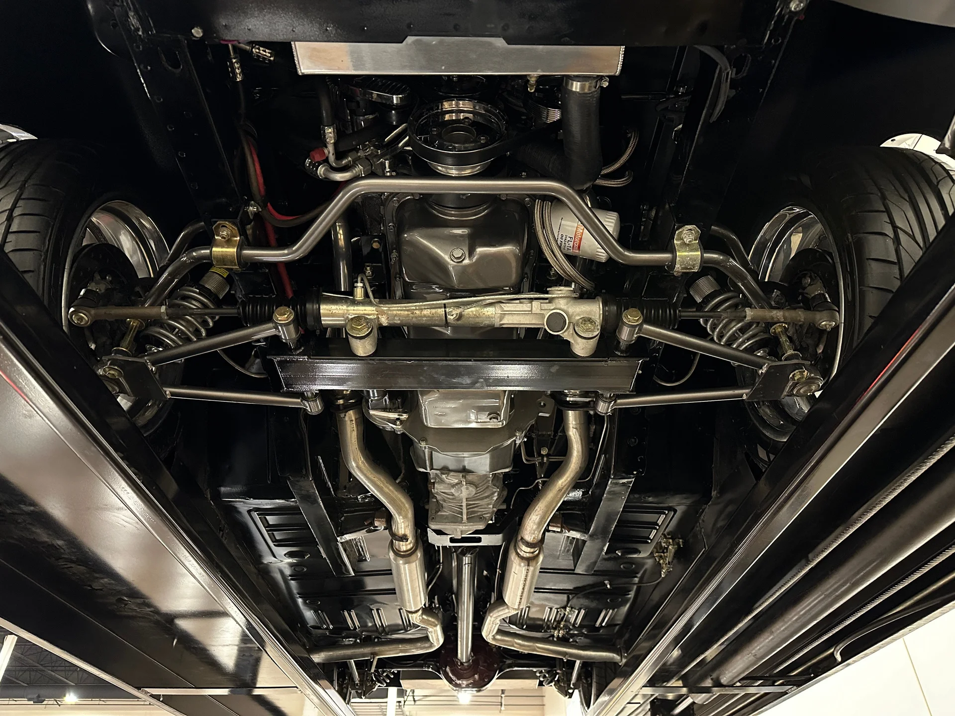Sob o capô, um motor V8 stroker de 347 polegadas cúbicas (5,7 litros) entrega a potência que o visual agressivo exige. Alimentado por um carburador de corpo quádruplo, o motor trabalha em conjunto com uma transmissão manual Tremec de 5 velocidades e envia a potência para um robusto eixo traseiro Ford 9″ equipado com relação 3.55 e diferencial de deslizamento limitado. A suspensão dianteira Mustang II aprimorada, juntamente com a direção hidráulica pinhão e cremalheira, proporciona respostas mais precisas, enquanto a suspensão traseira de quatro braços triangulados com amortecedores coilover QA1 ajustáveis nas quatro rodas ajuda a transferir a potência do motor para o asfalto. Um radiador de alumínio com ventoinhas elétricas mantém a temperatura sob controle, e os freios a disco Wilwood nas quatro rodas garantem uma frenagem confiável, à altura da autoridade do carro em linha reta.
