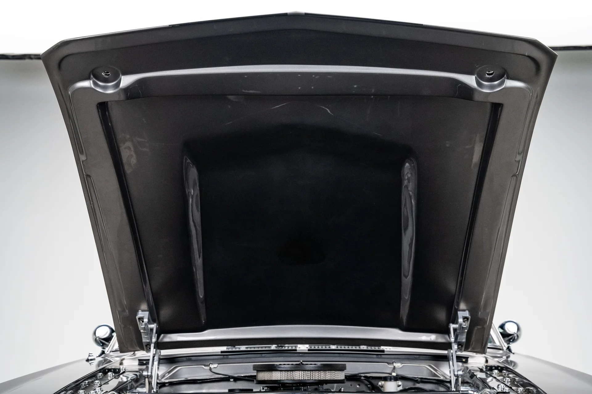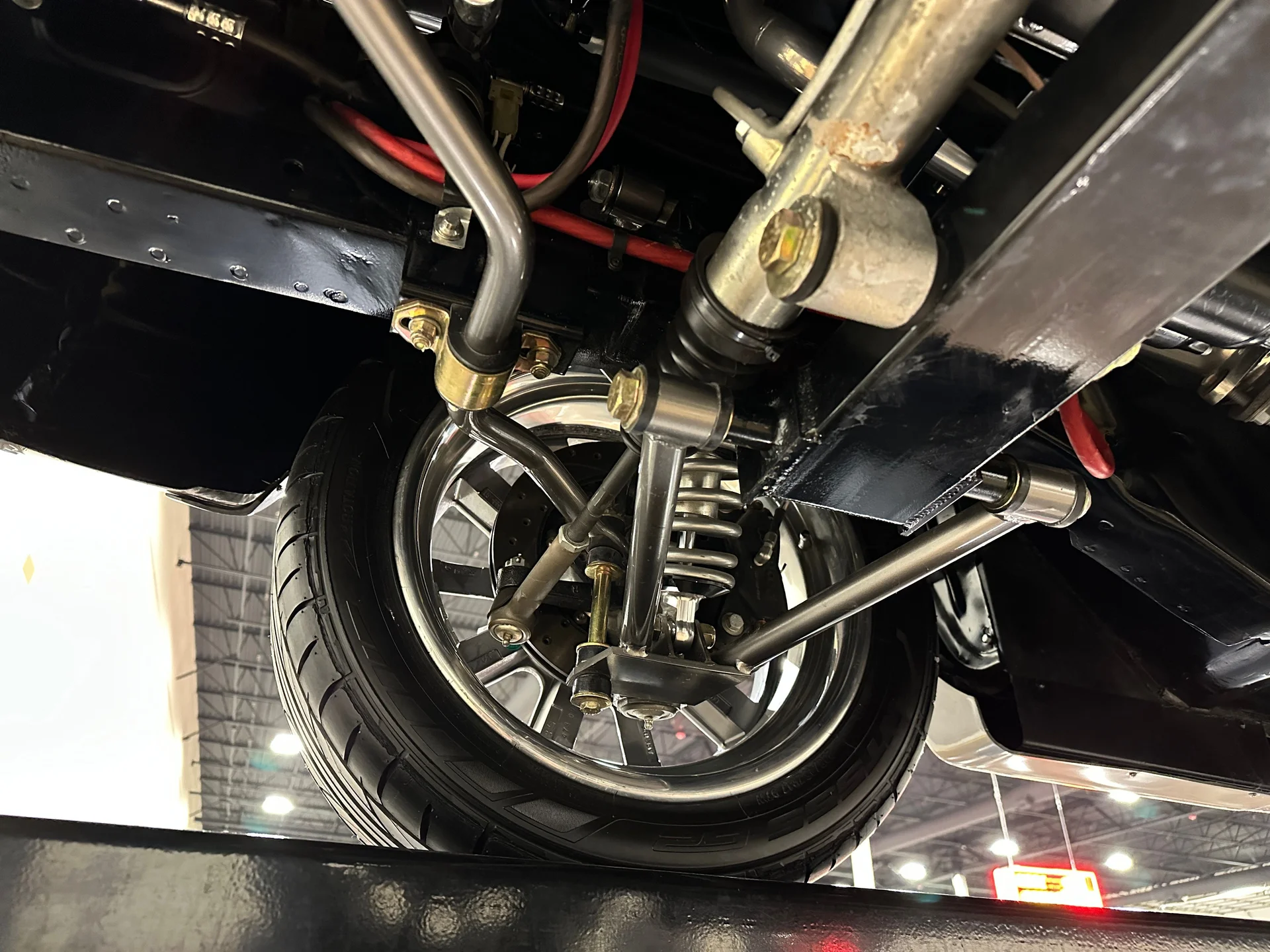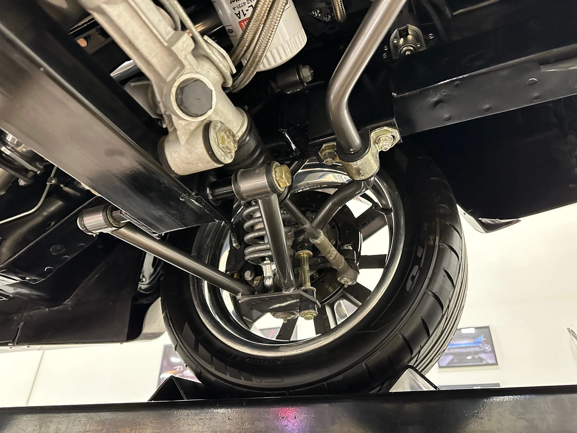 Sob o capô, um motor V8 stroker de 347 polegadas cúbicas (5,7 litros) entrega a potência que o visual agressivo exige. Alimentado por um carburador de corpo quádruplo, o motor trabalha em conjunto com uma transmissão manual Tremec de 5 velocidades e envia a potência para um robusto eixo traseiro Ford 9″ equipado com relação 3.55 e diferencial de deslizamento limitado. A suspensão dianteira Mustang II aprimorada, juntamente com a direção hidráulica pinhão e cremalheira, proporciona respostas mais precisas, enquanto a suspensão traseira de quatro braços triangulados com amortecedores coilover QA1 ajustáveis nas quatro rodas ajuda a transferir a potência do motor para o asfalto. Um radiador de alumínio com ventoinhas elétricas mantém a temperatura sob controle, e os freios a disco Wilwood nas quatro rodas garantem uma frenagem confiável, à altura da autoridade do carro em linha reta.