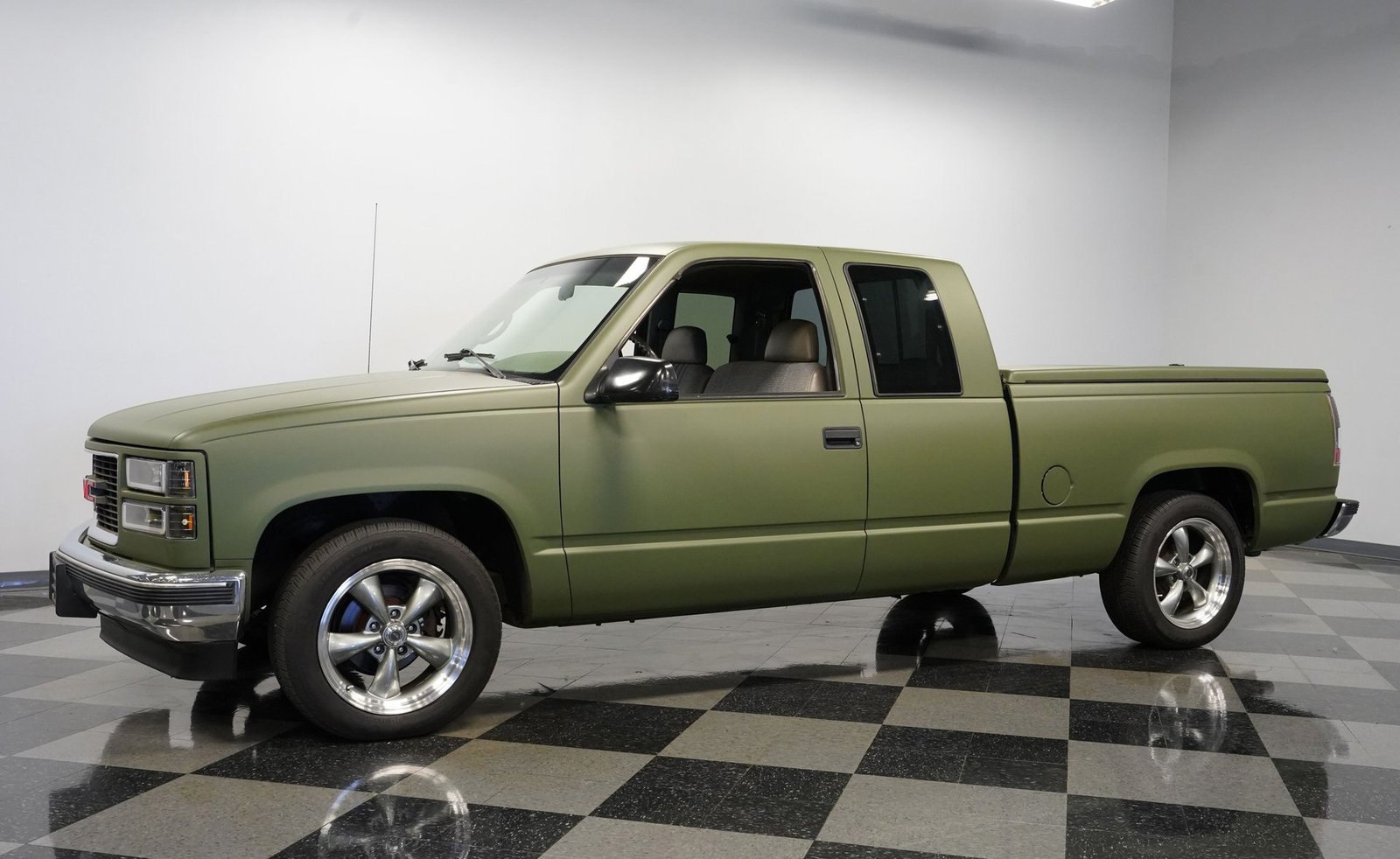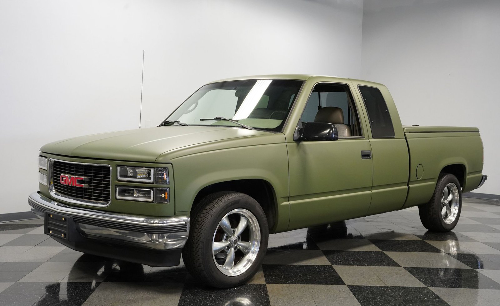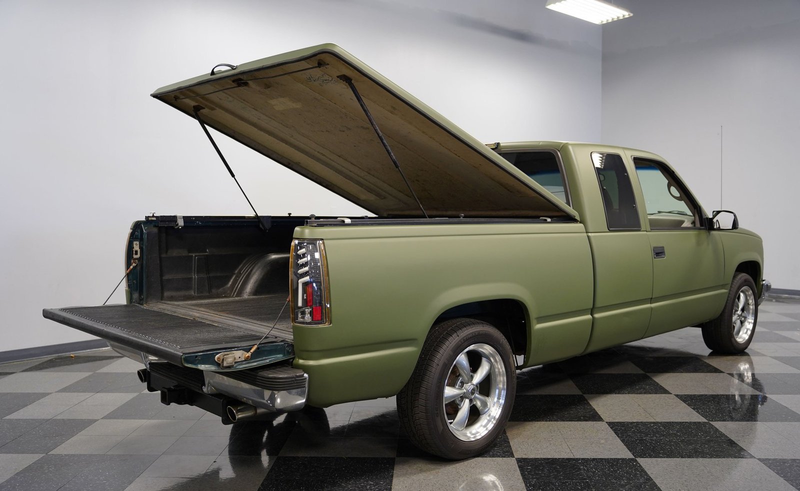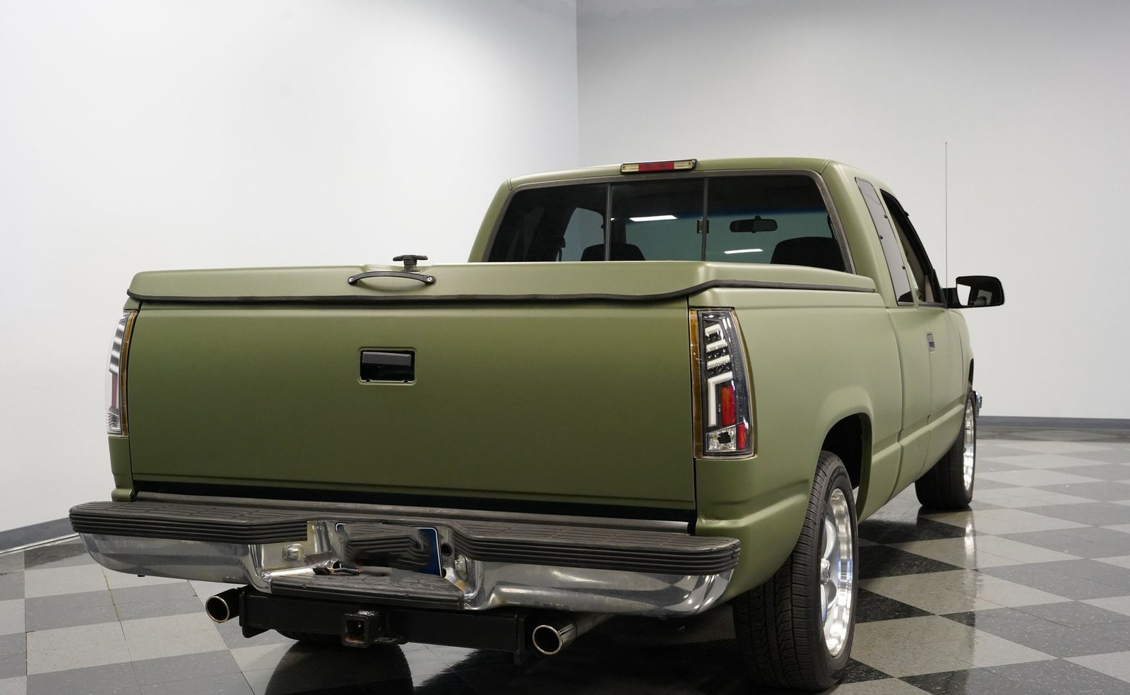 O envelopamento em vinil verde fosco, inspirado no estilo militar, confere a esta GMC Sierra 1500 Cabine Estendida de 1995 uma presença inconfundível, seja nas ruas ou no trabalho. A ousada escolha da cor combina excepcionalmente bem com as linhas angulares da carroceria e o perfil da cabine estendida. As rodas American Racing de 18 polegadas proporcionam uma postura mais imponente, calçadas com pneus robustos 245/55R18 para melhor aderência e apelo visual. A capota rígida da caçamba adiciona praticidade para o transporte de equipamentos, mantendo as linhas limpas da frente à traseira. Faróis e lanternas traseiras personalizados trazem tecnologia de iluminação moderna, enquanto as ponteiras de escape cromadas duplas espreitam sob a traseira, sugerindo o ronco do motor V8 que esta picape produz quando você pisa no acelerador.