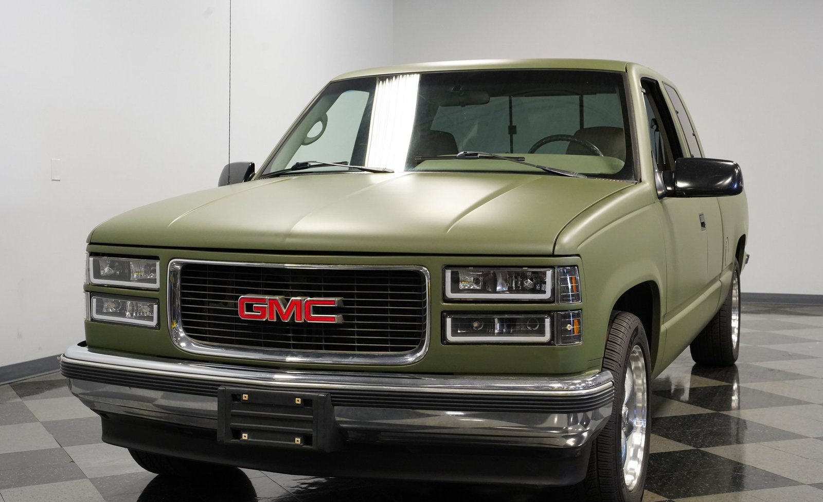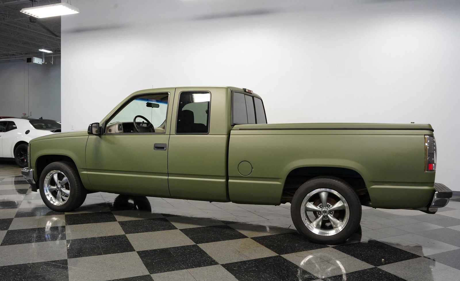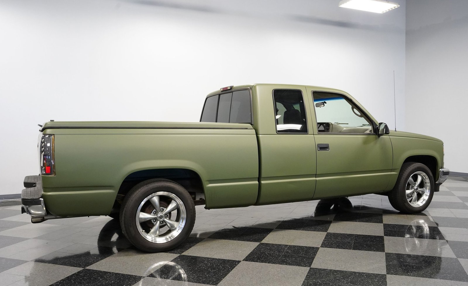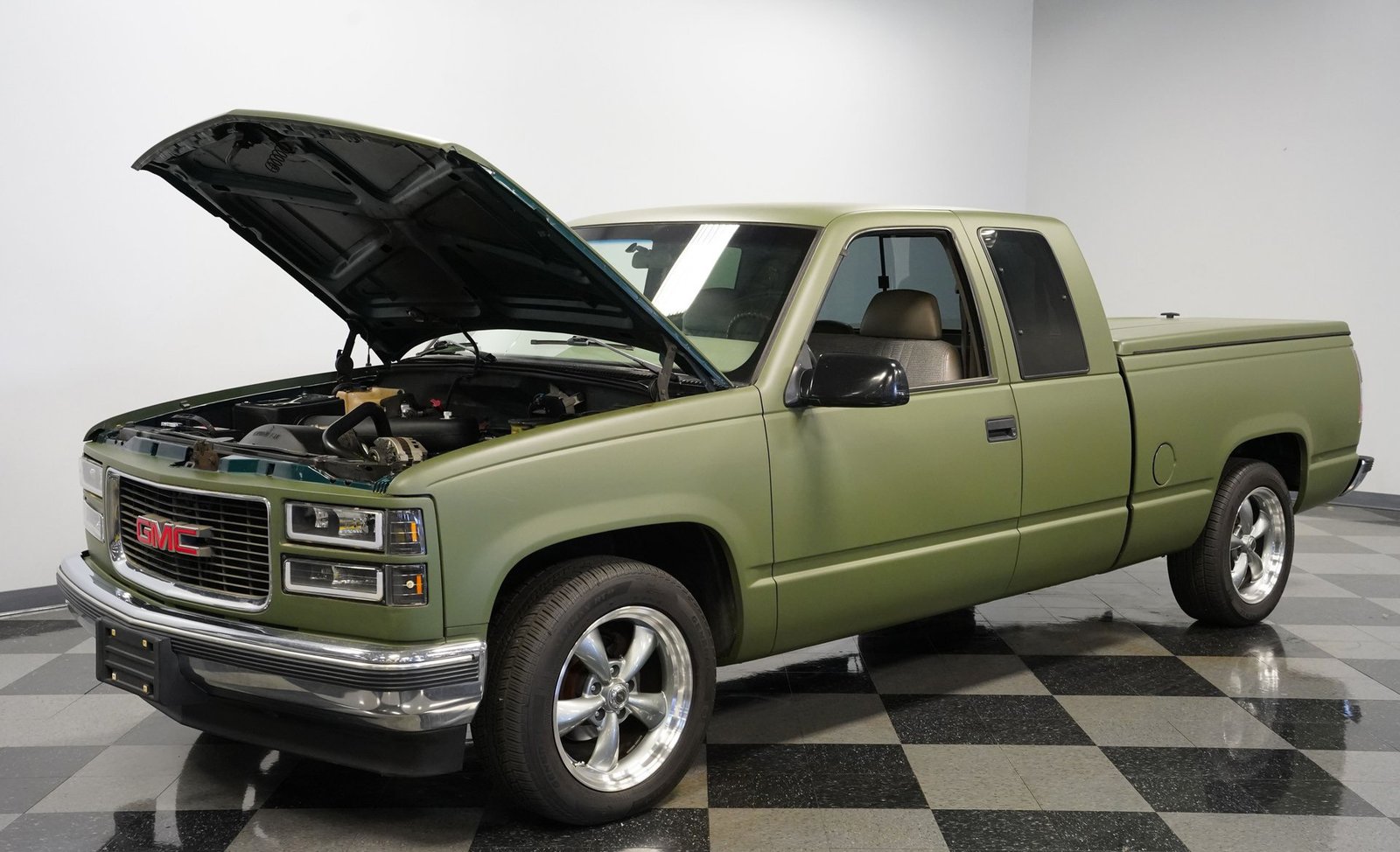 O envelopamento em vinil verde fosco, inspirado no estilo militar, confere a esta GMC Sierra 1500 Cabine Estendida de 1995 uma presença inconfundível, seja nas ruas ou no trabalho. A ousada escolha da cor combina excepcionalmente bem com as linhas angulares da carroceria e o perfil da cabine estendida. As rodas American Racing de 18 polegadas proporcionam uma postura mais imponente, calçadas com pneus robustos 245/55R18 para melhor aderência e apelo visual. A capota rígida da caçamba adiciona praticidade para o transporte de equipamentos, mantendo as linhas limpas da frente à traseira. Faróis e lanternas traseiras personalizados trazem tecnologia de iluminação moderna, enquanto as ponteiras de escape cromadas duplas espreitam sob a traseira, sugerindo o ronco do motor V8 que esta picape produz quando você pisa no acelerador.
