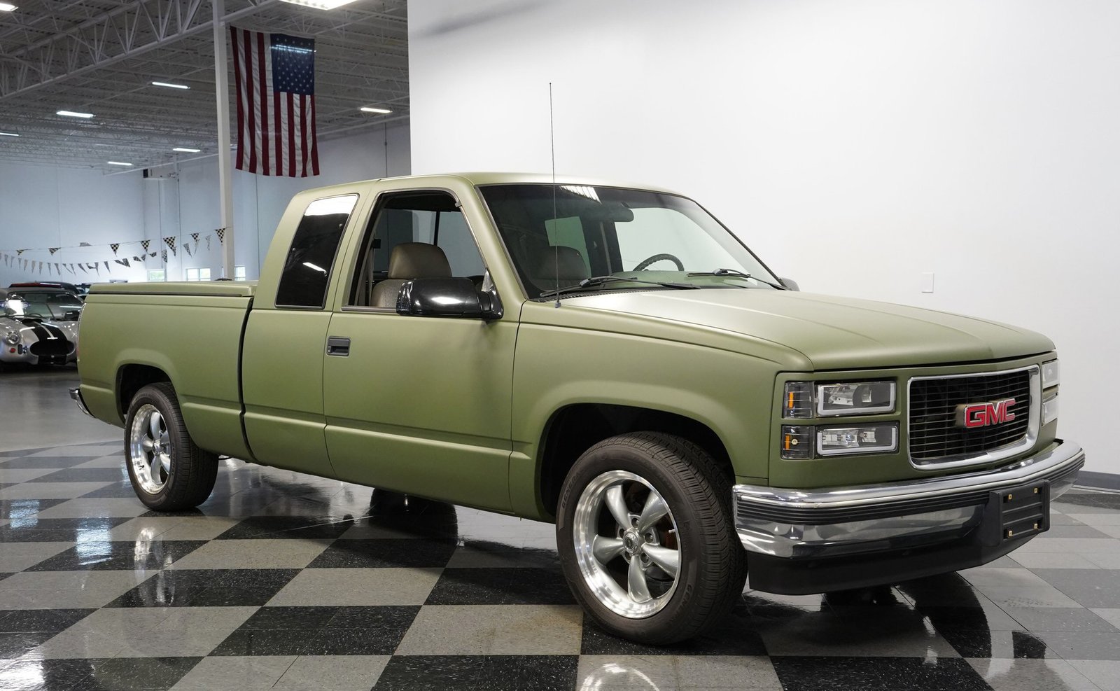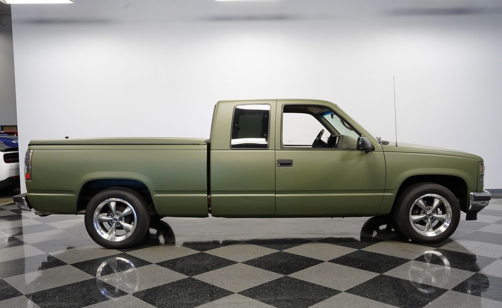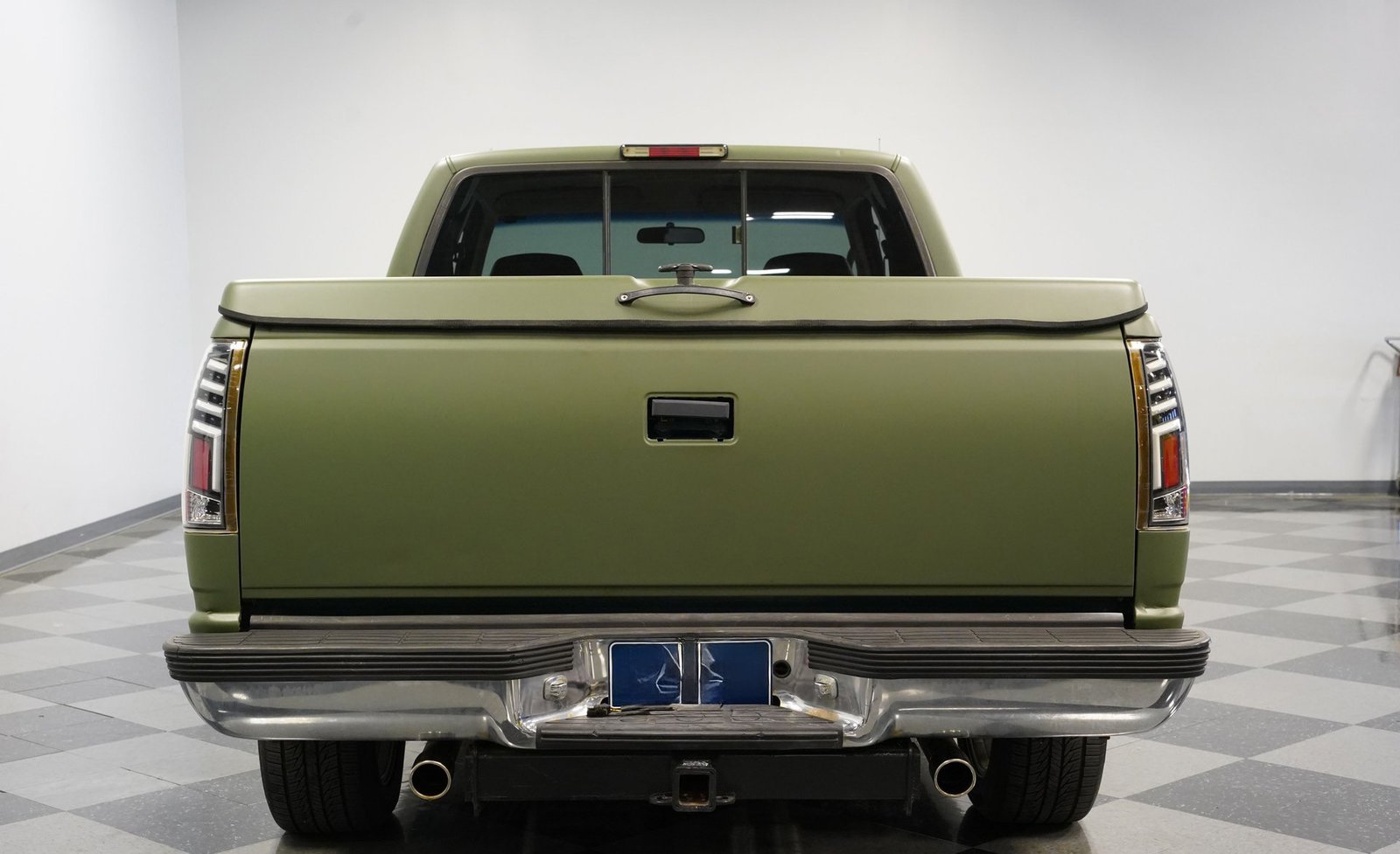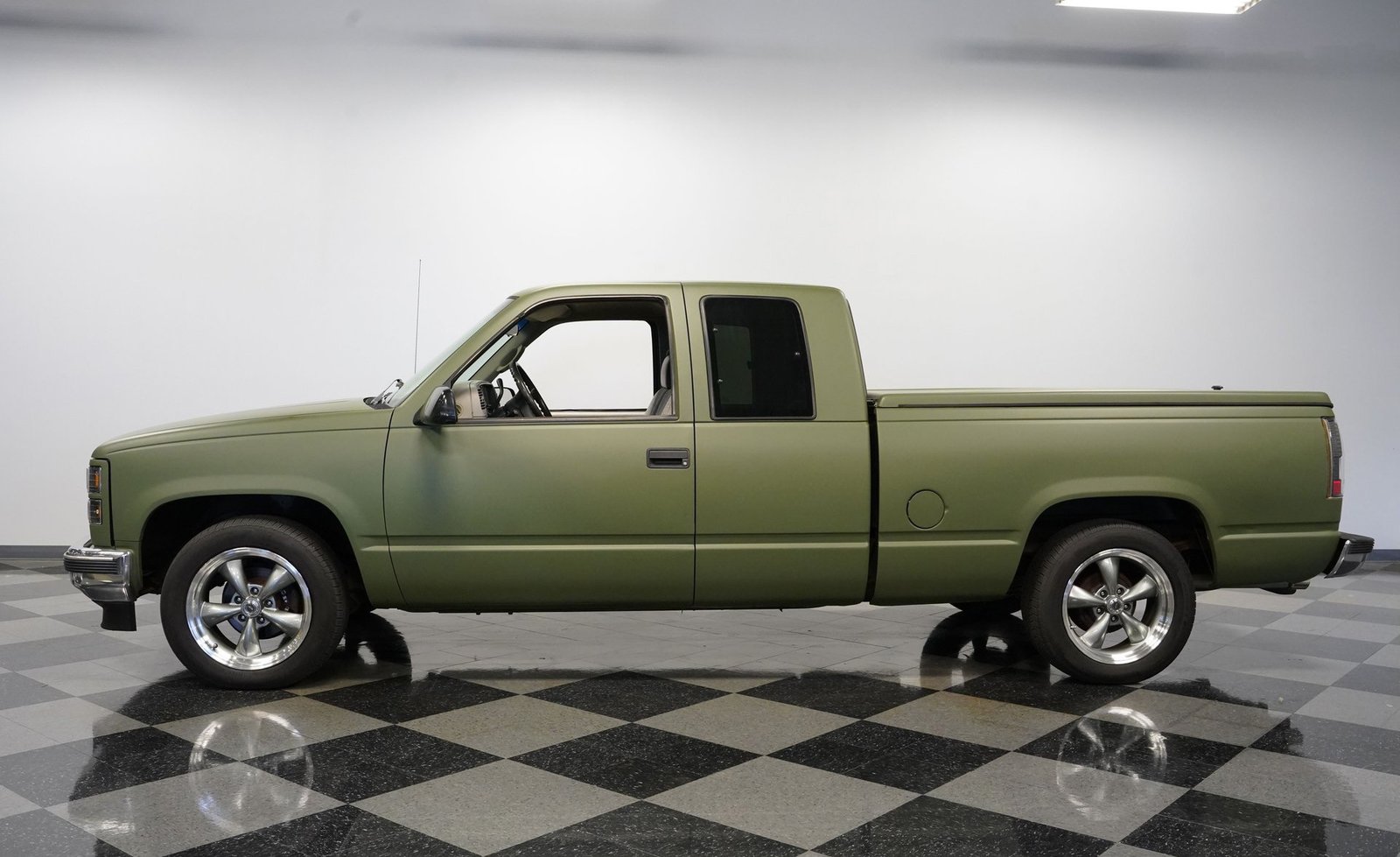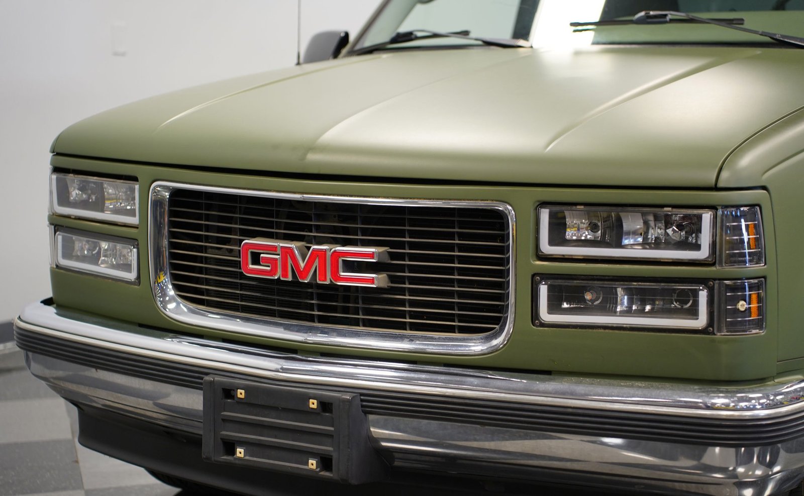 O envelopamento em vinil verde fosco, inspirado no estilo militar, confere a esta GMC Sierra 1500 Cabine Estendida de 1995 uma presença inconfundível, seja nas ruas ou no trabalho. A ousada escolha da cor combina excepcionalmente bem com as linhas angulares da carroceria e o perfil da cabine estendida. As rodas American Racing de 18 polegadas proporcionam uma postura mais imponente, calçadas com pneus robustos 245/55R18 para melhor aderência e apelo visual. A capota rígida da caçamba adiciona praticidade para o transporte de equipamentos, mantendo as linhas limpas da frente à traseira. Faróis e lanternas traseiras personalizados trazem tecnologia de iluminação moderna, enquanto as ponteiras de escape cromadas duplas espreitam sob a traseira, sugerindo o ronco do motor V8 que esta picape produz quando você pisa no acelerador.