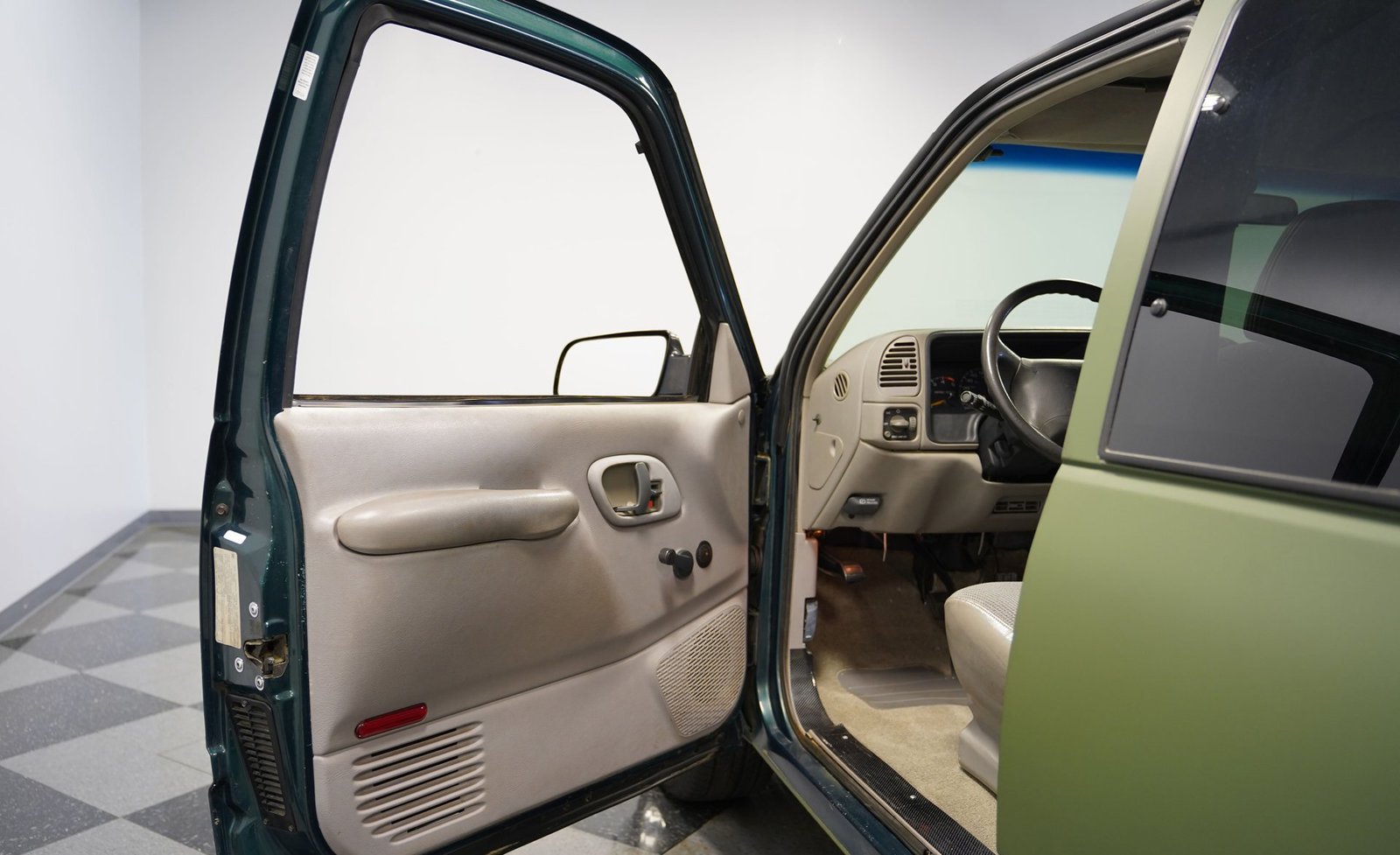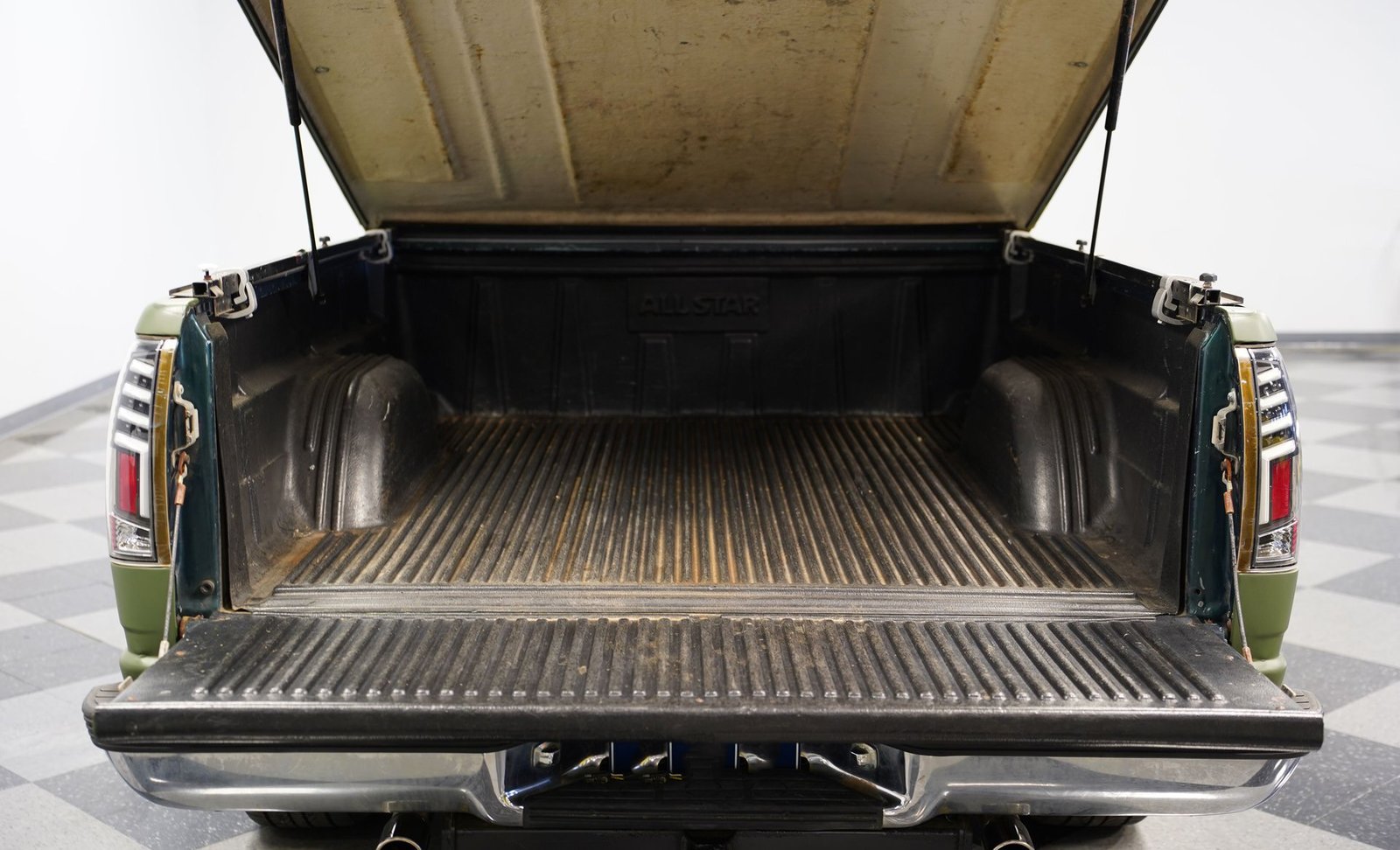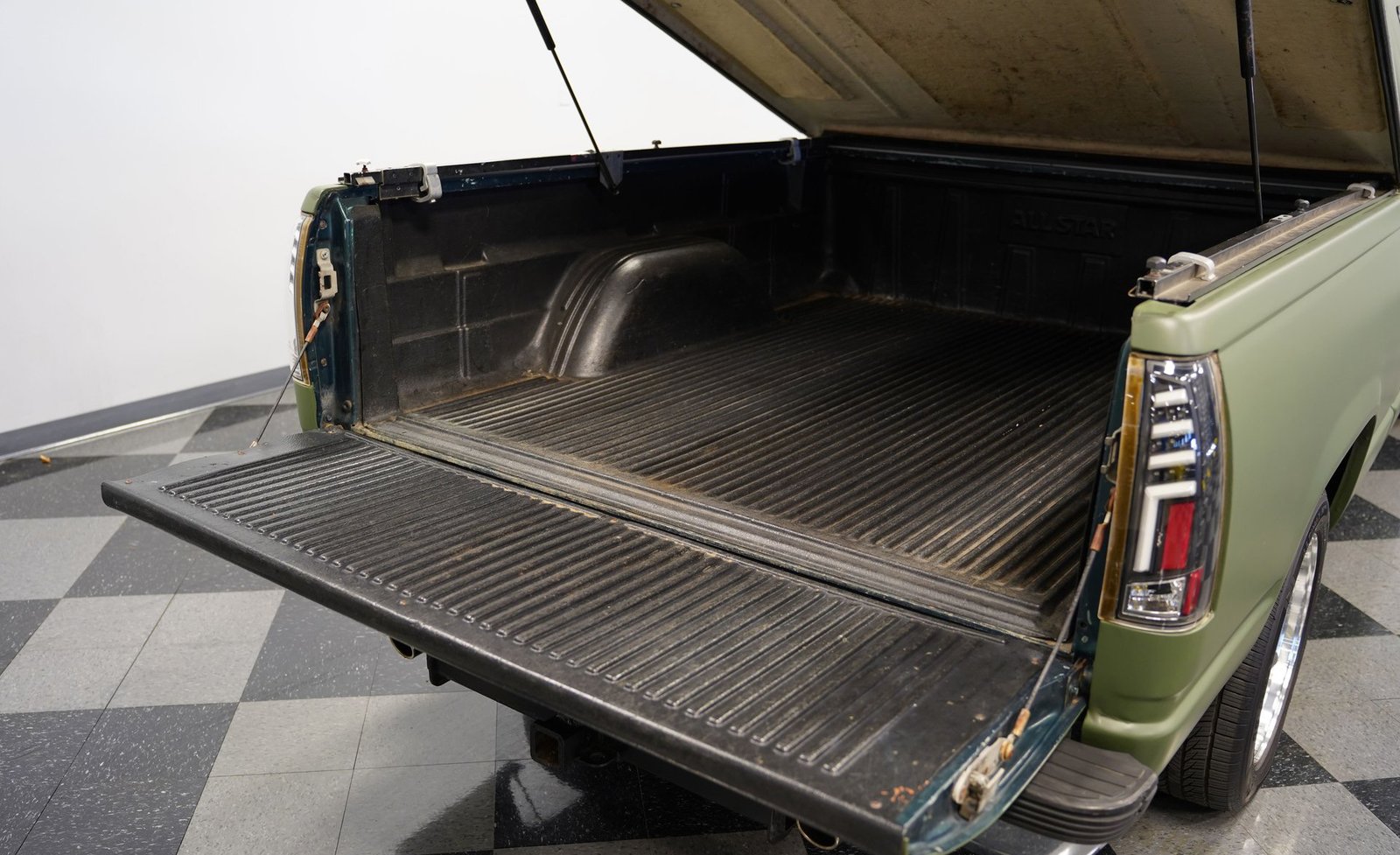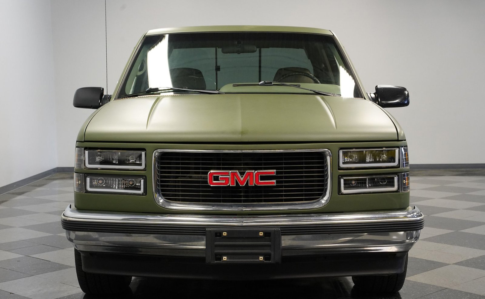 O envelopamento em vinil verde fosco, inspirado no estilo militar, confere a esta GMC Sierra 1500 Cabine Estendida de 1995 uma presença inconfundível, seja nas ruas ou no trabalho. A ousada escolha da cor combina excepcionalmente bem com as linhas angulares da carroceria e o perfil da cabine estendida. As rodas American Racing de 18 polegadas proporcionam uma postura mais imponente, calçadas com pneus robustos 245/55R18 para melhor aderência e apelo visual. A capota rígida da caçamba adiciona praticidade para o transporte de equipamentos, mantendo as linhas limpas da frente à traseira. Faróis e lanternas traseiras personalizados trazem tecnologia de iluminação moderna, enquanto as ponteiras de escape cromadas duplas espreitam sob a traseira, sugerindo o ronco do motor V8 que esta picape produz quando você pisa no acelerador.