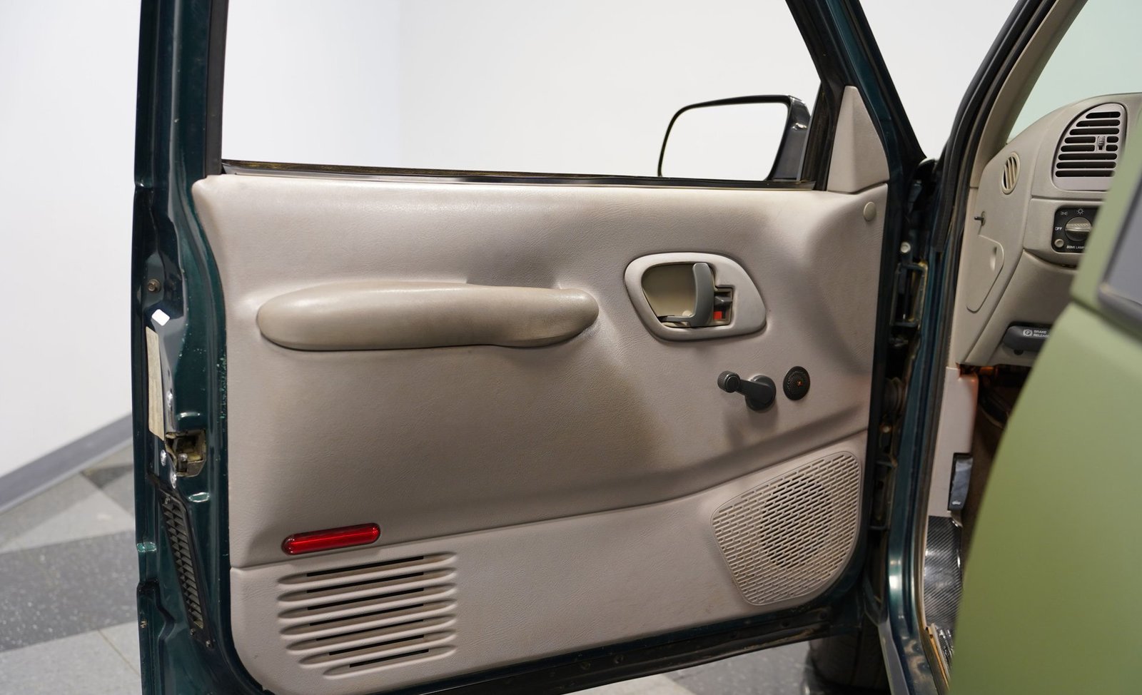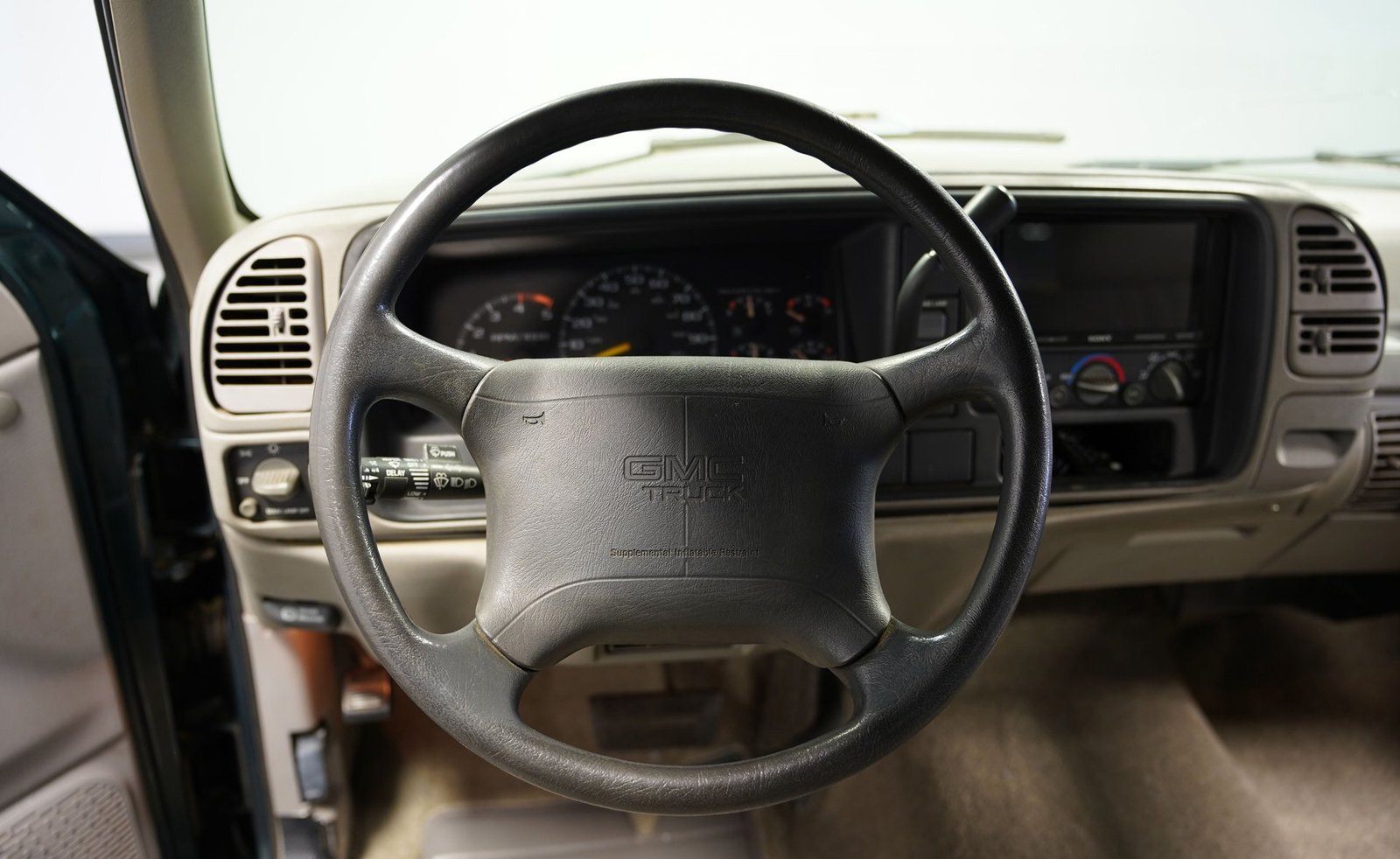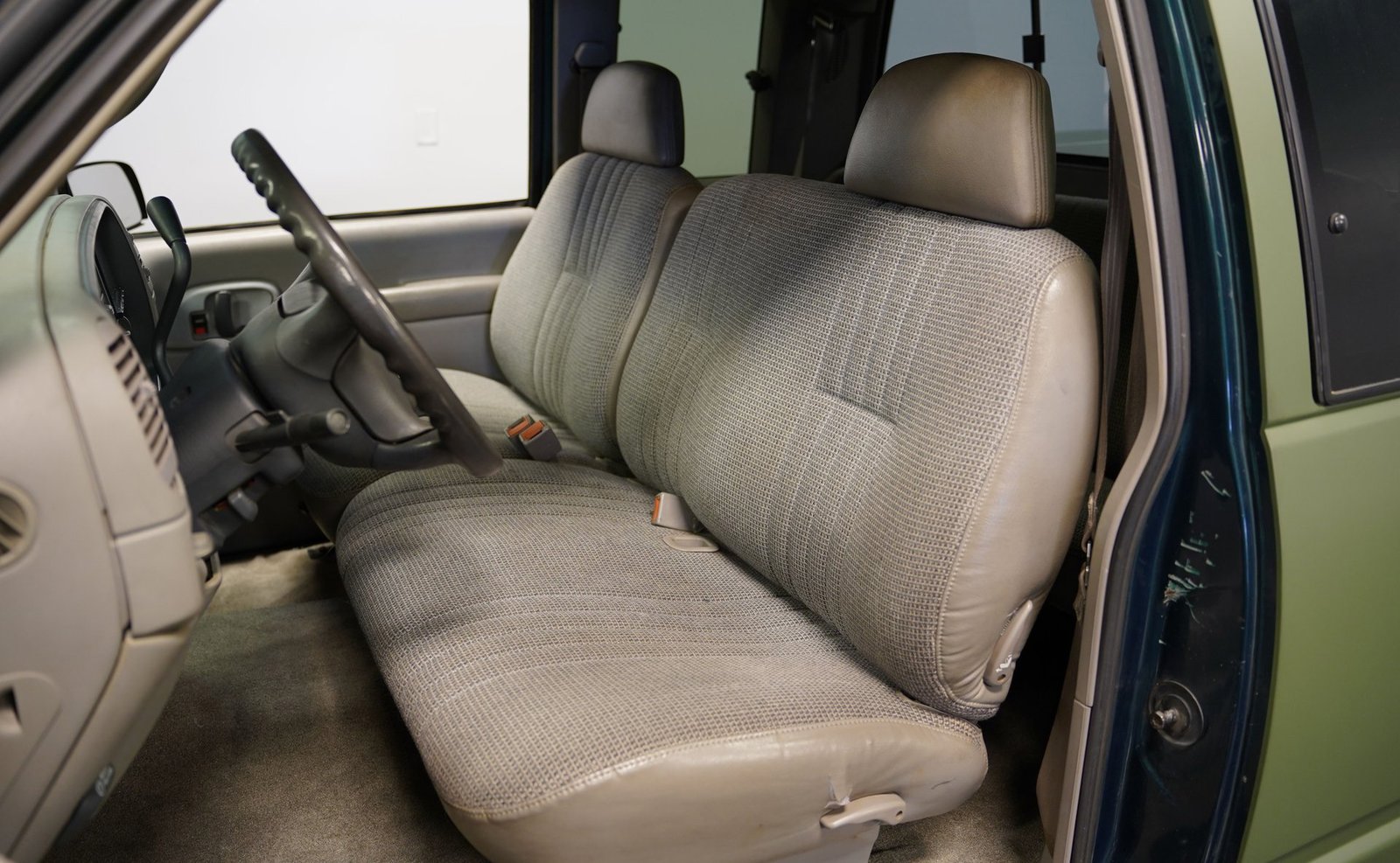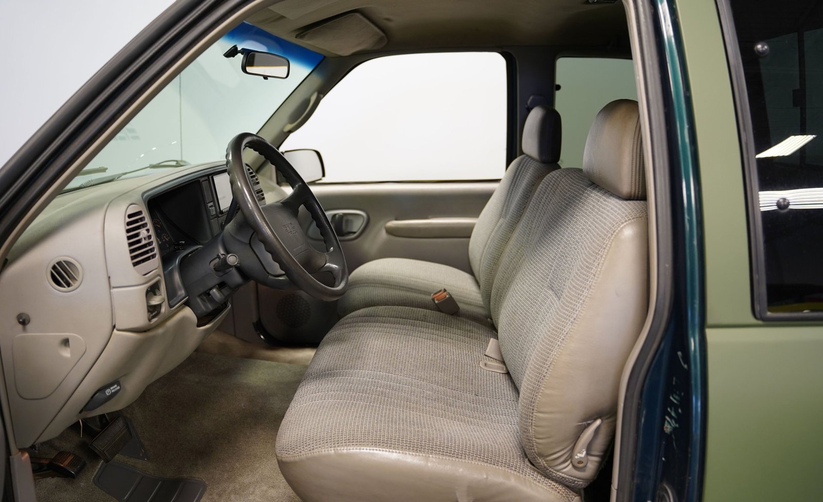 O envelopamento em vinil verde fosco, inspirado no estilo militar, confere a esta GMC Sierra 1500 Cabine Estendida de 1995 uma presença inconfundível, seja nas ruas ou no trabalho. A ousada escolha da cor combina excepcionalmente bem com as linhas angulares da carroceria e o perfil da cabine estendida. As rodas American Racing de 18 polegadas proporcionam uma postura mais imponente, calçadas com pneus robustos 245/55R18 para melhor aderência e apelo visual. A capota rígida da caçamba adiciona praticidade para o transporte de equipamentos, mantendo as linhas limpas da frente à traseira. Faróis e lanternas traseiras personalizados trazem tecnologia de iluminação moderna, enquanto as ponteiras de escape cromadas duplas espreitam sob a traseira, sugerindo o ronco do motor V8 que esta picape produz quando você pisa no acelerador.