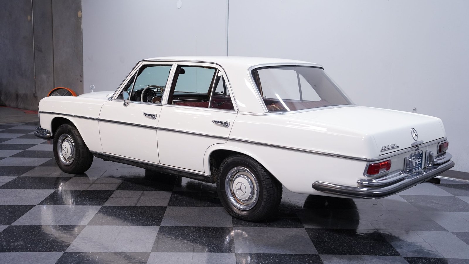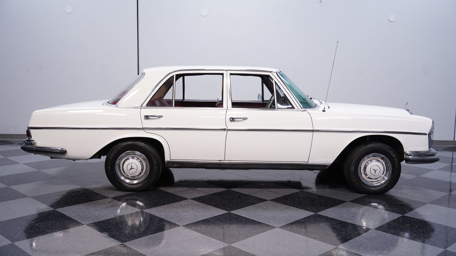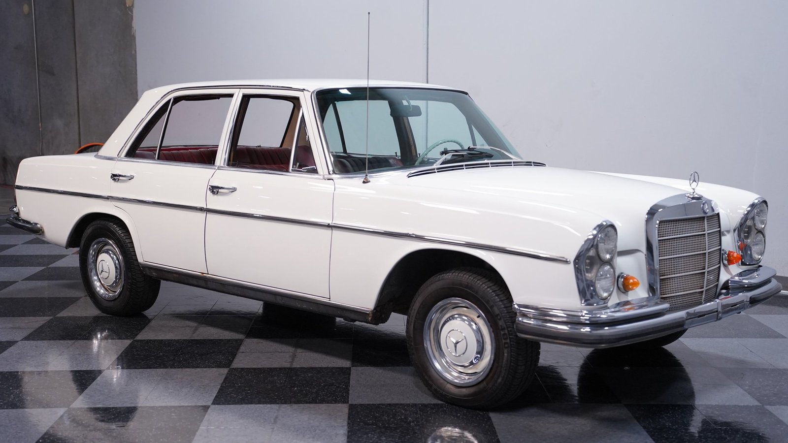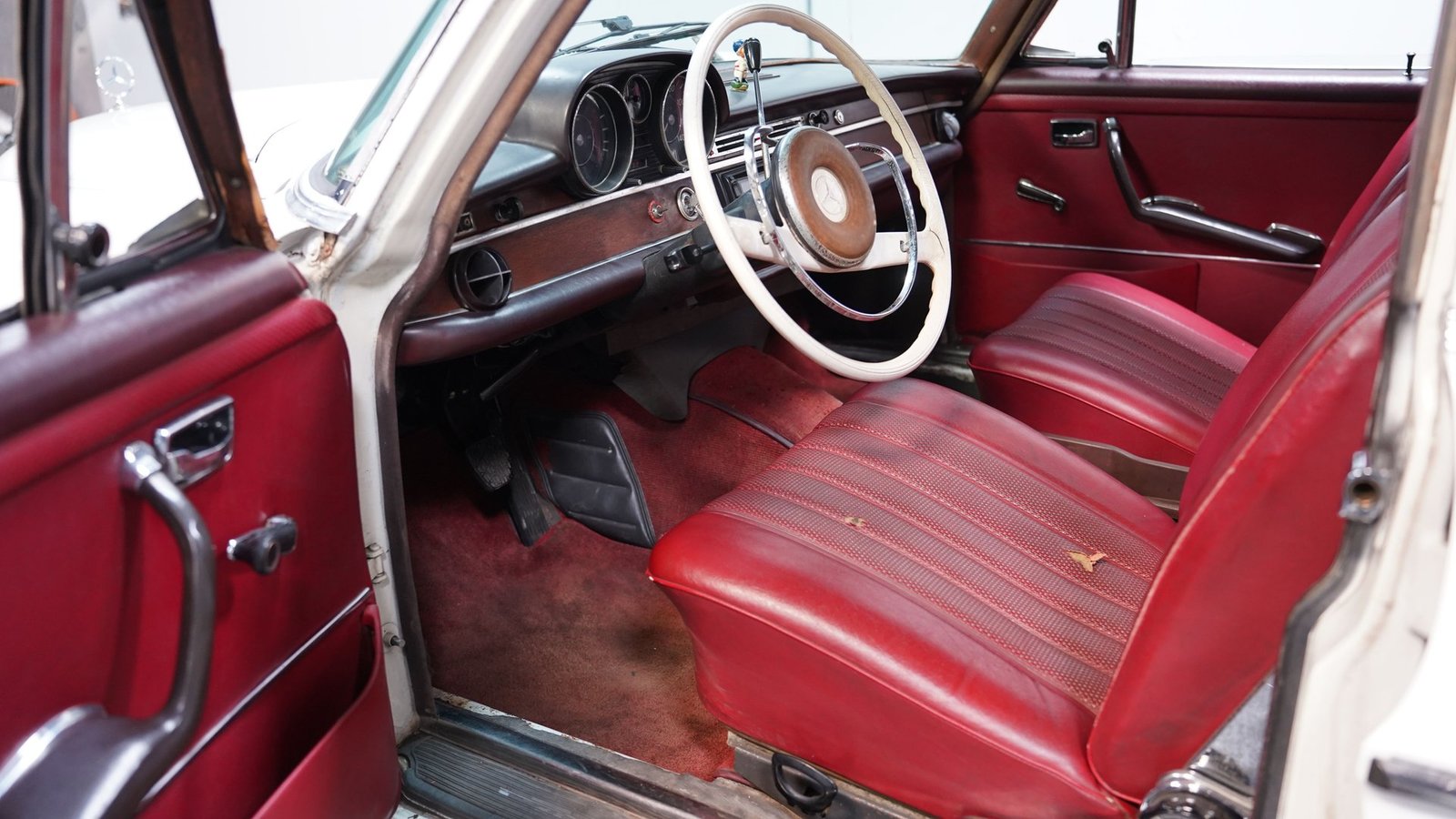 O interior em couro vermelho original combina perfeitamente com a cor externa Branco Papyrus. Os instrumentos estão em bom estado, assim como o controle do ar-condicionado e os painéis das portas. O painel parece ser o ponto alto do interior deste Mercedes. Este carro, como a maioria dos modelos da década de 60, possui um porta-malas espaçoso com bastante lugar para o que você precisar, e ainda conta com um pneu reserva.