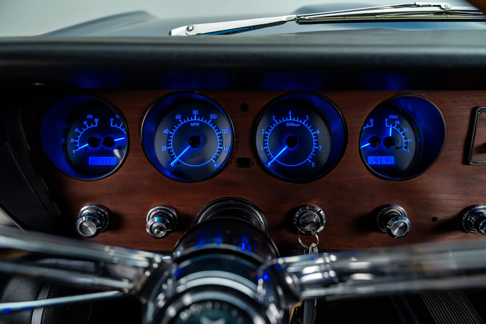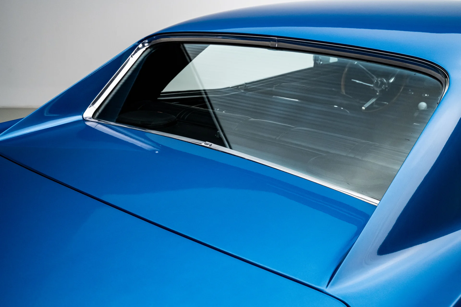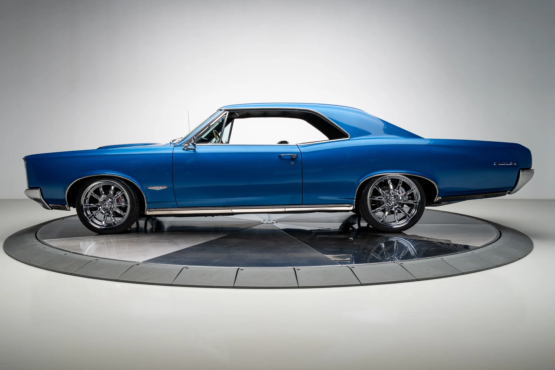 Com um acabamento em um tom azul vibrante que lembra bastante o Barrier Blue da Pontiac, a carroceria mantém suas linhas tradicionais e os faróis sobrepostos característicos, mas adiciona toques modernos sutis que a diferenciam. Os painéis são retos e impecáveis, com detalhes cromados no estilo original de fábrica, para-choques polidos e encaixes precisos em toda a carroceria. Os faróis de LED com anéis de LED iluminados em azul conferem à dianteira uma presença marcante quando as luzes de estacionamento estão acesas, enquanto as lanternas traseiras de LED completam a atualização na parte traseira. A postura é agressiva, porém elegante, alcançada pelas rodas cromadas Ridler 650 de 18 polegadas na dianteira e 20 polegadas na traseira, calçadas com pneus Nitto NT555 G2 que preenchem perfeitamente os arcos das rodas.