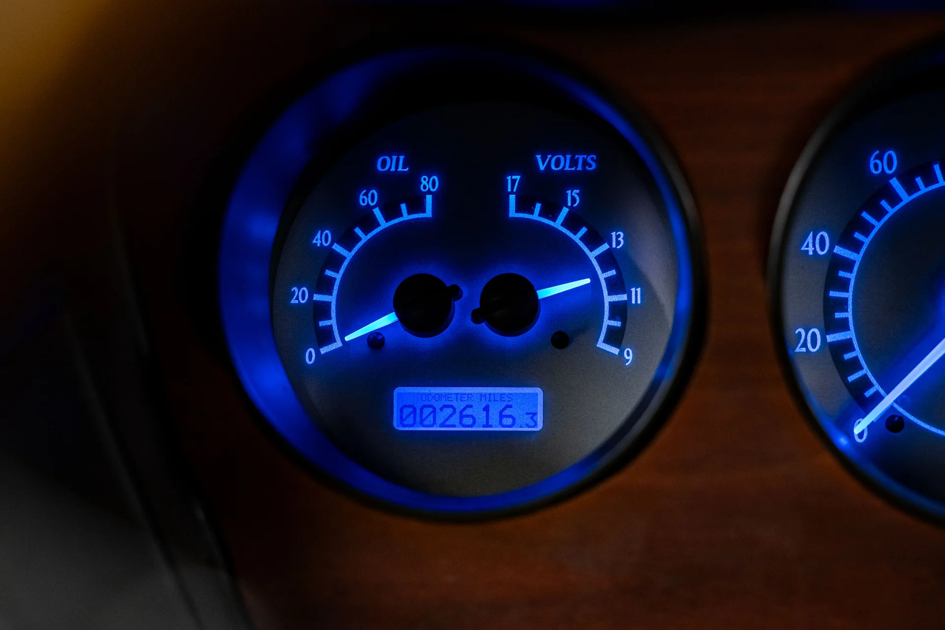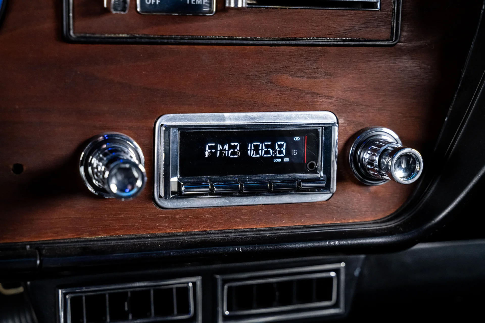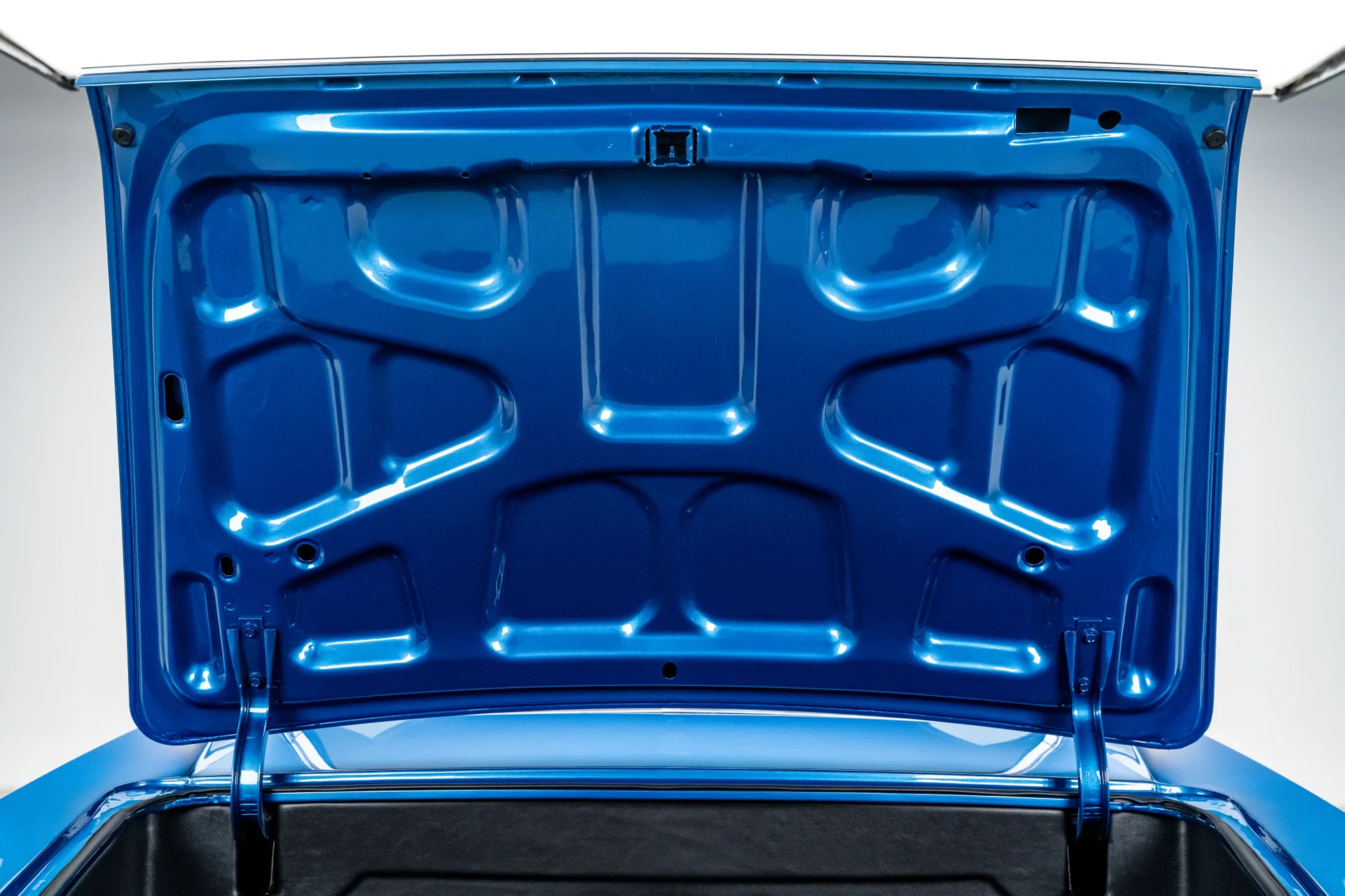 Com um acabamento em um tom azul vibrante que lembra bastante o Barrier Blue da Pontiac, a carroceria mantém suas linhas tradicionais e os faróis sobrepostos característicos, mas adiciona toques modernos sutis que a diferenciam. Os painéis são retos e impecáveis, com detalhes cromados no estilo original de fábrica, para-choques polidos e encaixes precisos em toda a carroceria. Os faróis de LED com anéis de LED iluminados em azul conferem à dianteira uma presença marcante quando as luzes de estacionamento estão acesas, enquanto as lanternas traseiras de LED completam a atualização na parte traseira. A postura é agressiva, porém elegante, alcançada pelas rodas cromadas Ridler 650 de 18 polegadas na dianteira e 20 polegadas na traseira, calçadas com pneus Nitto NT555 G2 que preenchem perfeitamente os arcos das rodas.