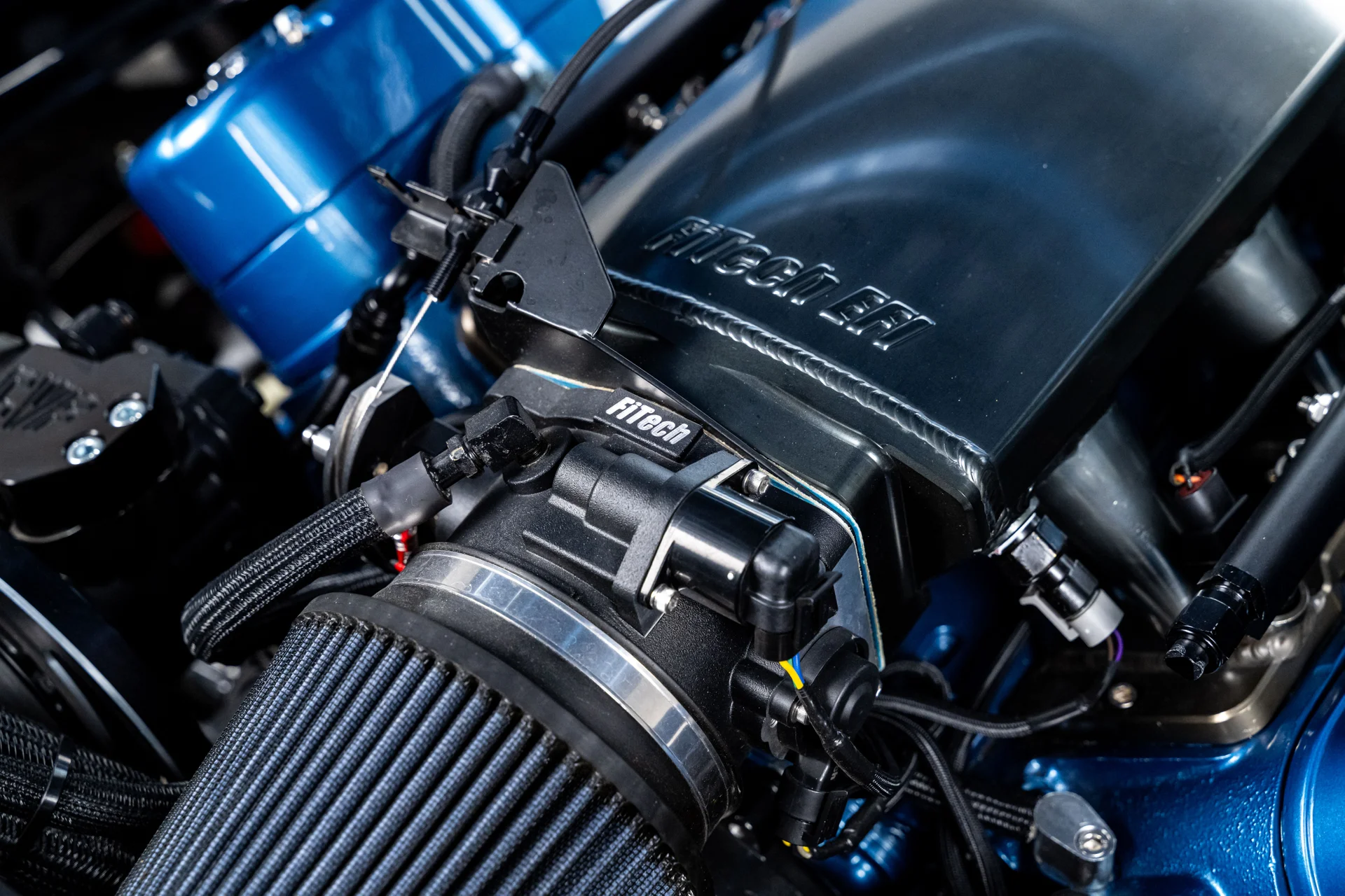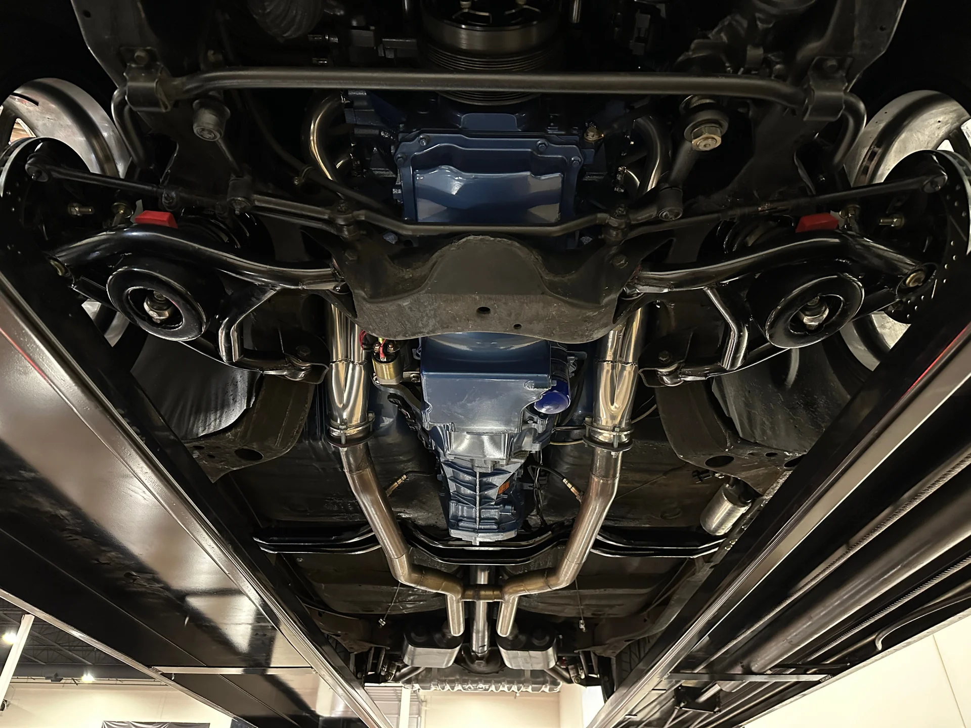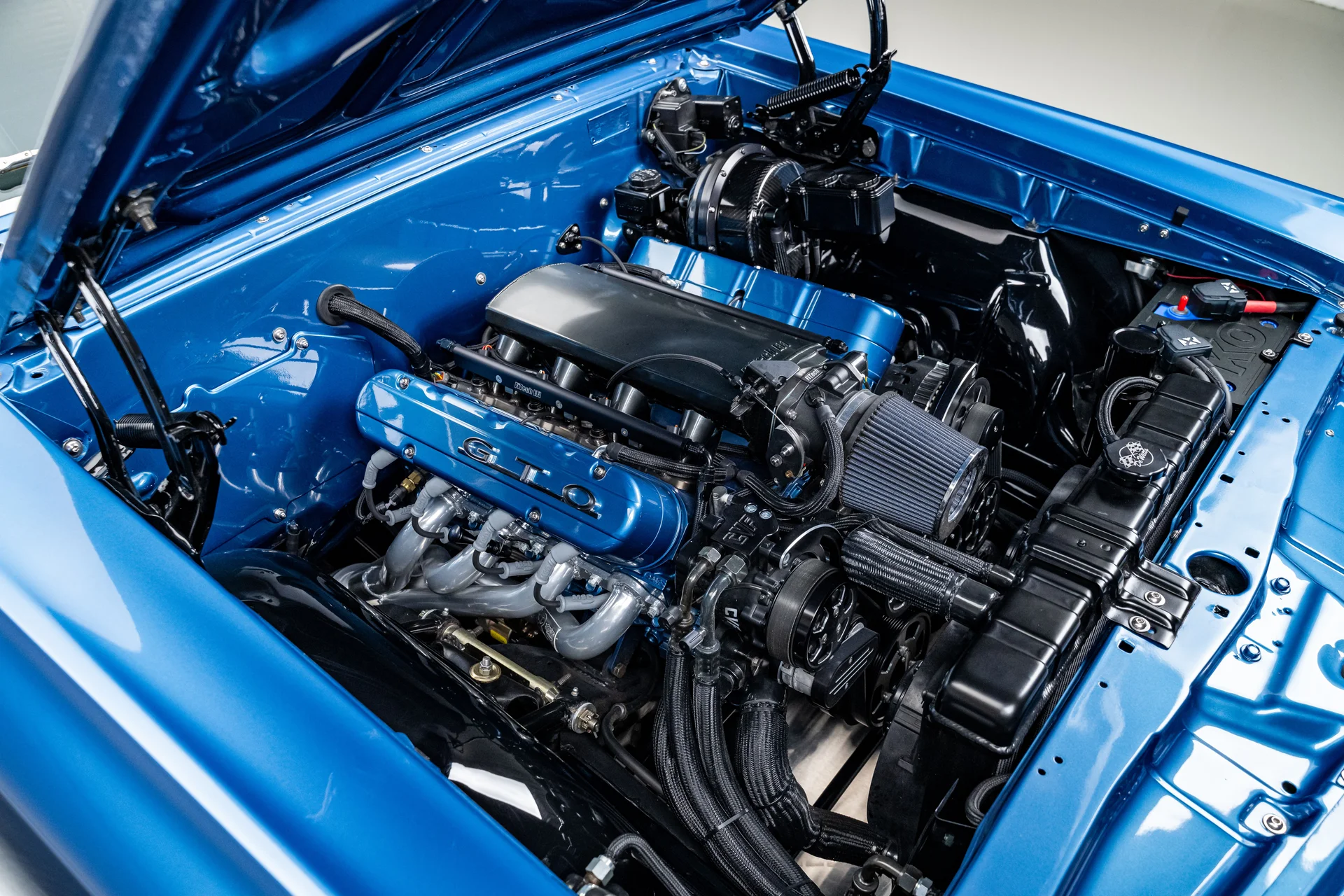 A potência vem de um motor LS de 6.0 litros da The Hot Rod Company. O bloco de ferro fundido é complementado por cabeçotes de alumínio com dutos usinados em CNC e um sistema de injeção eletrônica de combustível FiTech, com coletor de admissão e corpo de borboleta FiTech. O motor tem um atraente acabamento em tom azul que remete aos motores clássicos da Pontiac, contrastando com os componentes pretos, detalhes em alumínio billet e um servo-freio Carbon X de alta performance com revestimento em fibra de carbono e parafusos expostos. Um conjunto de acessórios CVF em alumínio billet completa o conjunto. A potência é transmitida por uma transmissão manual Tremec T56 de seis velocidades para um eixo traseiro de 10 parafusos com relação 3.23 e diferencial autoblocante Positraction. O chassi conta com braços de controle tubulares, amortecedores coilover Aldan e freios a disco nas quatro rodas MP com rotores perfurados e ranhurados, proporcionando dirigibilidade precisa e frenagem confiável, condizentes com sua potência. A direção hidráulica garante uma condução suave e confortável.