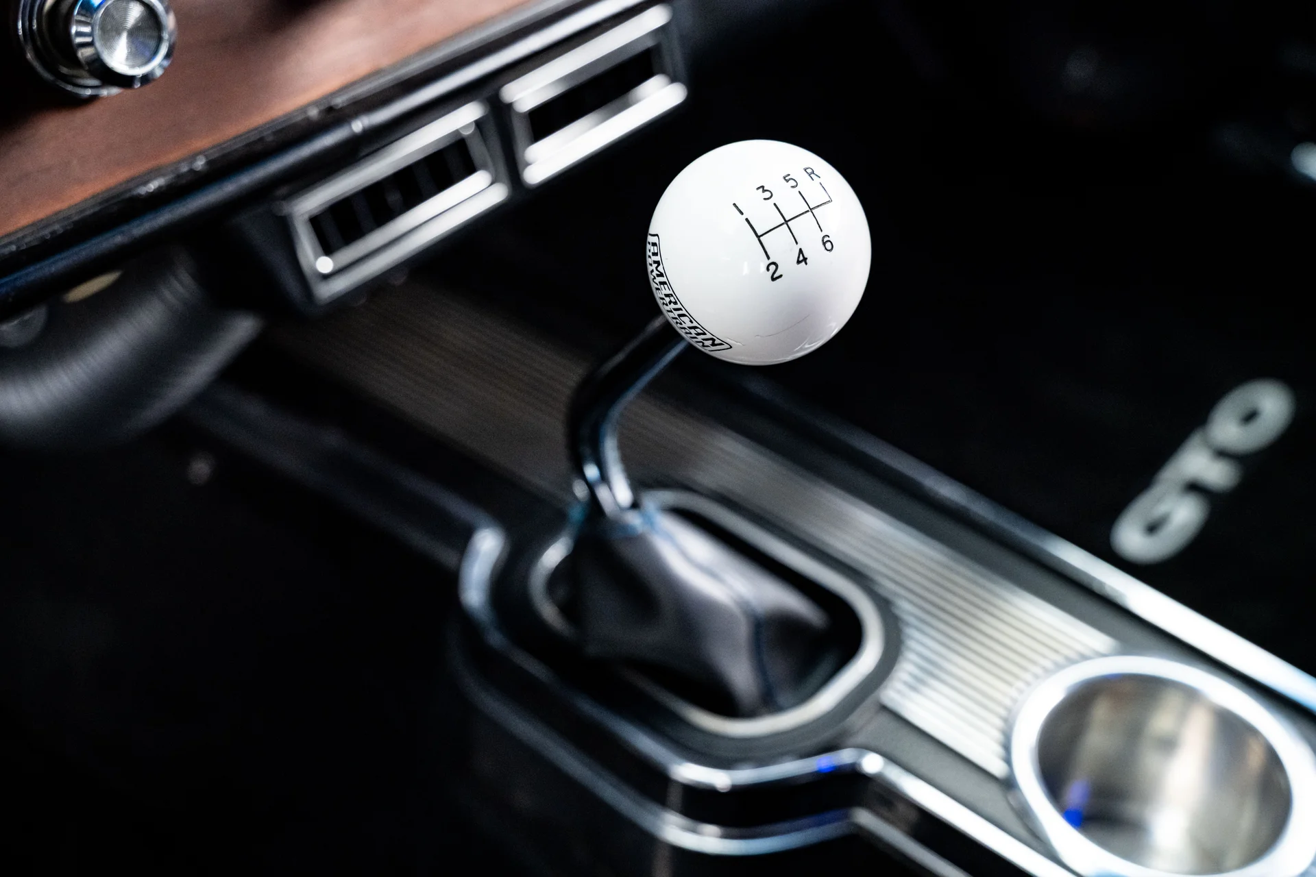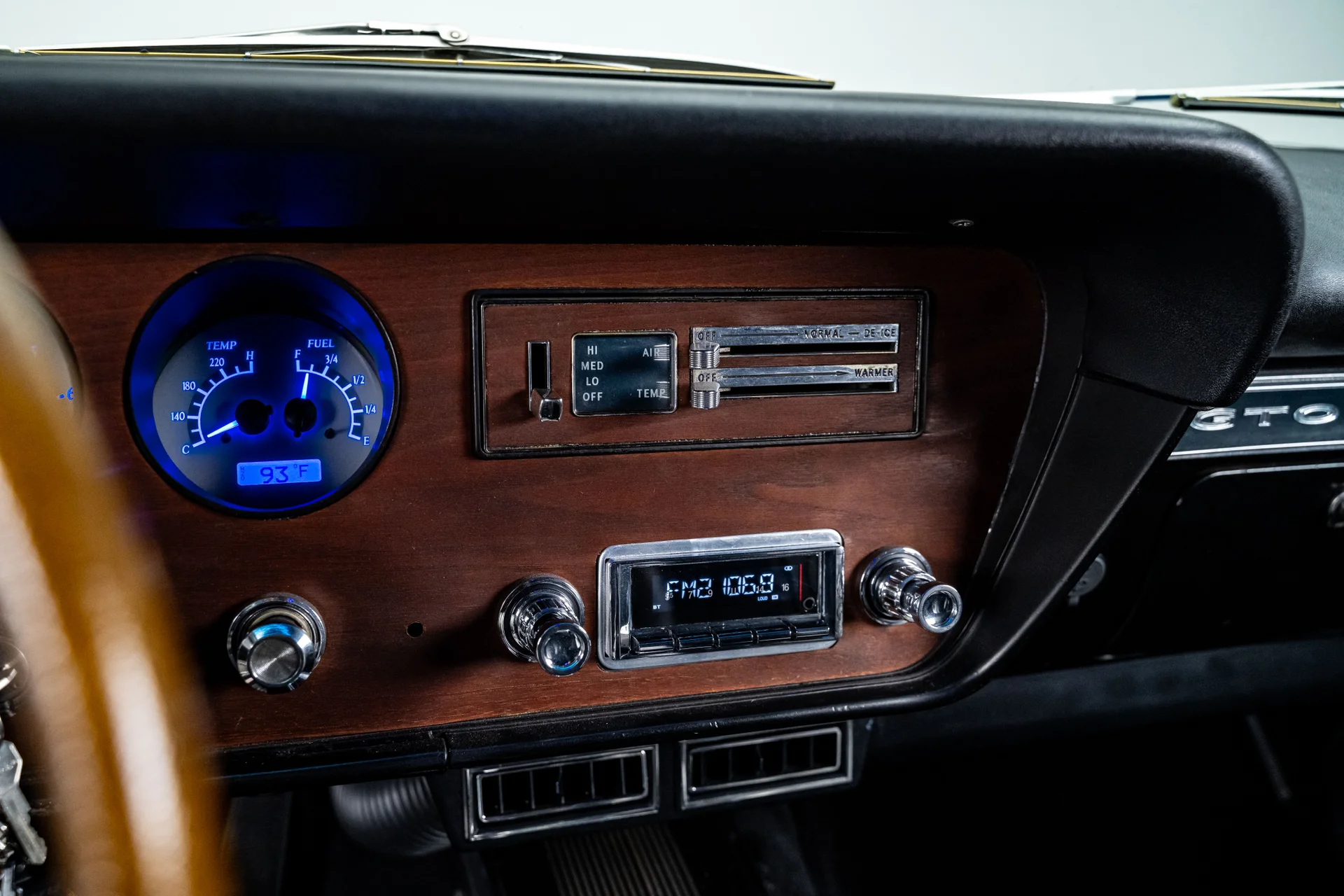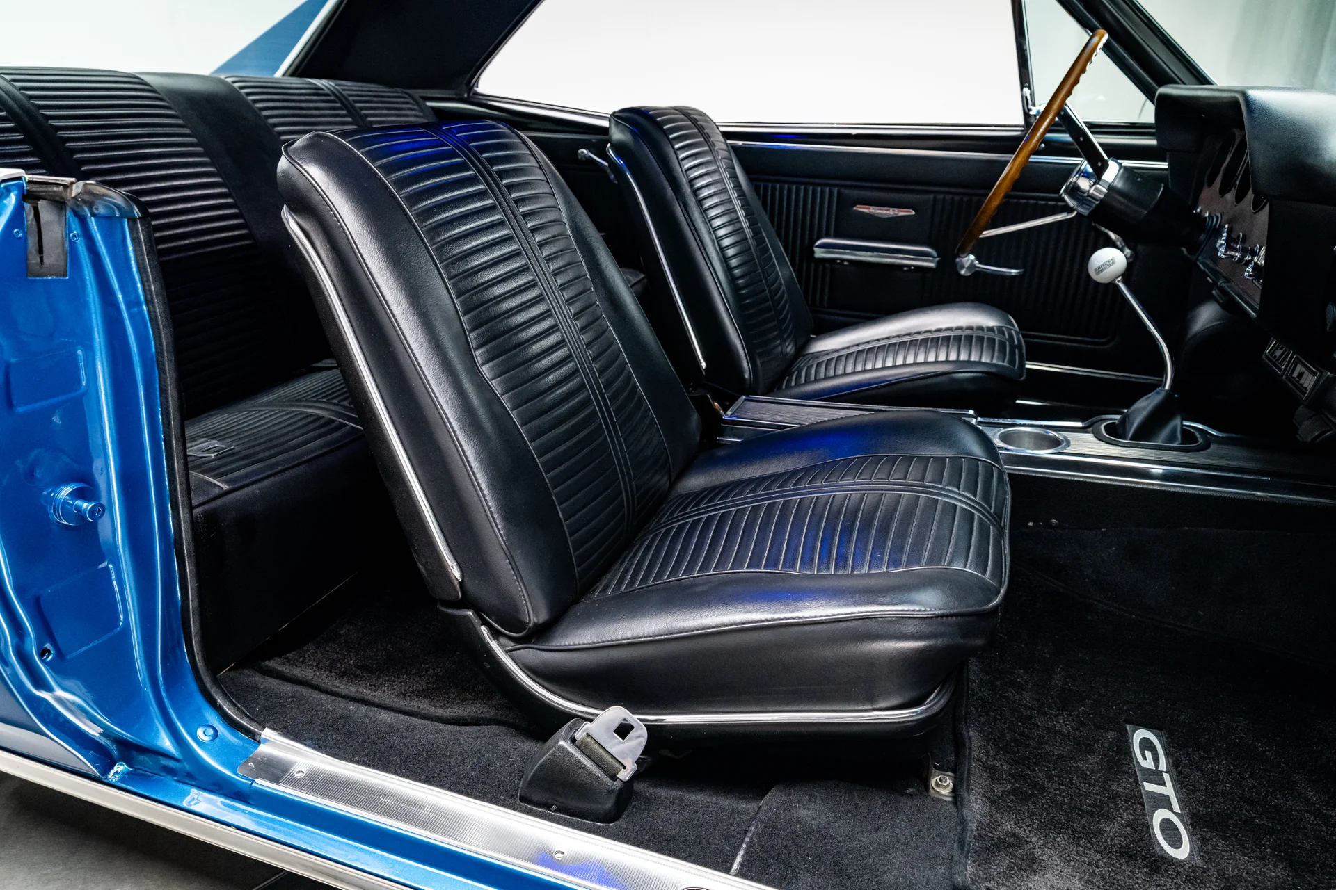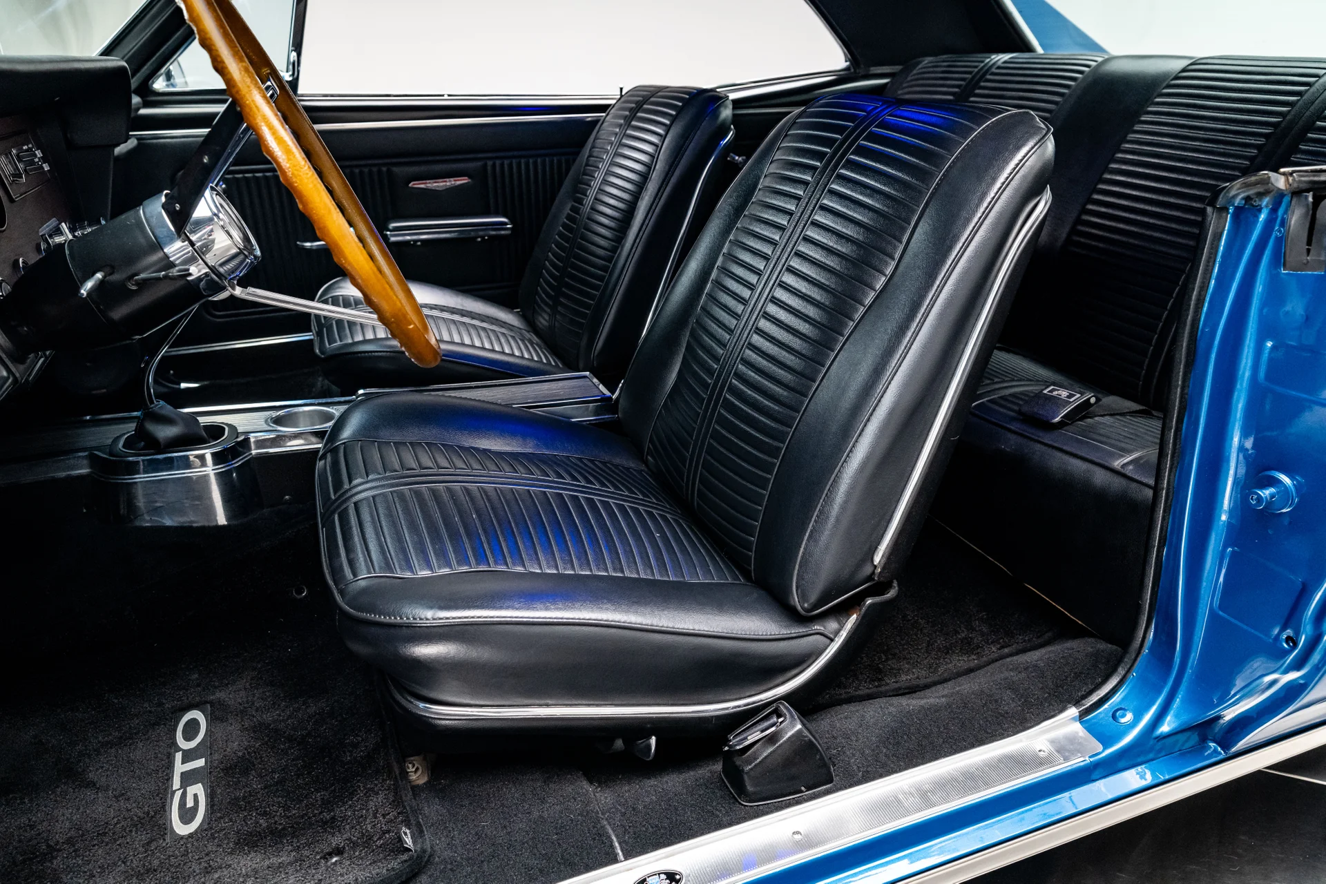 Por dentro, o carro encontra o equilíbrio perfeito entre o design clássico do GTO e o conforto moderno. O estofamento em vinil preto restaurado e os detalhes em aço inoxidável preservam a estética vintage, enquanto os mostradores digitais Dakota com iluminação azul e o câmbio com formato de bola de bilhar conferem um toque sutil de desempenho. Um sistema de som Custom Autosound com Bluetooth, um amplificador Kicker moderno e alto-falantes Kicker proporcionam um som atualizado, e a cabine permanece fresca graças ao ar-condicionado moderno. O volante de três raios com aro de madeira, os detalhes em aço inoxidável do console e as costuras impecáveis lembram que este ainda é um GTO.